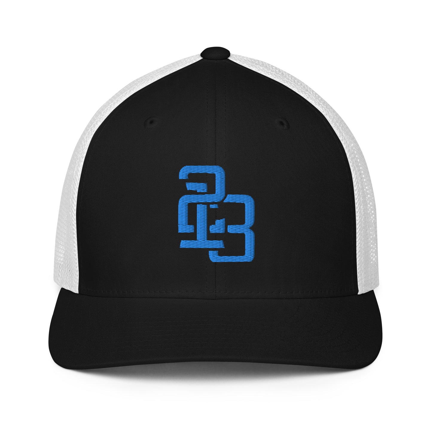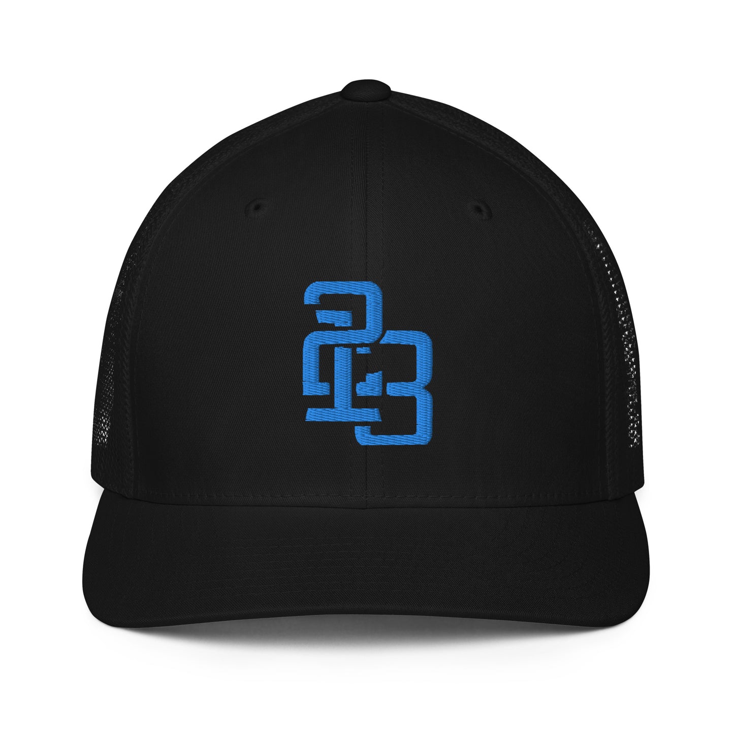"213" Closed-Back Trucker Cap | Flexfit 6511 | E Luna CLASSIC Solocrest 1 Aqua/Teal Thread Front Logo