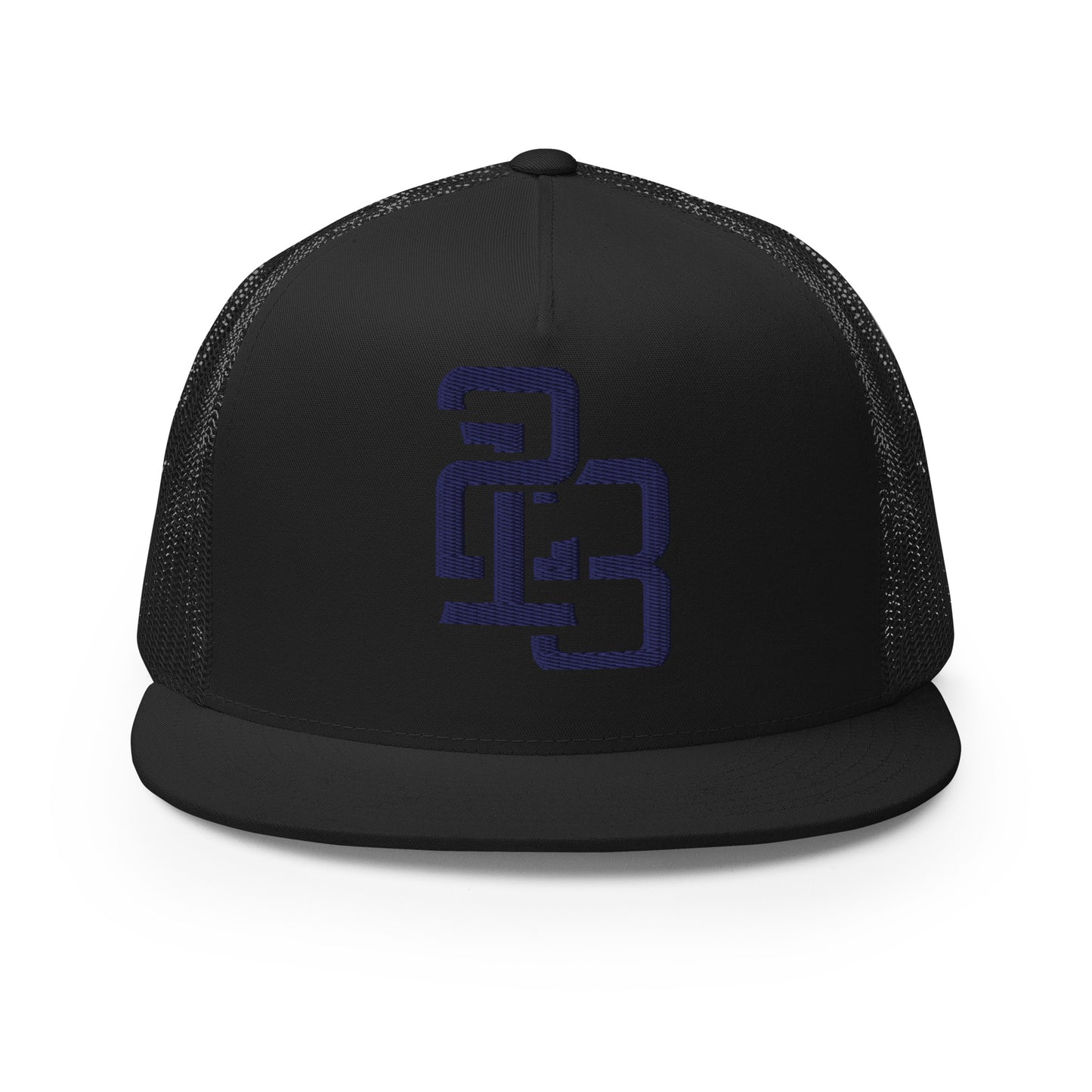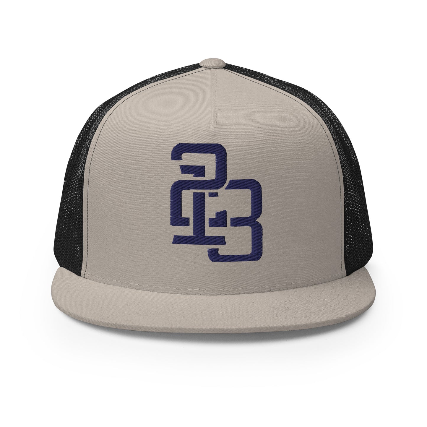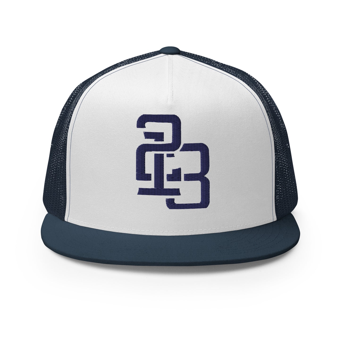 "213" Five Panel Trucker Cap | Yupoong 6006 | E Luna CLASSIC Solocrest 1 Navy Thread Front Logo