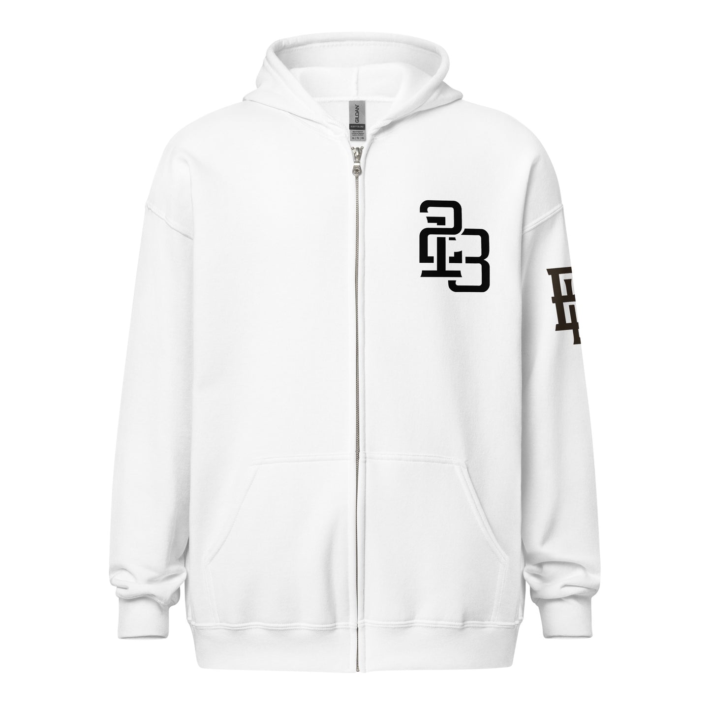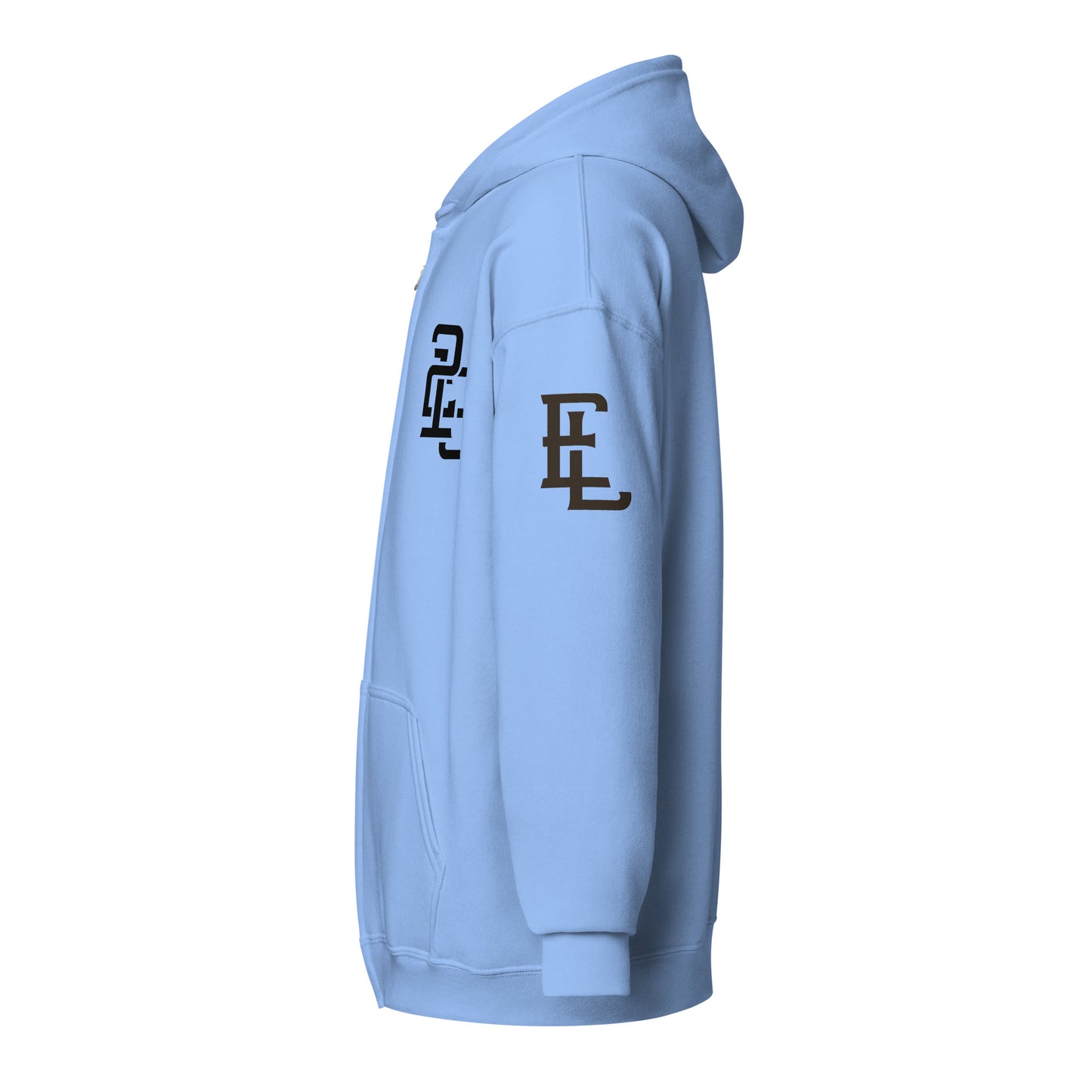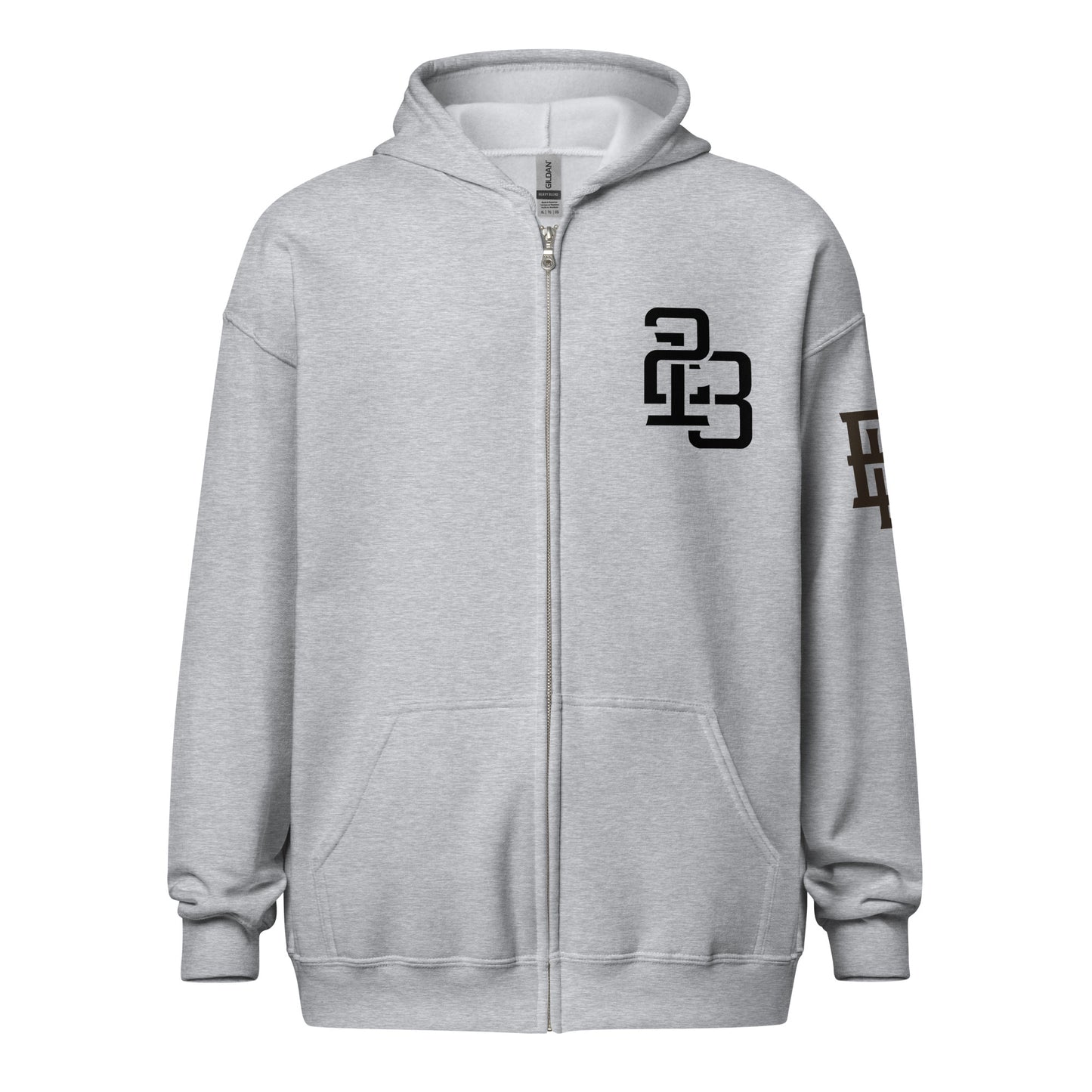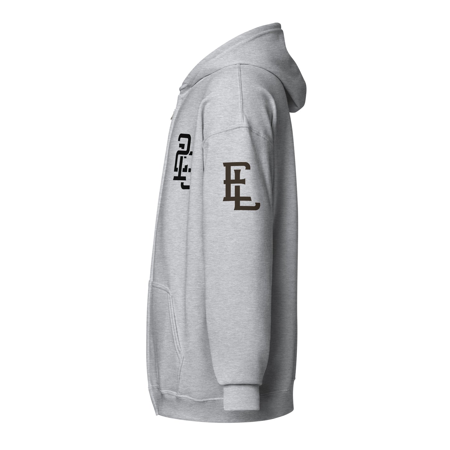 "213" Unisex Heavy Blend Zip Hoodie | Gildan 18600 | E Luna Brand ESSENCE Tricrest 3 Black Logos: Front Upper Left, Left Arm & Outside Back Label