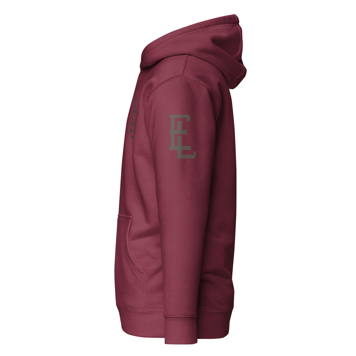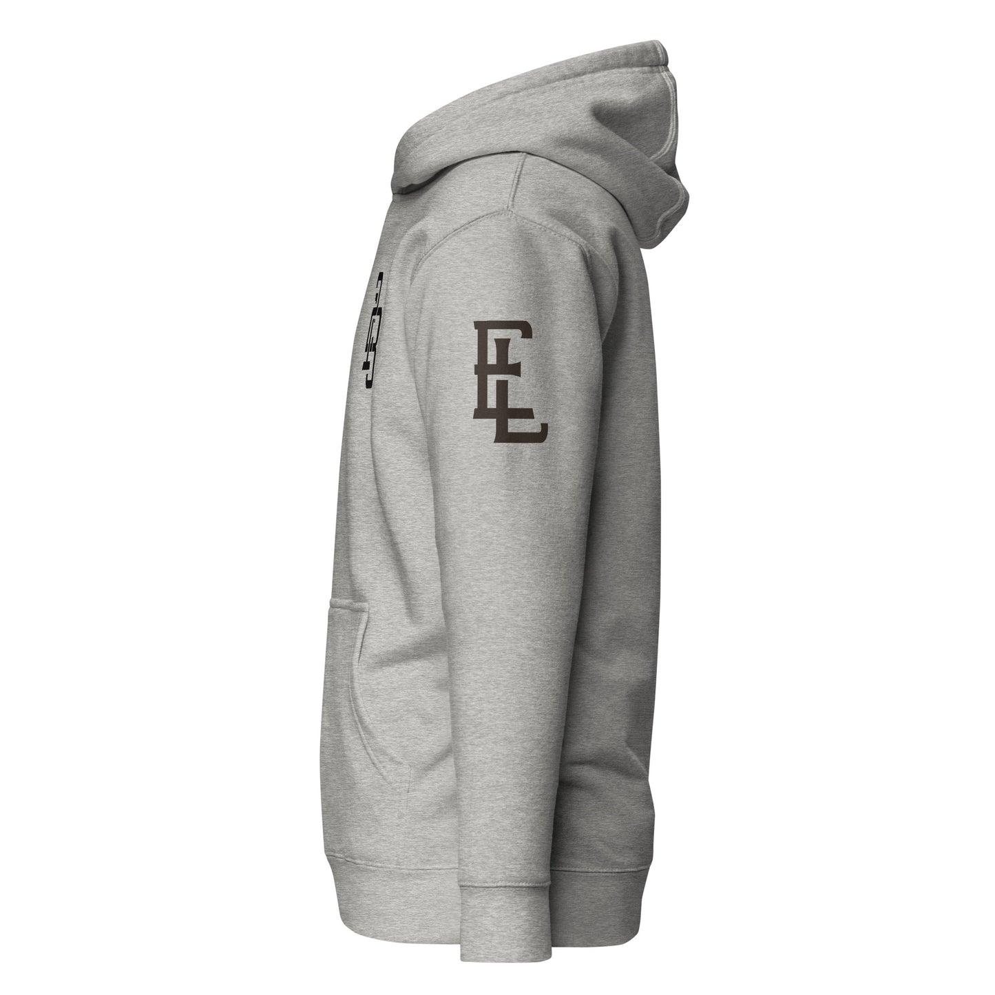 "213" Unisex Premium Hoodie | Cotton Heritage M2580 | E Luna Brand ESSENCE Tricrest 3 Black Logos: Front Upper Left, Left Arm & Outside Back Label
