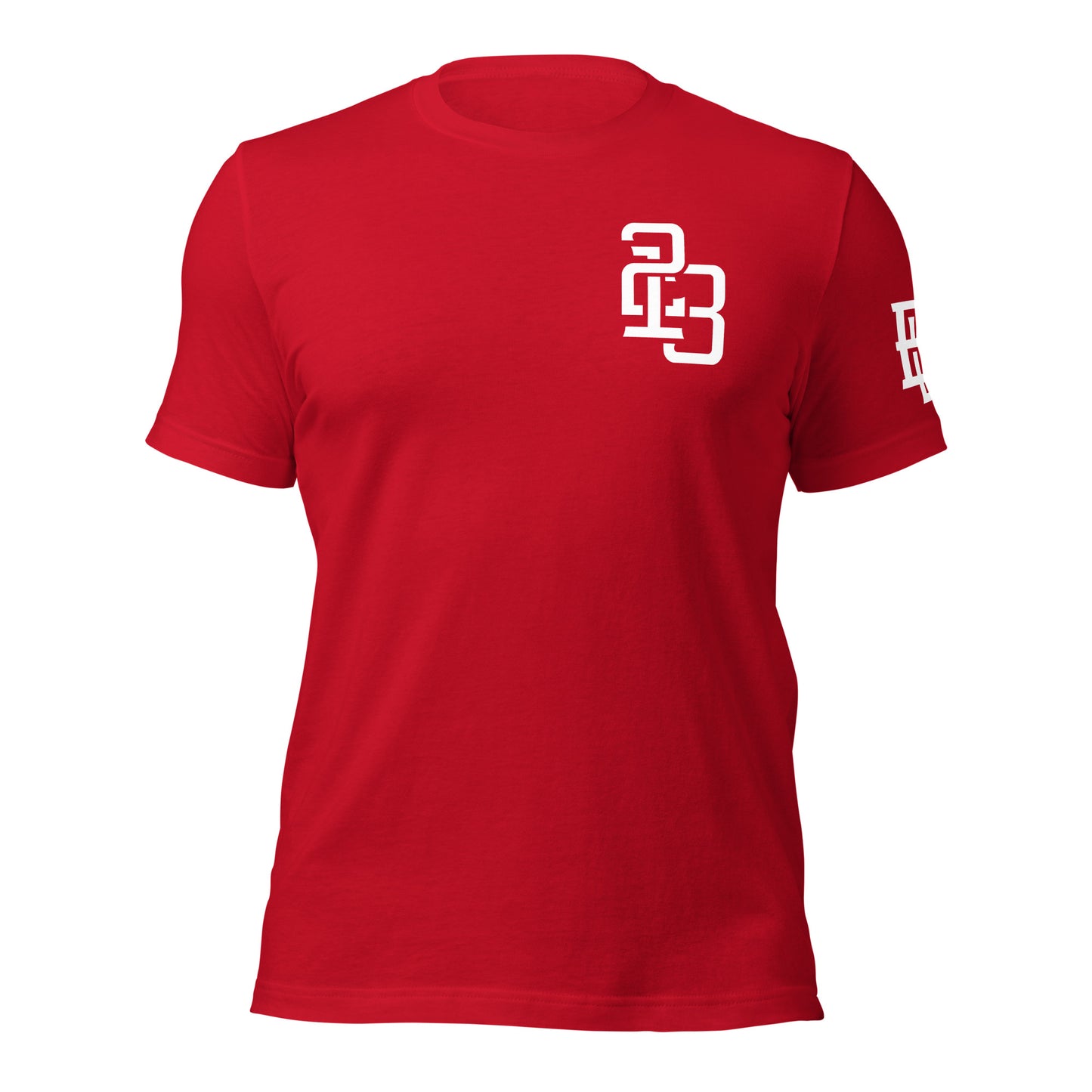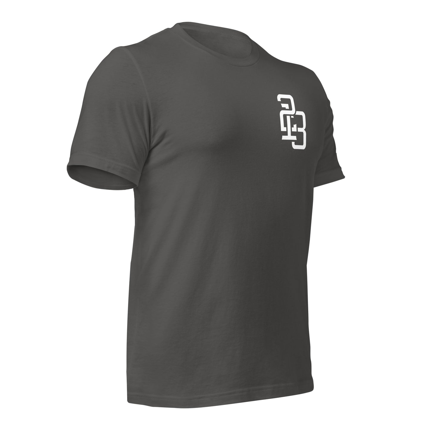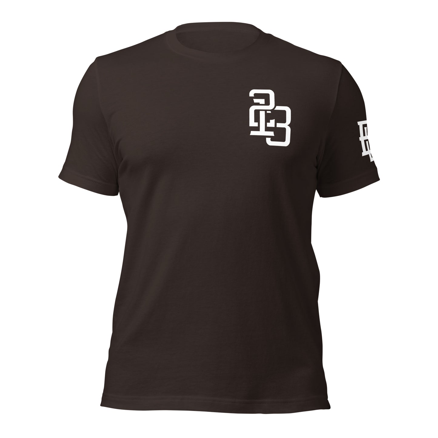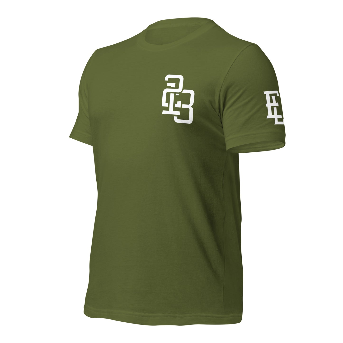 "213" Unisex Staple T-Shirt | Bella + Canvas 3001 | E Luna Brand ELEMENT Tricrest 3 White Logos: Front Upper Left, Left Arm & Back (Large)
