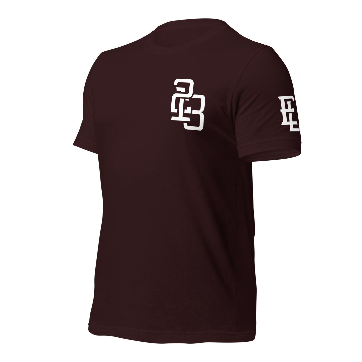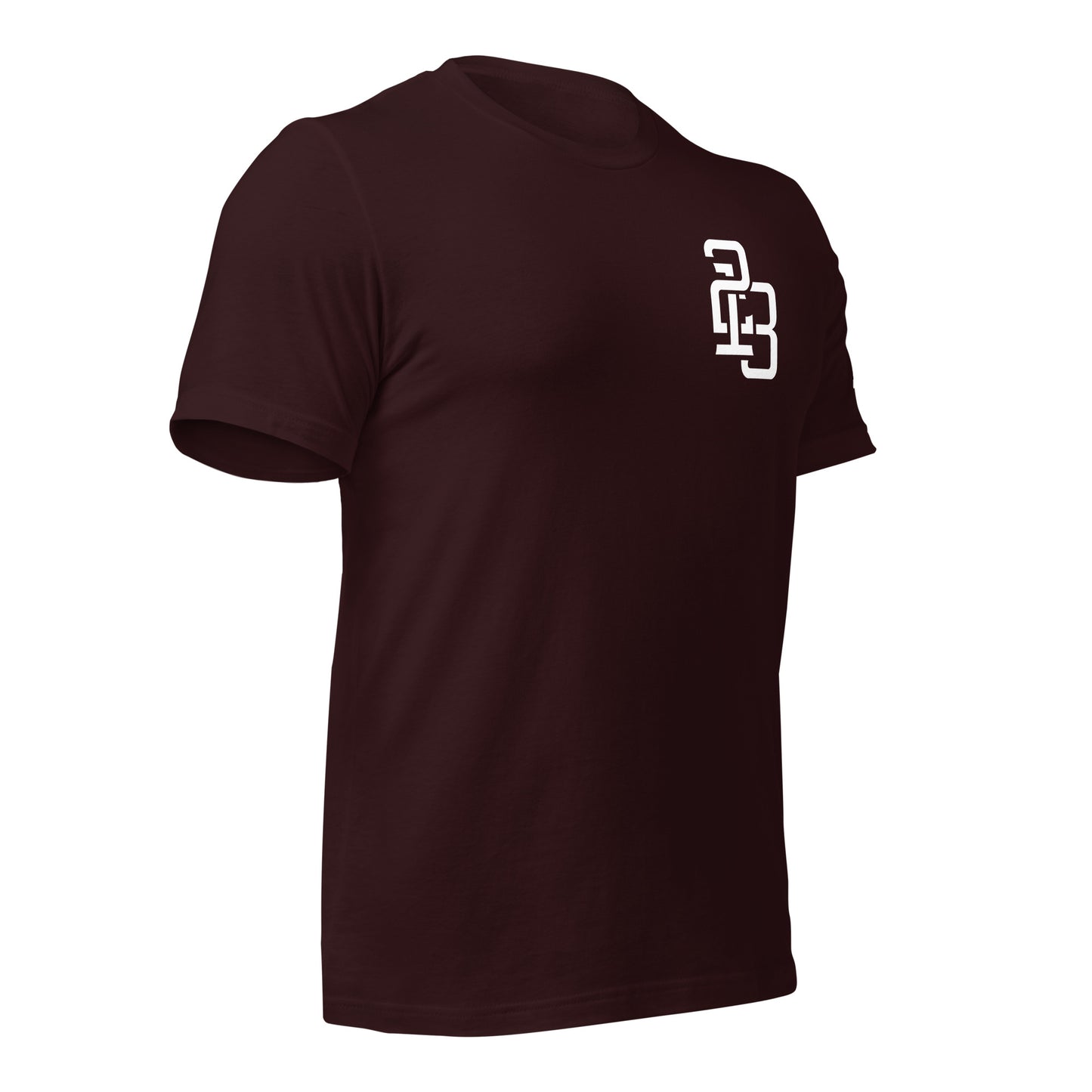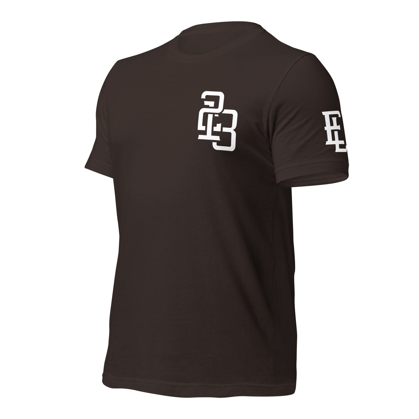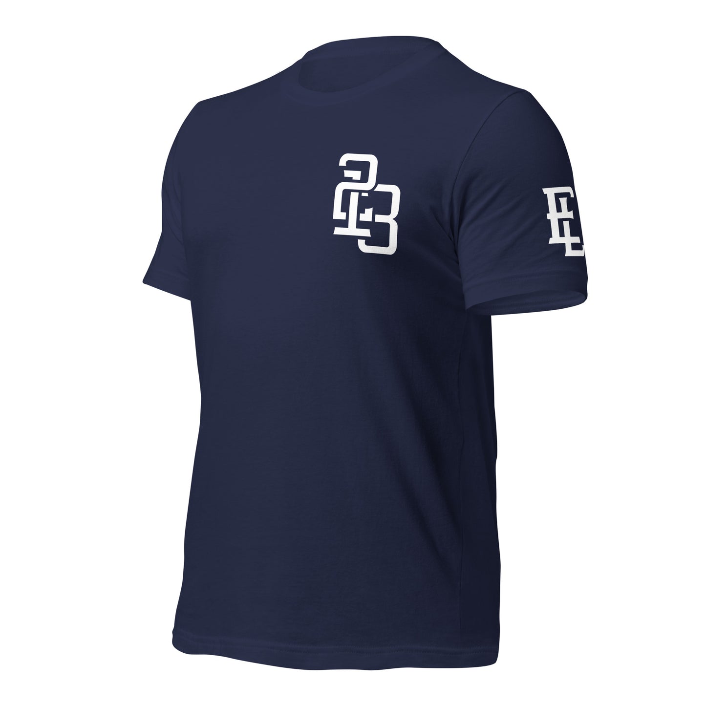 "213" Unisex Staple T-Shirt | Bella + Canvas 3001 | E Luna Brand ELEMENT Tricrest 3 White Logos: Front Upper Left, Left Arm & Back (Large)