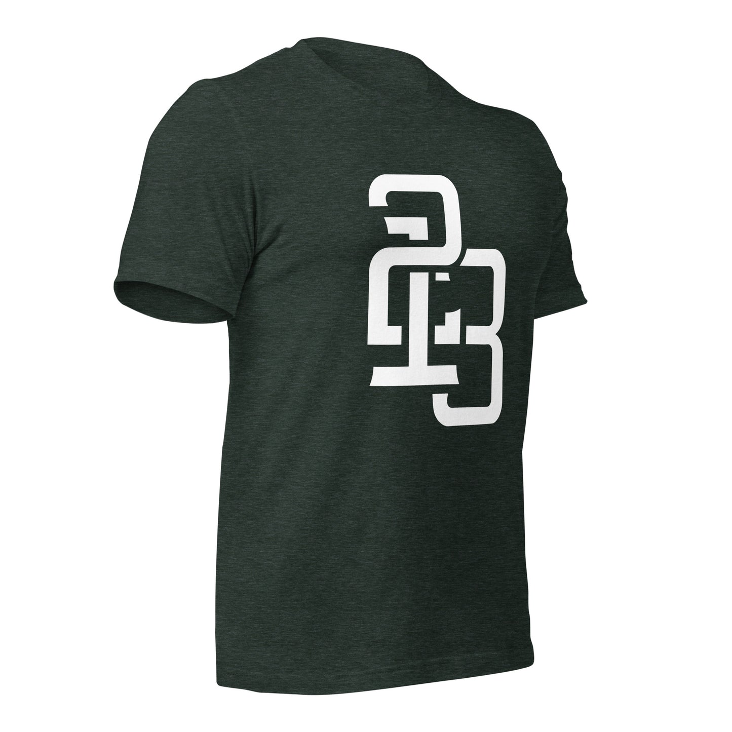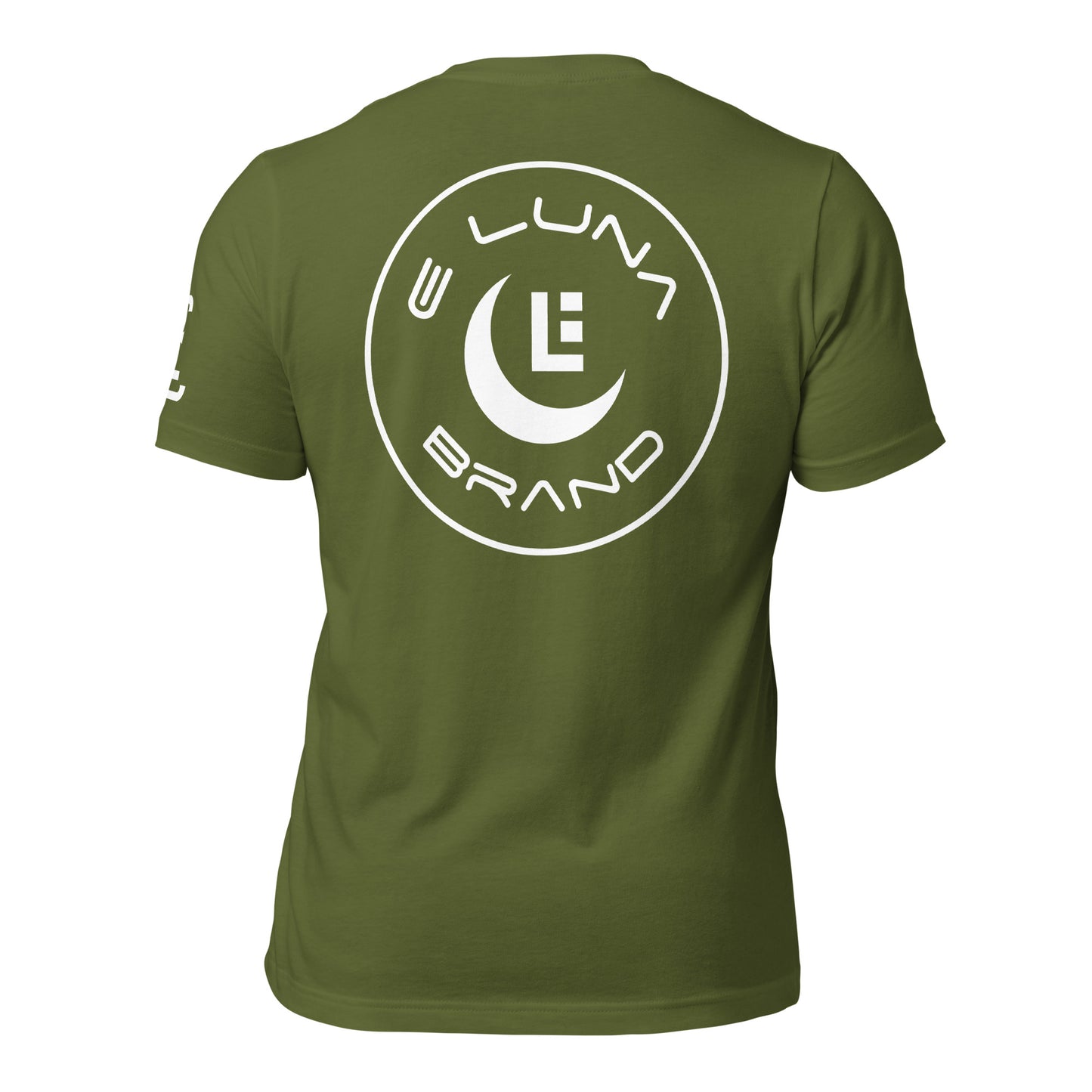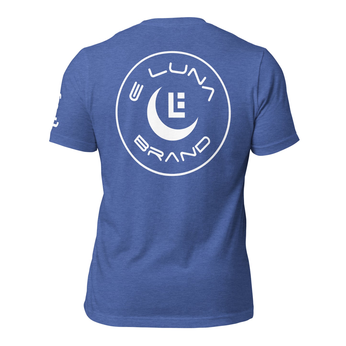"213" Unisex Staple T-Shirt | Bella + Canvas 3001 | E Luna Brand ELEMENT Tricrest 3 White Logos: Front Center (Large), Left Arm & Back (Large)