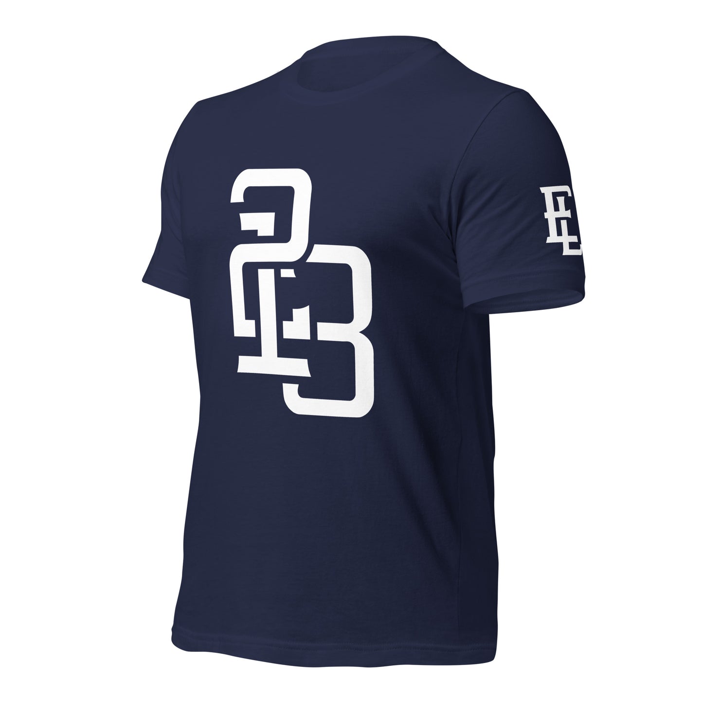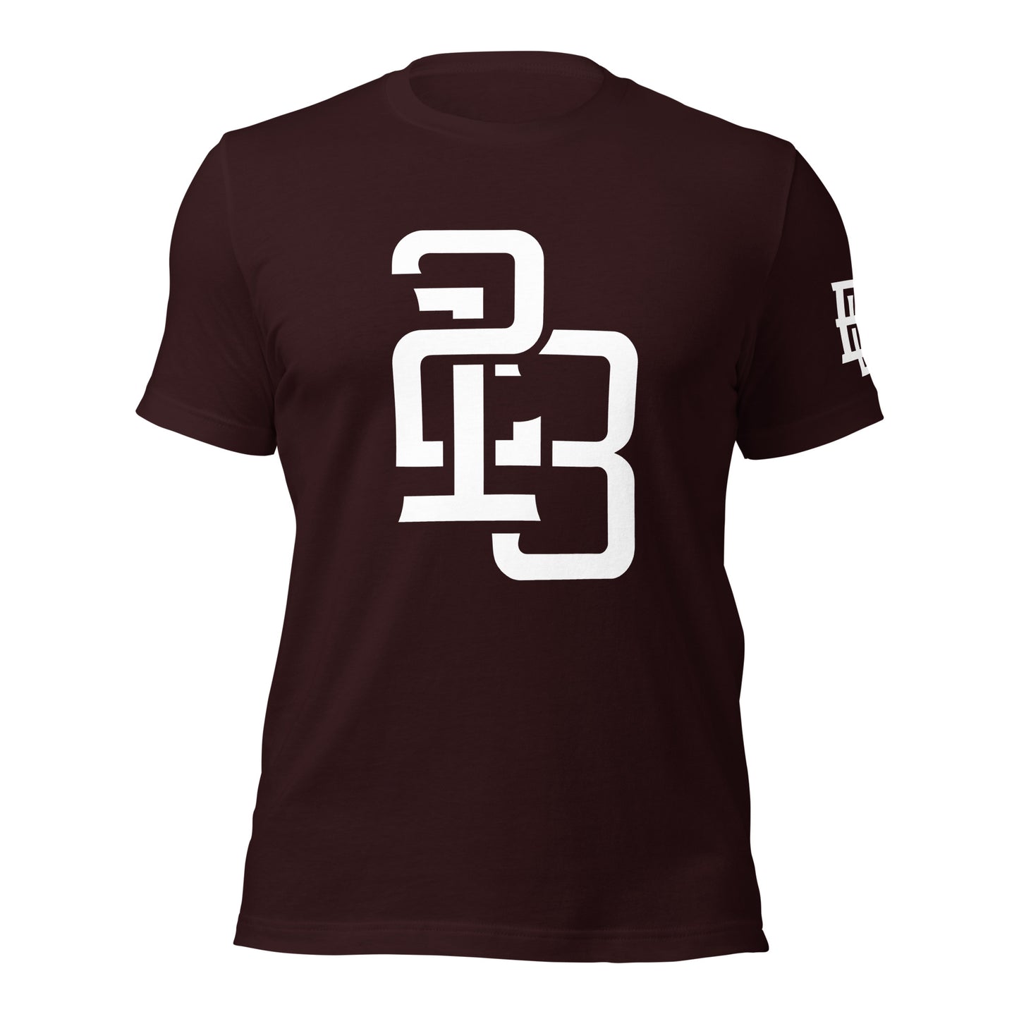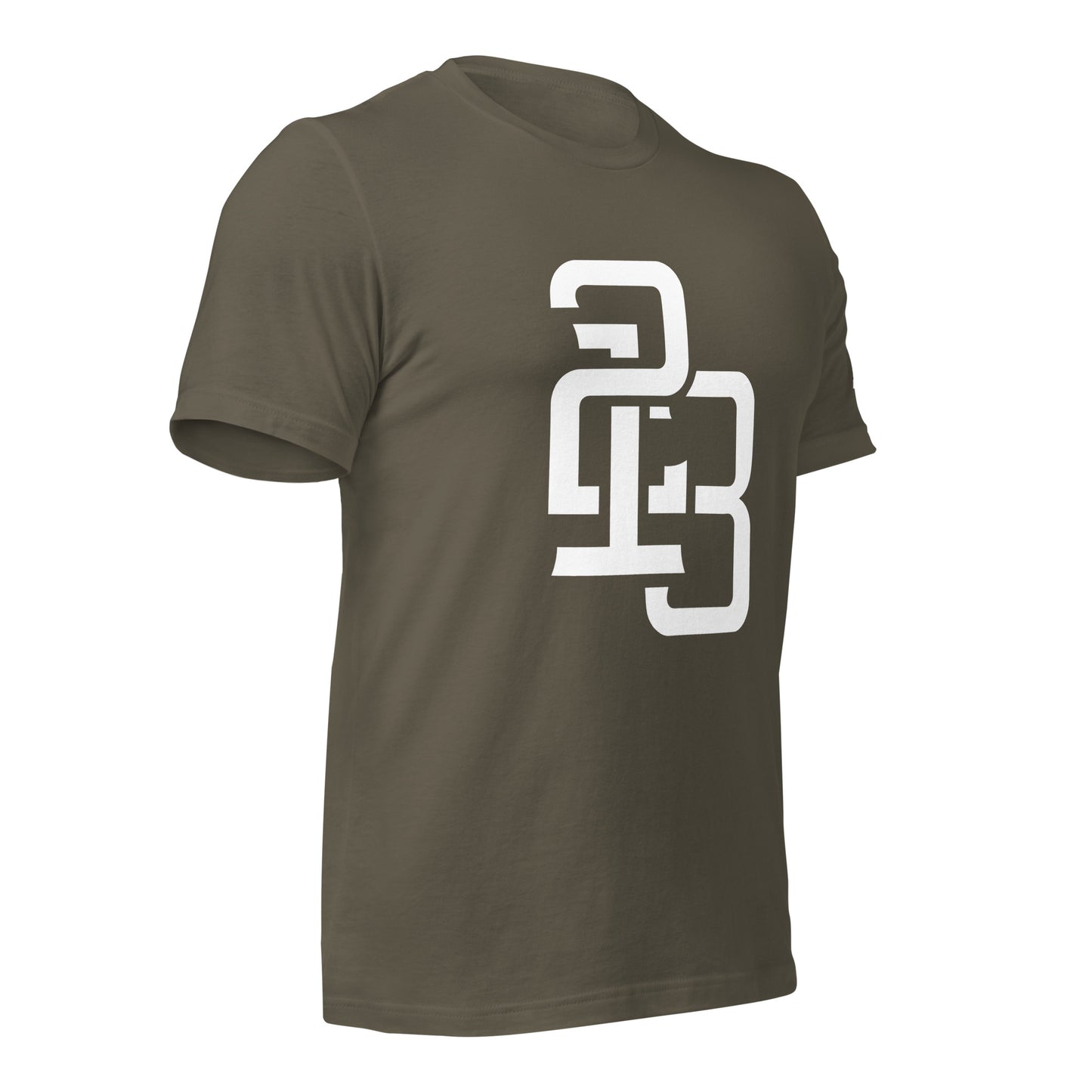 "213" Unisex Staple T-Shirt | Bella + Canvas 3001 | E Luna Brand ELEMENT Tricrest 3 White Logos: Front Center (Large), Left Arm & Back (Large)