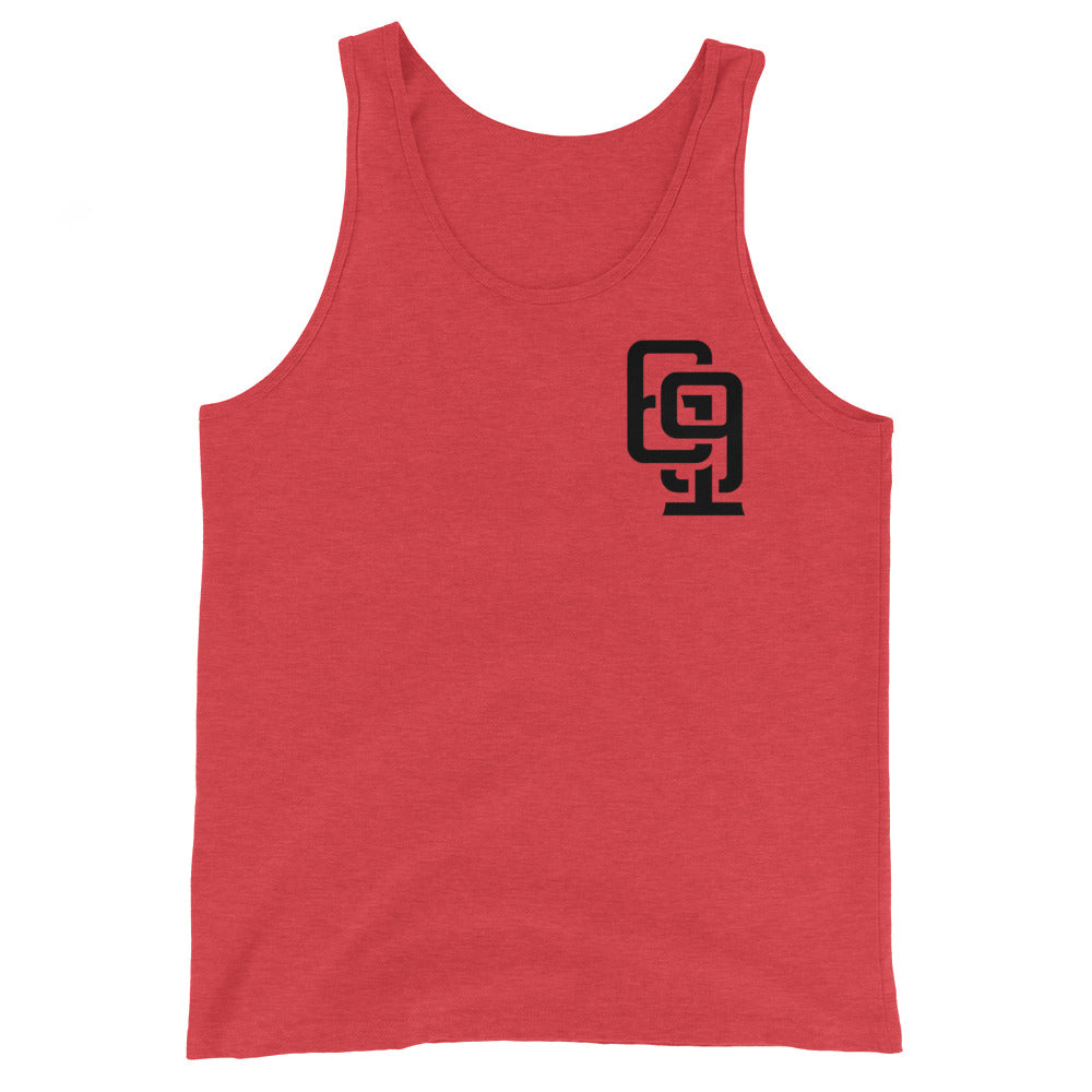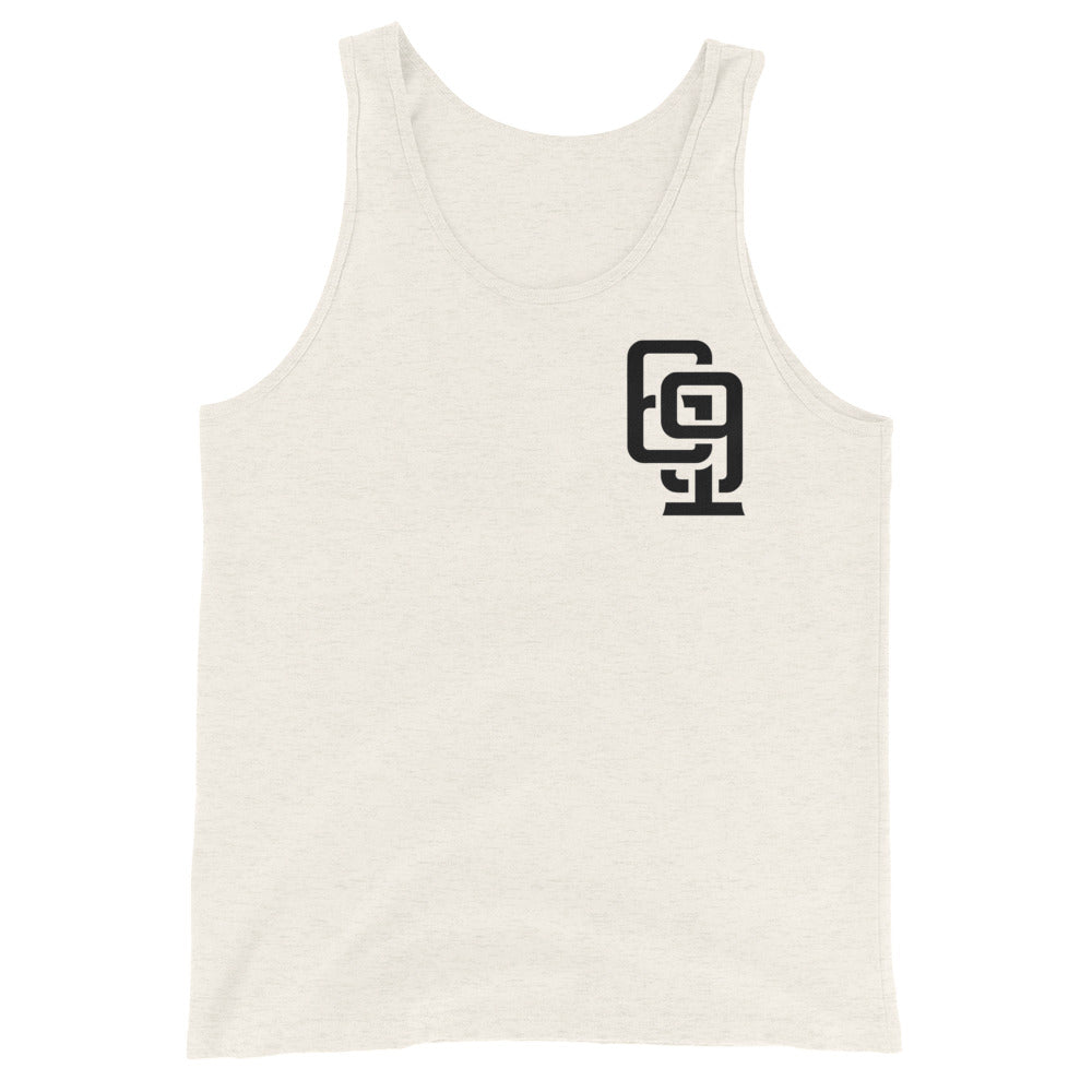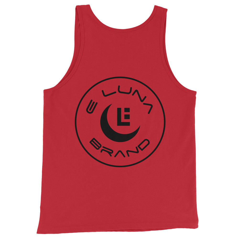 "619" Men’s Staple Tank Top | Bella + Canvas 3480 | E Luna Brand CHOICE Duocrest 2 Black Logos: Front Upper Left & Back (Large)