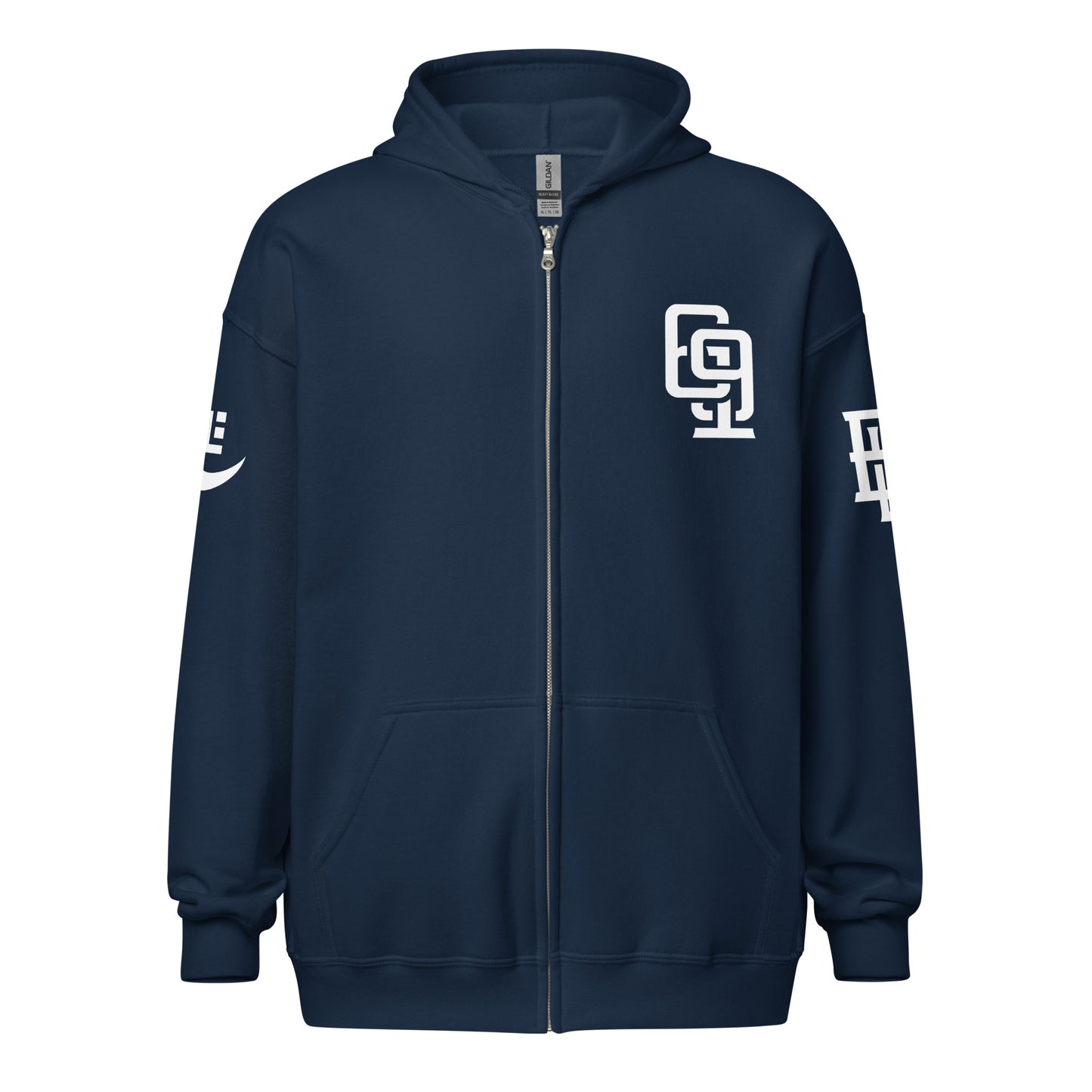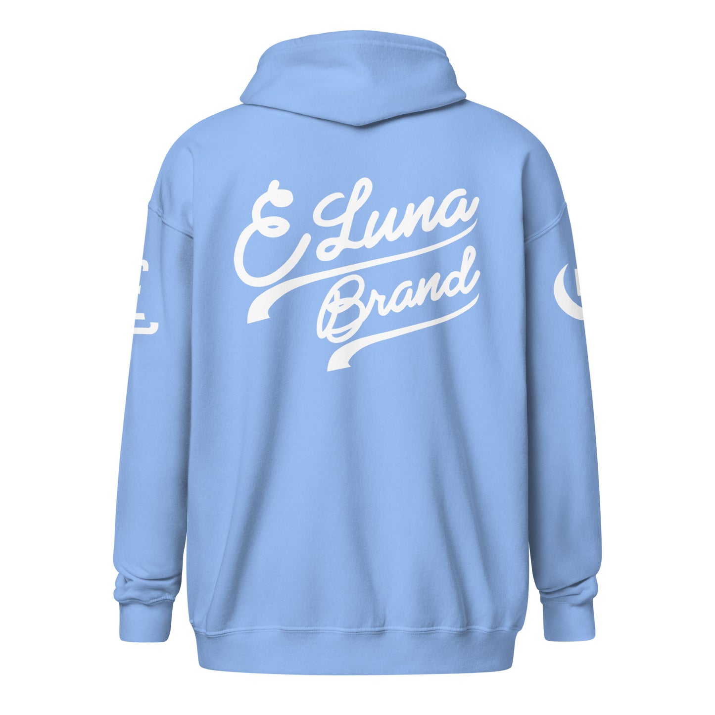 "619" Unisex Heavy Blend Zip Hoodie | Gildan 18600 | E Luna Brand LEGACY Quadcrest 4 White Logos: Front Upper Left, Left/Right Arm & Back Signature (Large)
