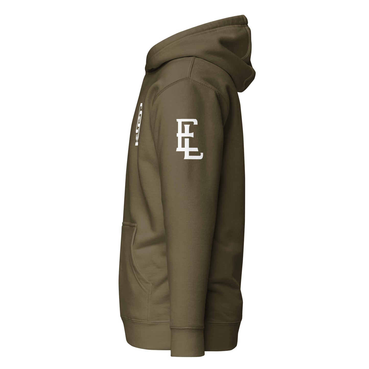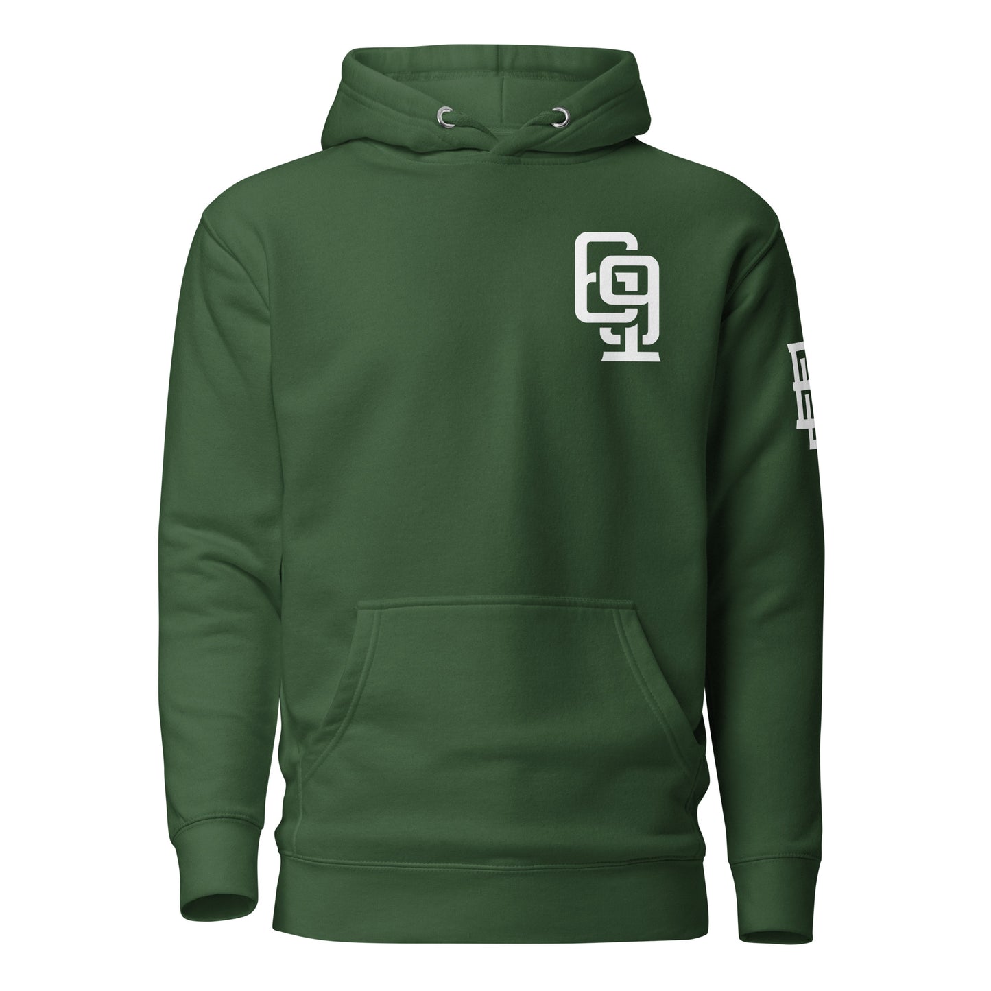 "619" Unisex Premium Hoodie | Cotton Heritage M2580 | E Luna Brand ESSENCE Tricrest 3 White Logos: Front Upper Left, Left Arm & Outside Back Label