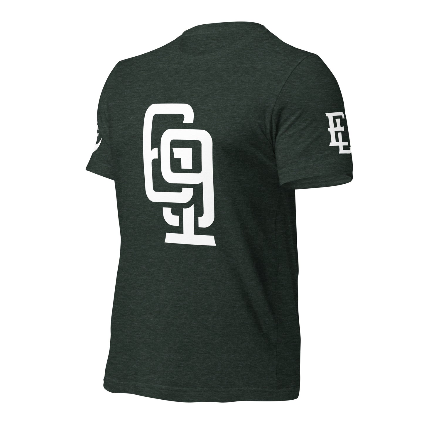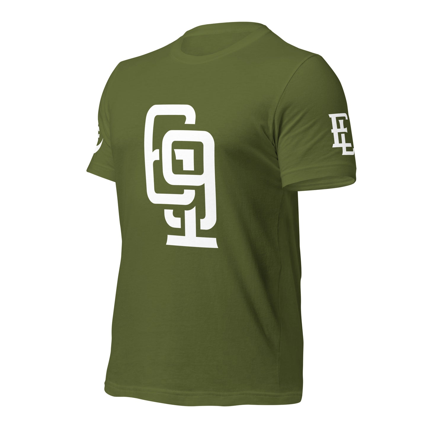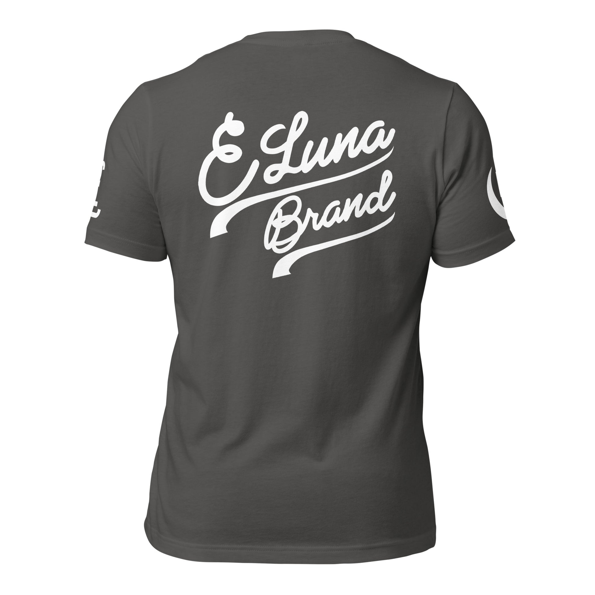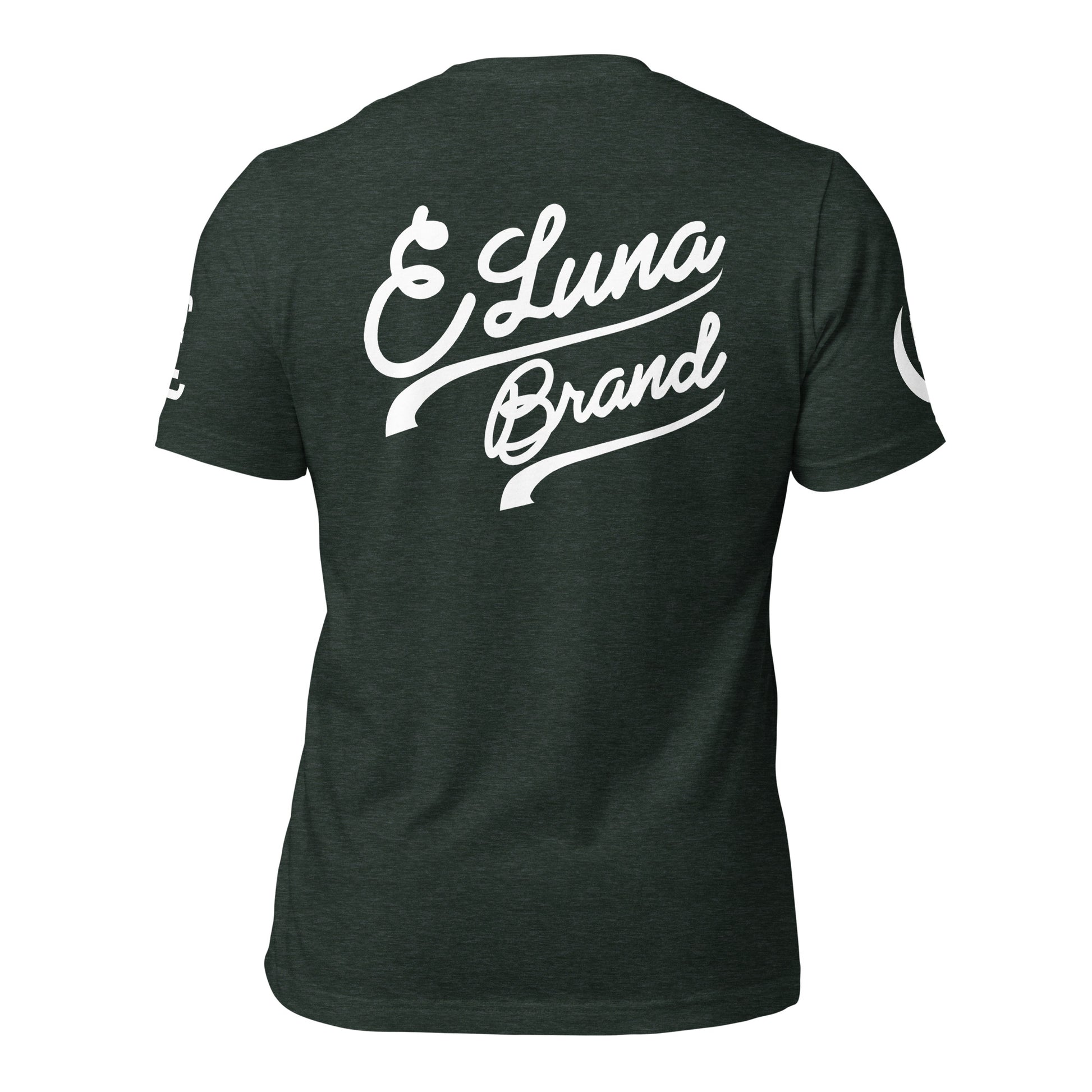 "619" Unisex Staple T-Shirt | Bella + Canvas 3001 | E Luna Brand LEGACY Quadcrest 4 White Logos: Front Center (Large), Left/Right Arm & Back Signature (Large)