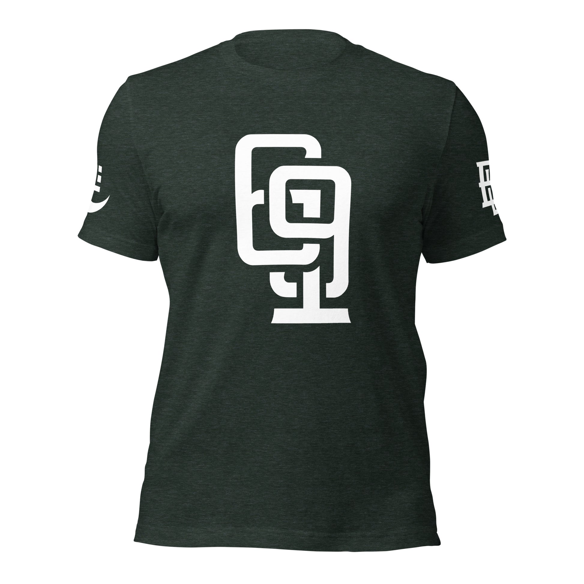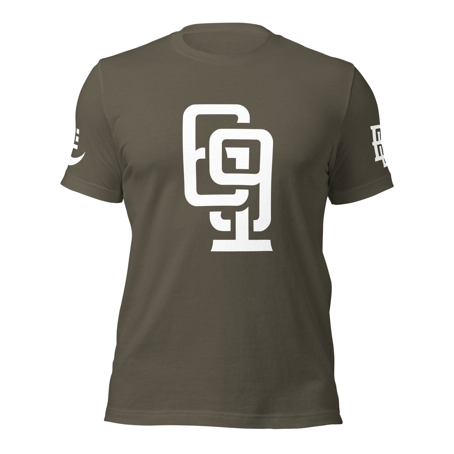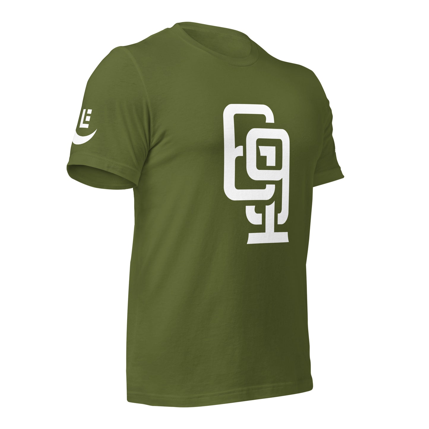 "619" Unisex Staple T-Shirt | Bella + Canvas 3001 | E Luna Brand LEGACY Quadcrest 4 White Logos: Front Center (Large), Left/Right Arm & Back Signature (Large)