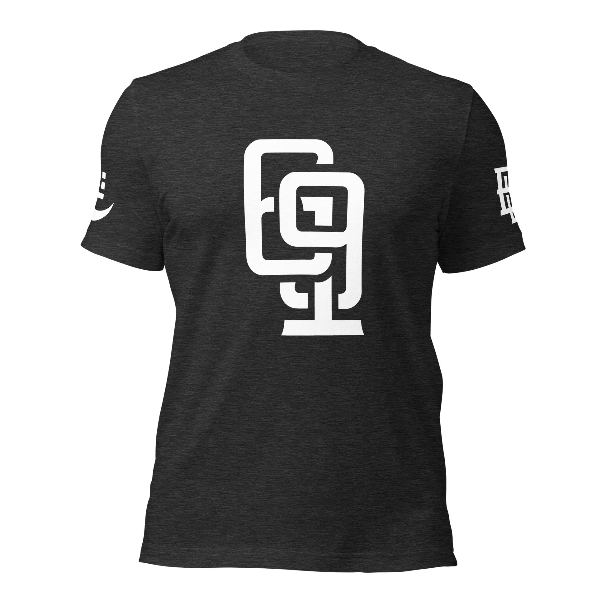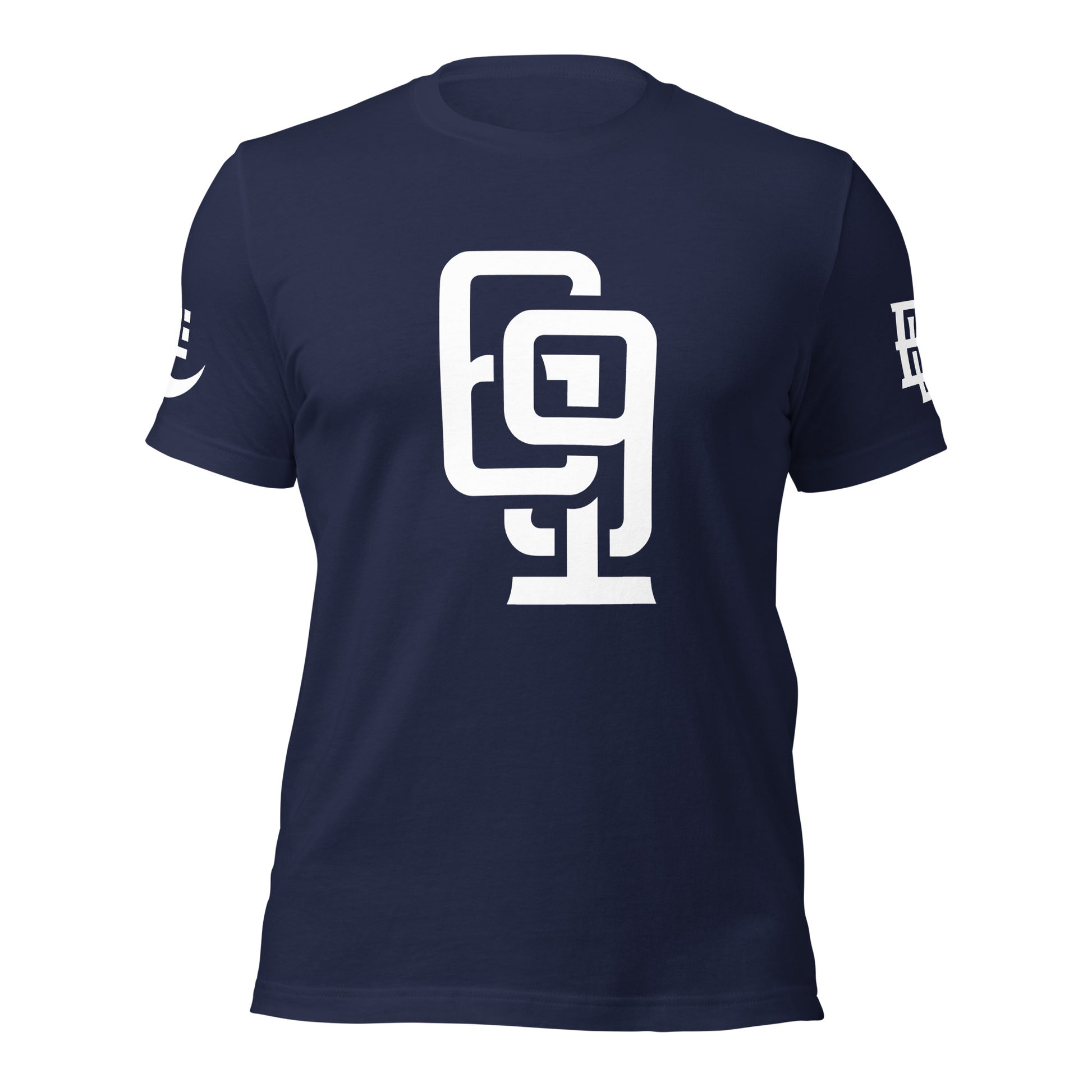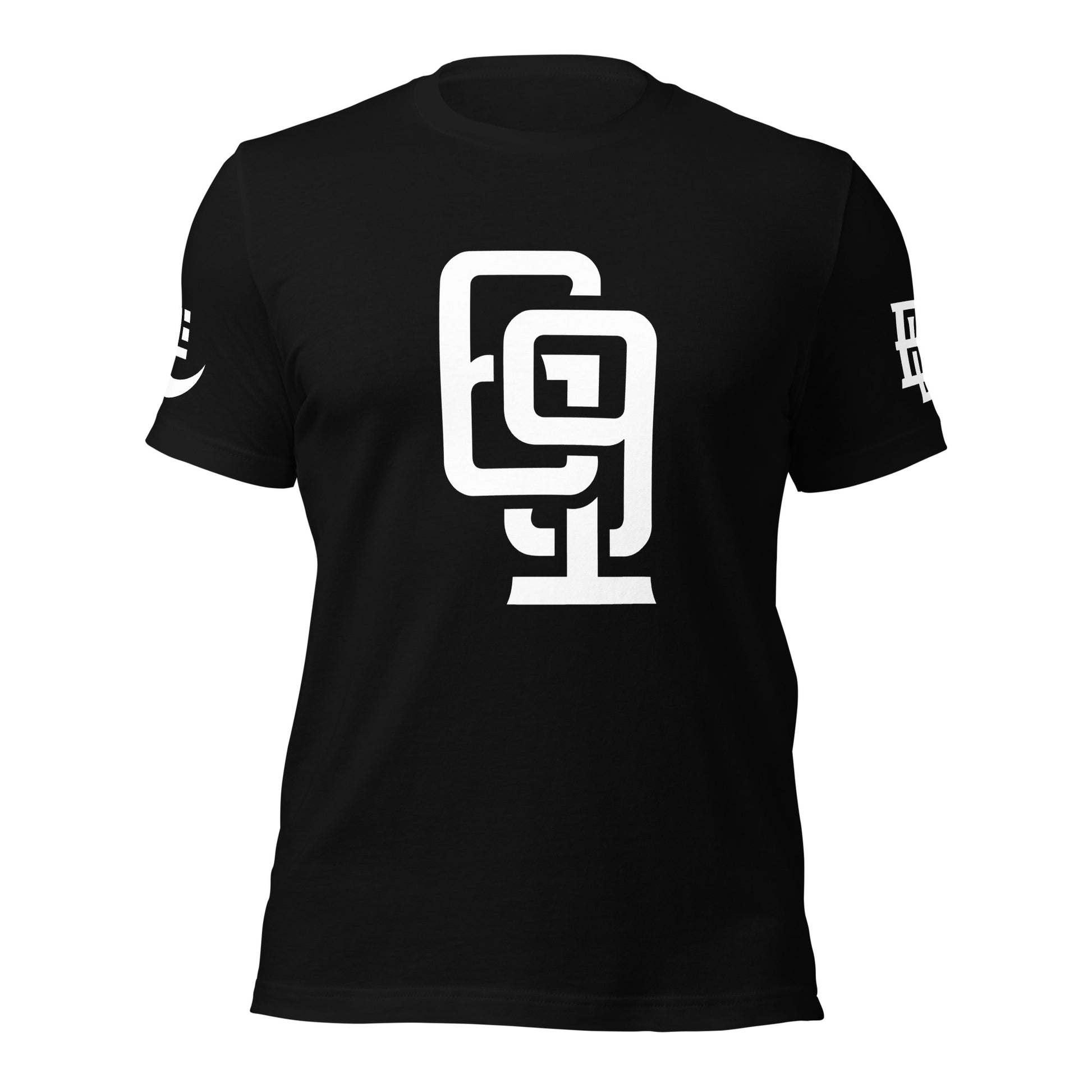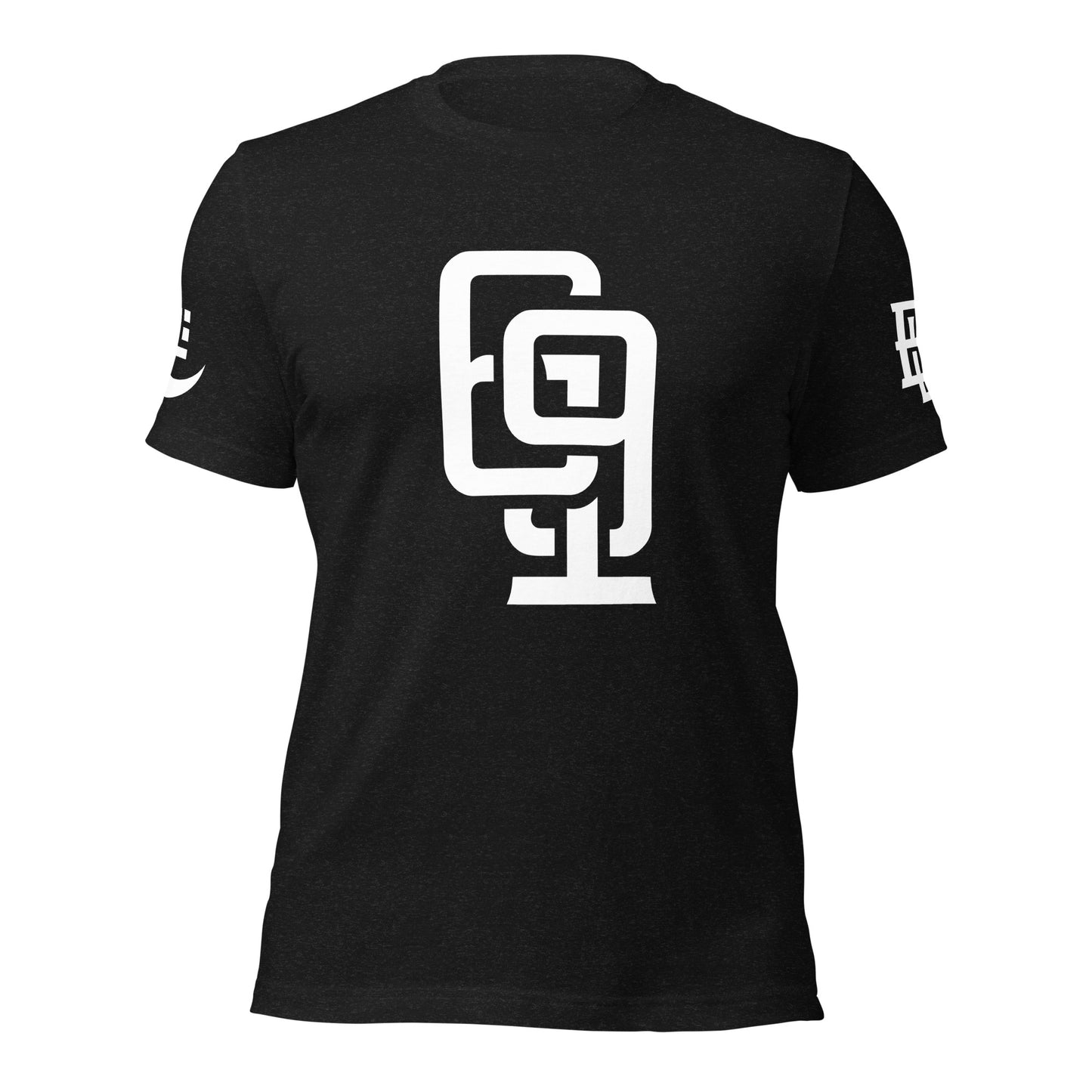 "619" Unisex Staple T-Shirt | Bella + Canvas 3001 | E Luna Brand LEGACY Quadcrest 4 White Logos: Front Center (Large), Left/Right Arm & Back Signature (Large)