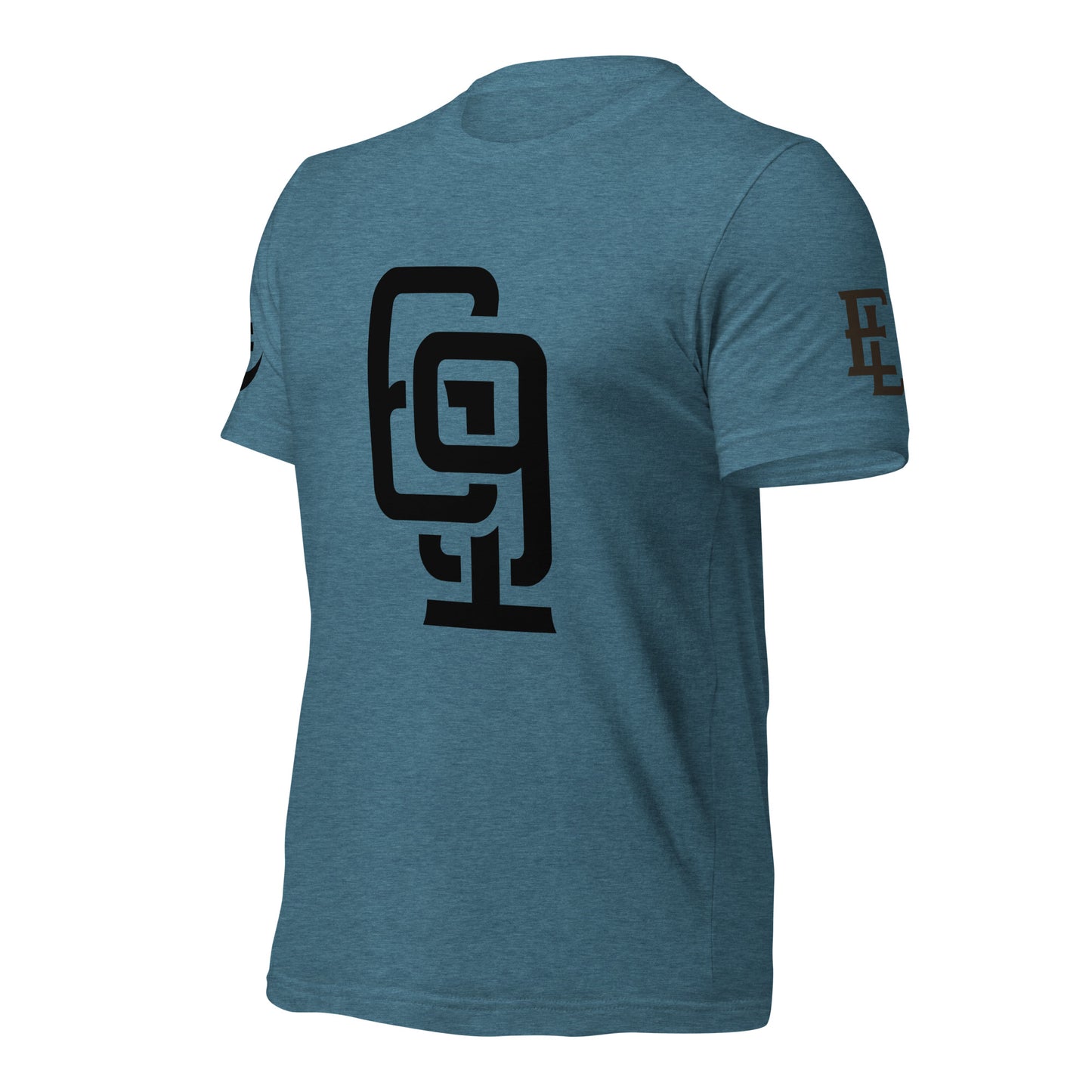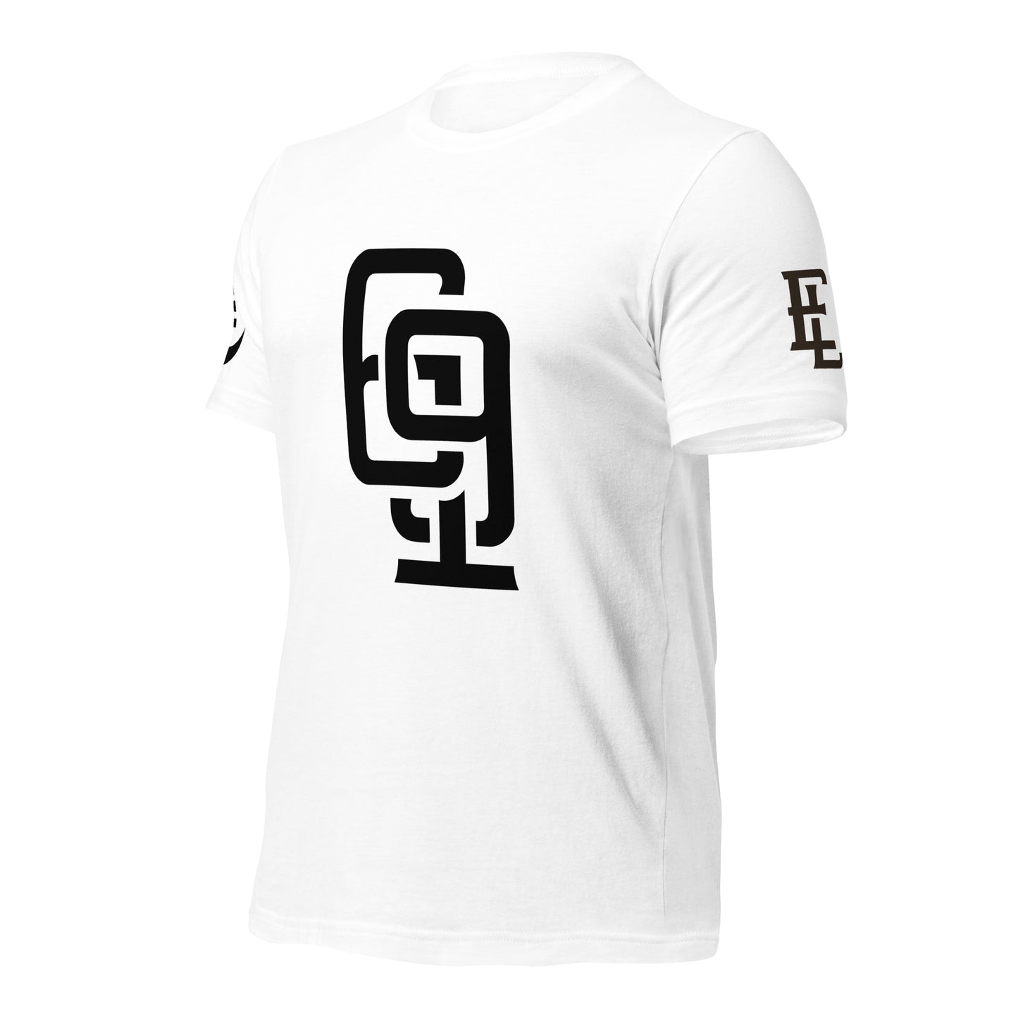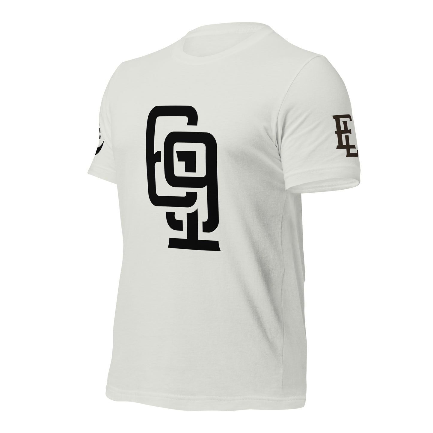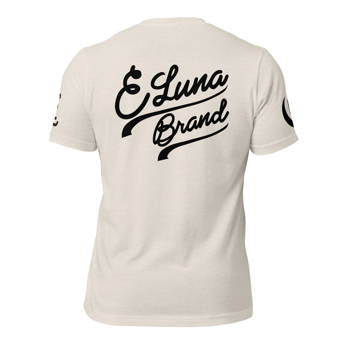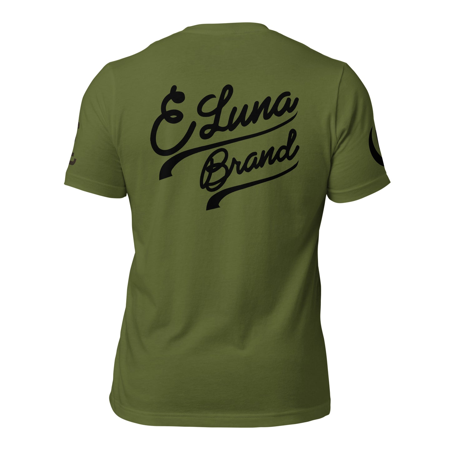 "619" Unisex Staple T-Shirt | Bella + Canvas 3001 | E Luna Brand LEGACY Quadcrest 4 black Logos: Front Center (Large), Left/Right Arm & Back Signature (Large)