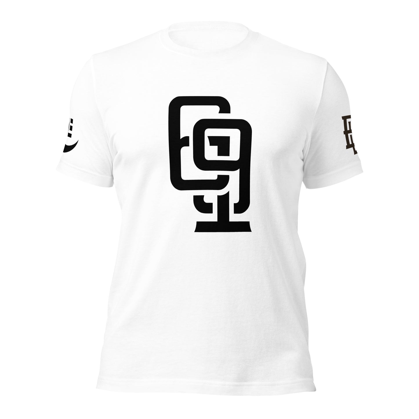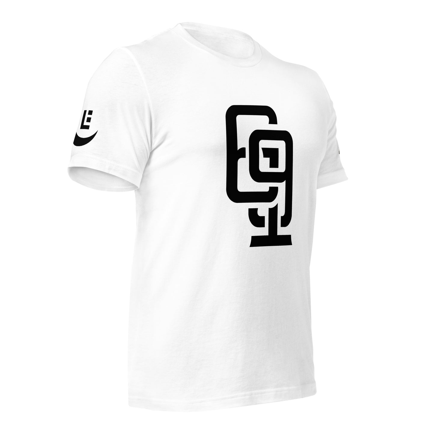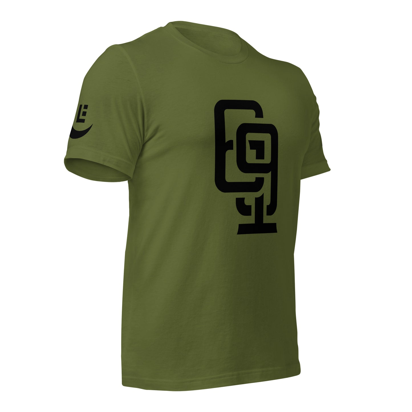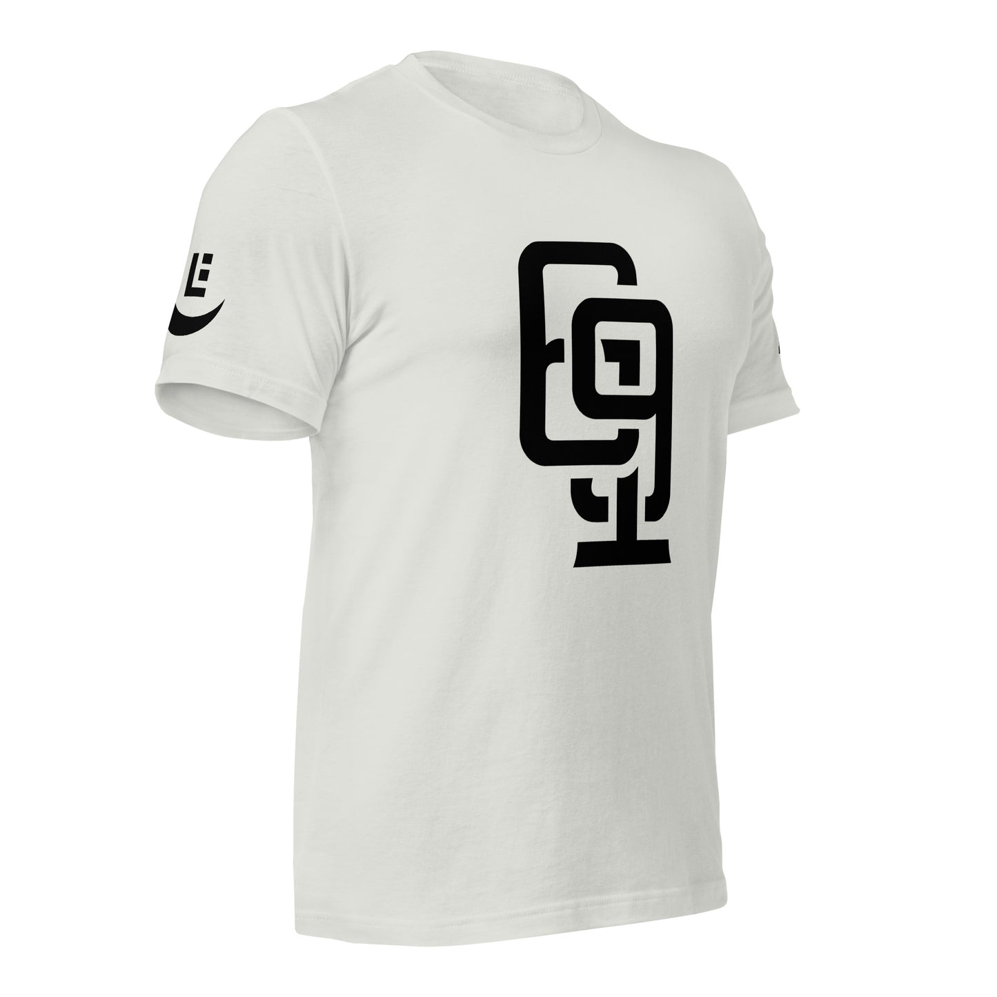 "619" Unisex Staple T-Shirt | Bella + Canvas 3001 | E Luna Brand LEGACY Quadcrest 4 black Logos: Front Center (Large), Left/Right Arm & Back Signature (Large)