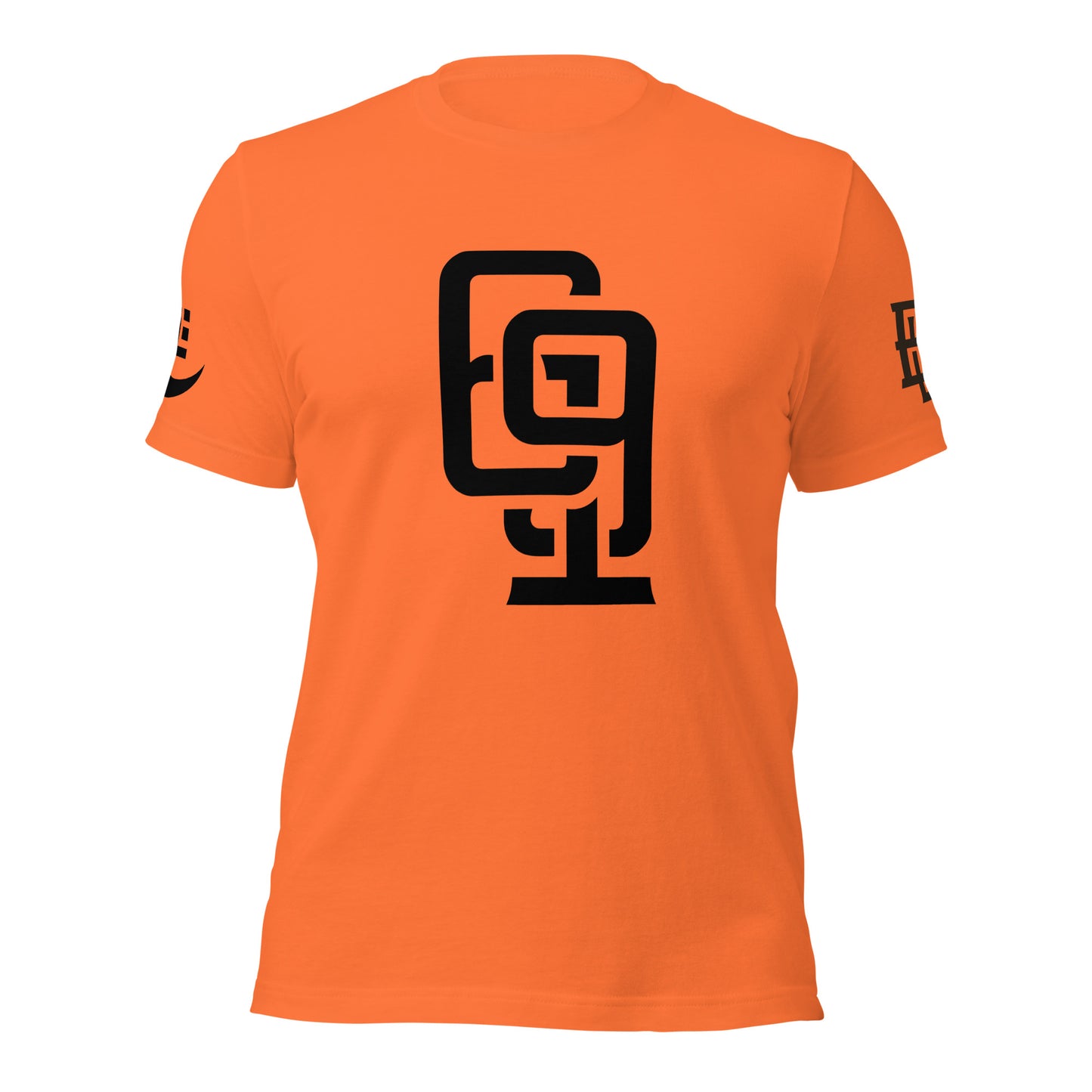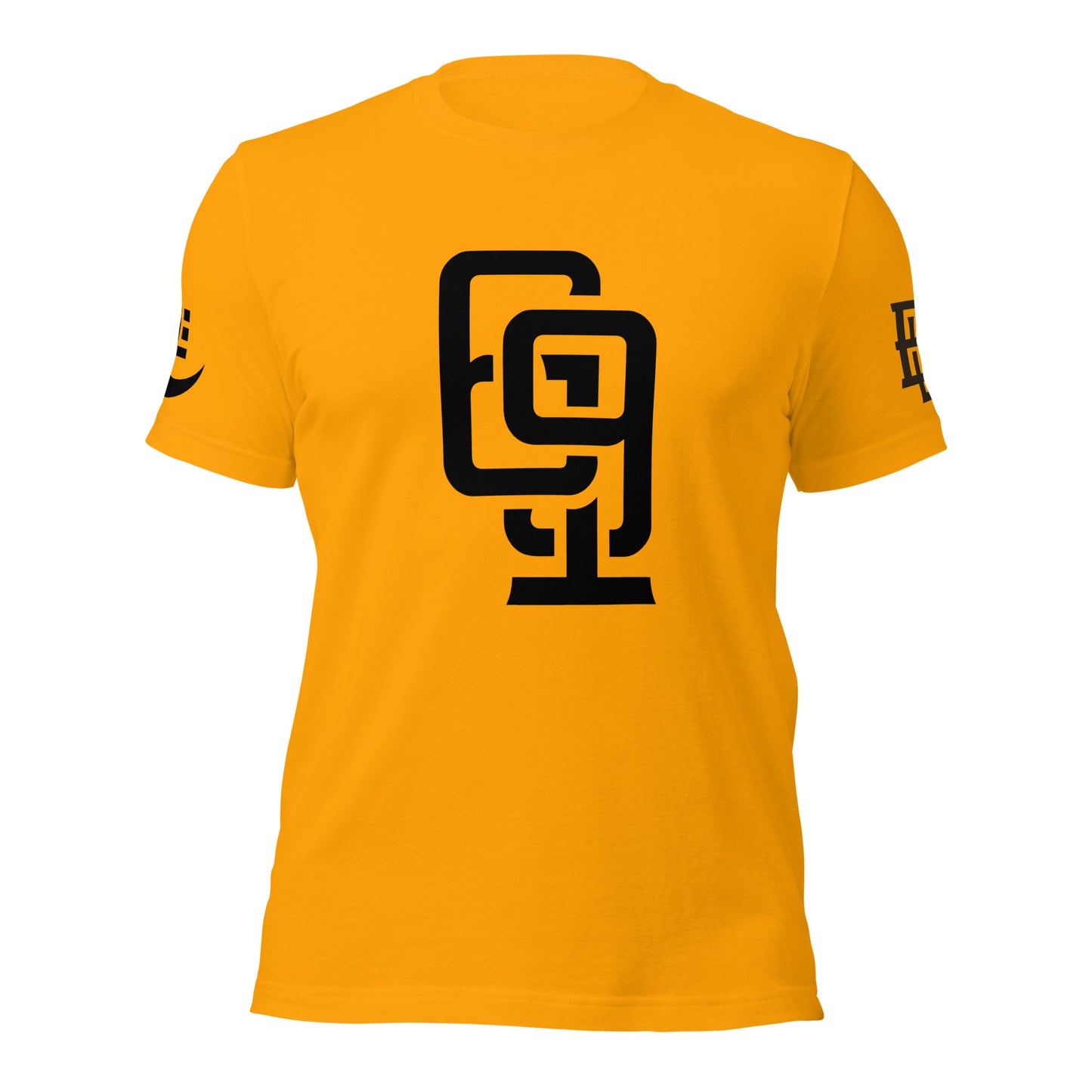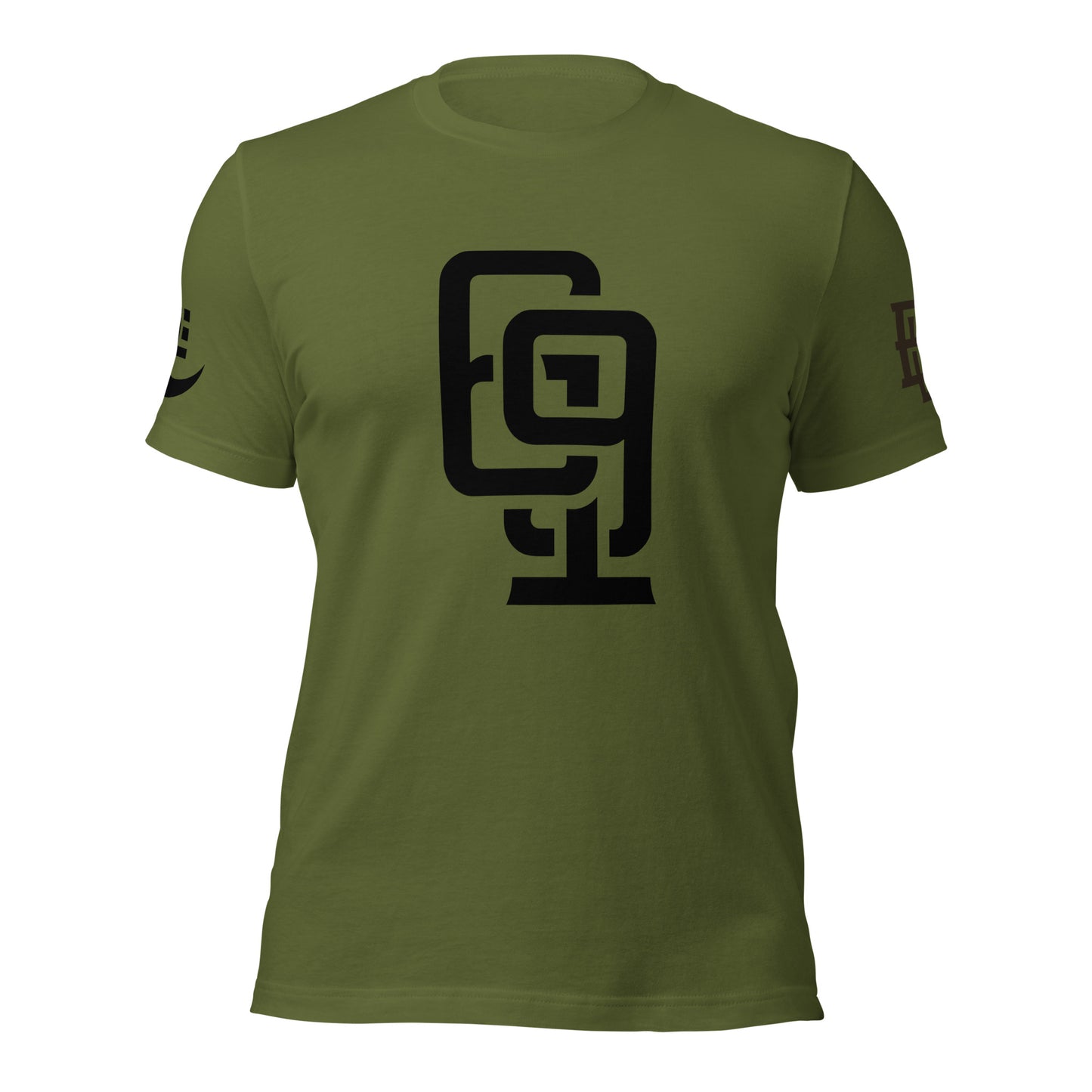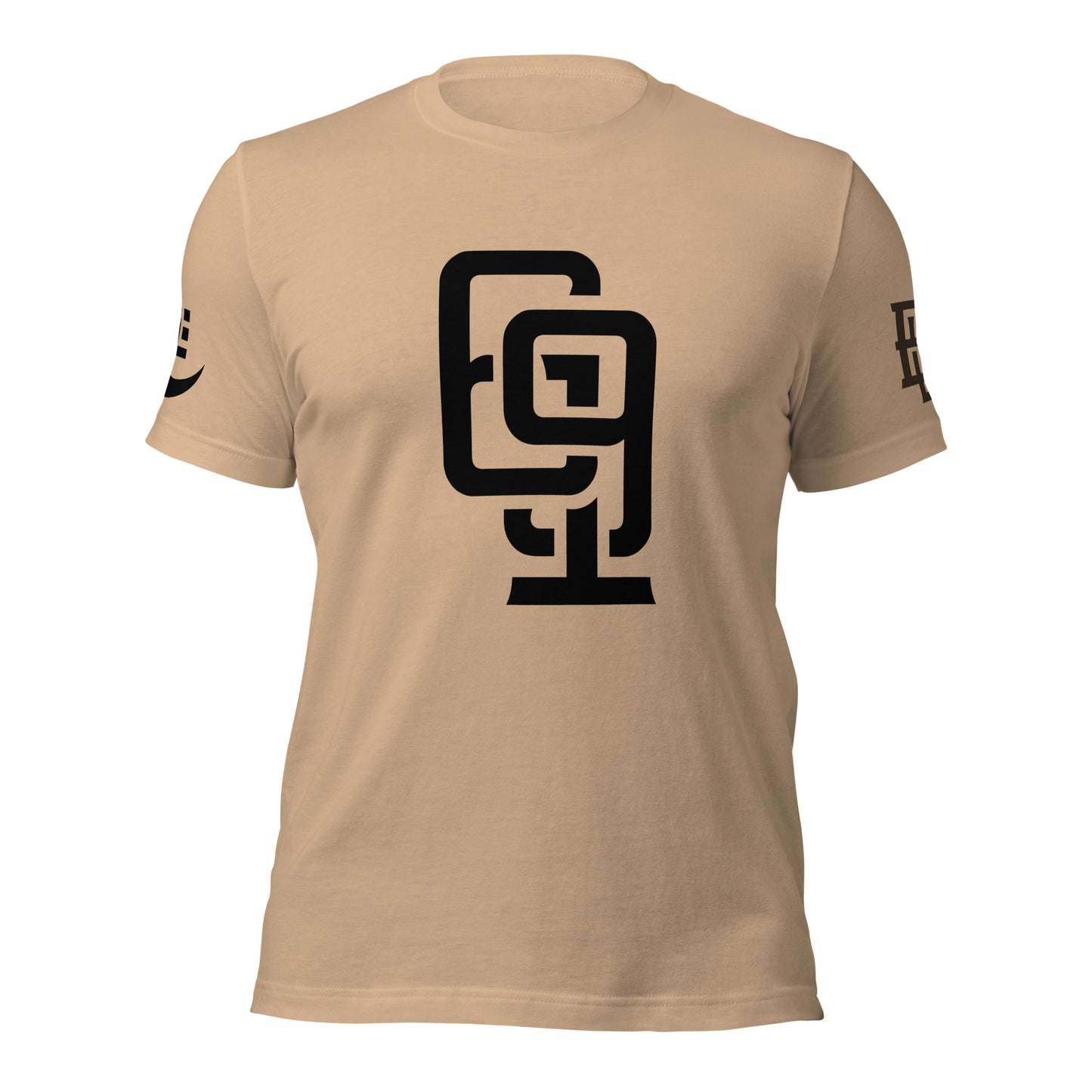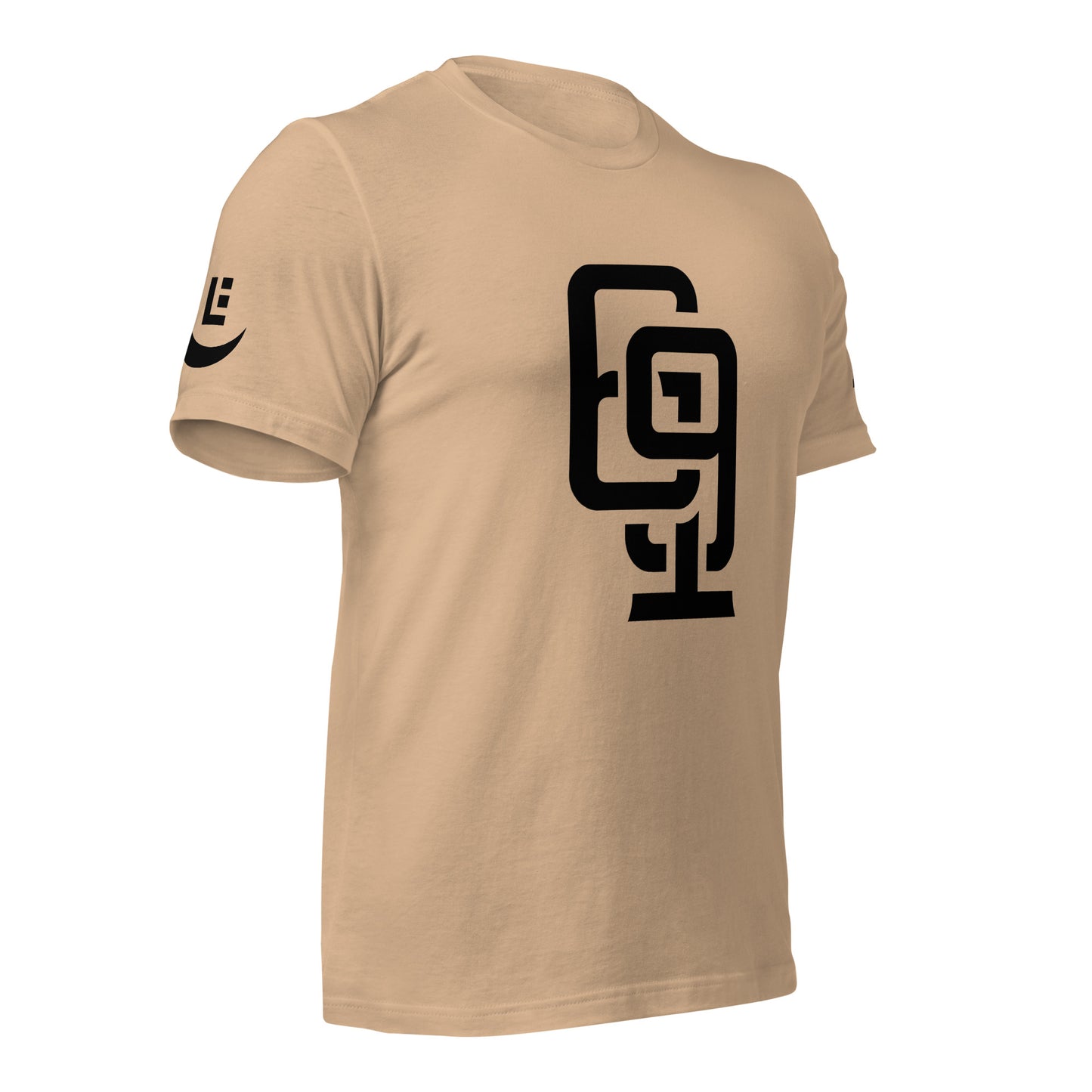 "619" Unisex Staple T-Shirt | Bella + Canvas 3001 | E Luna Brand LEGACY Quadcrest 4 black Logos: Front Center (Large), Left/Right Arm & Back Signature (Large)
