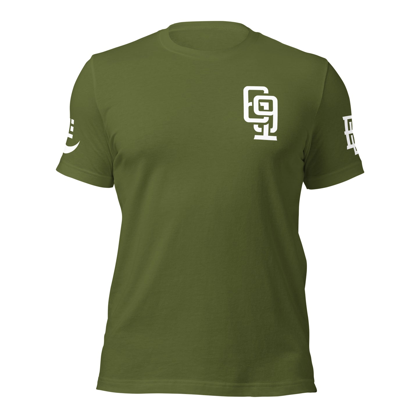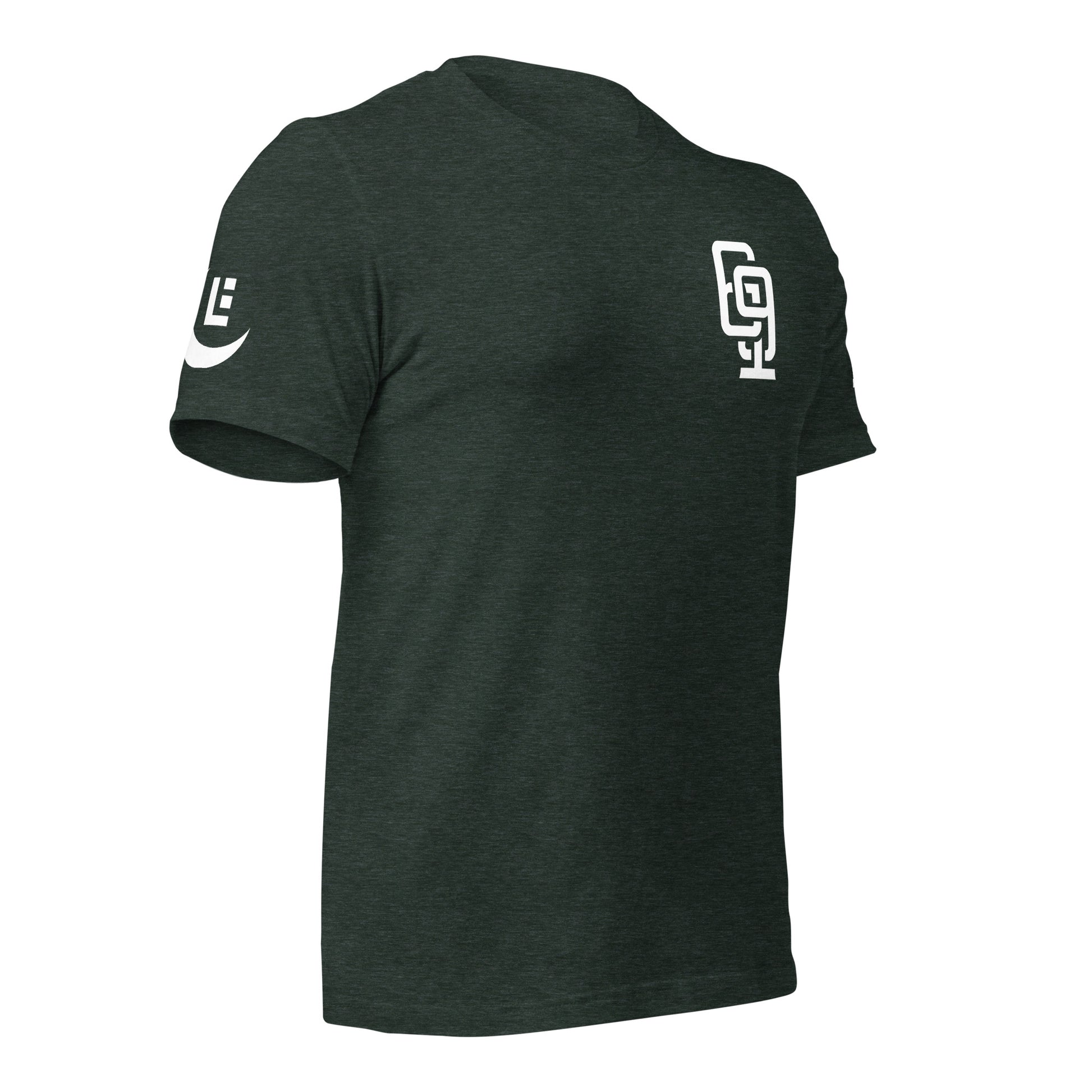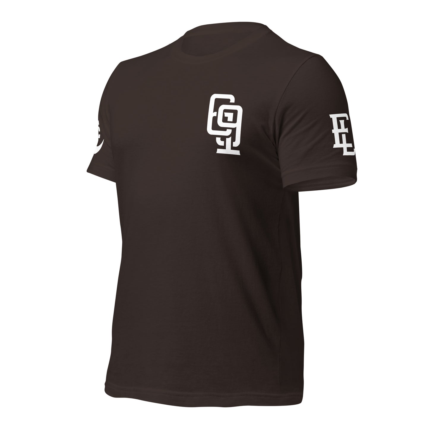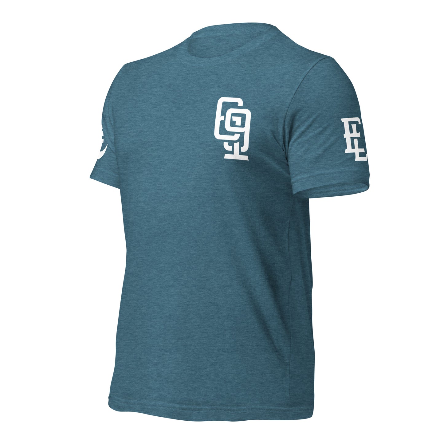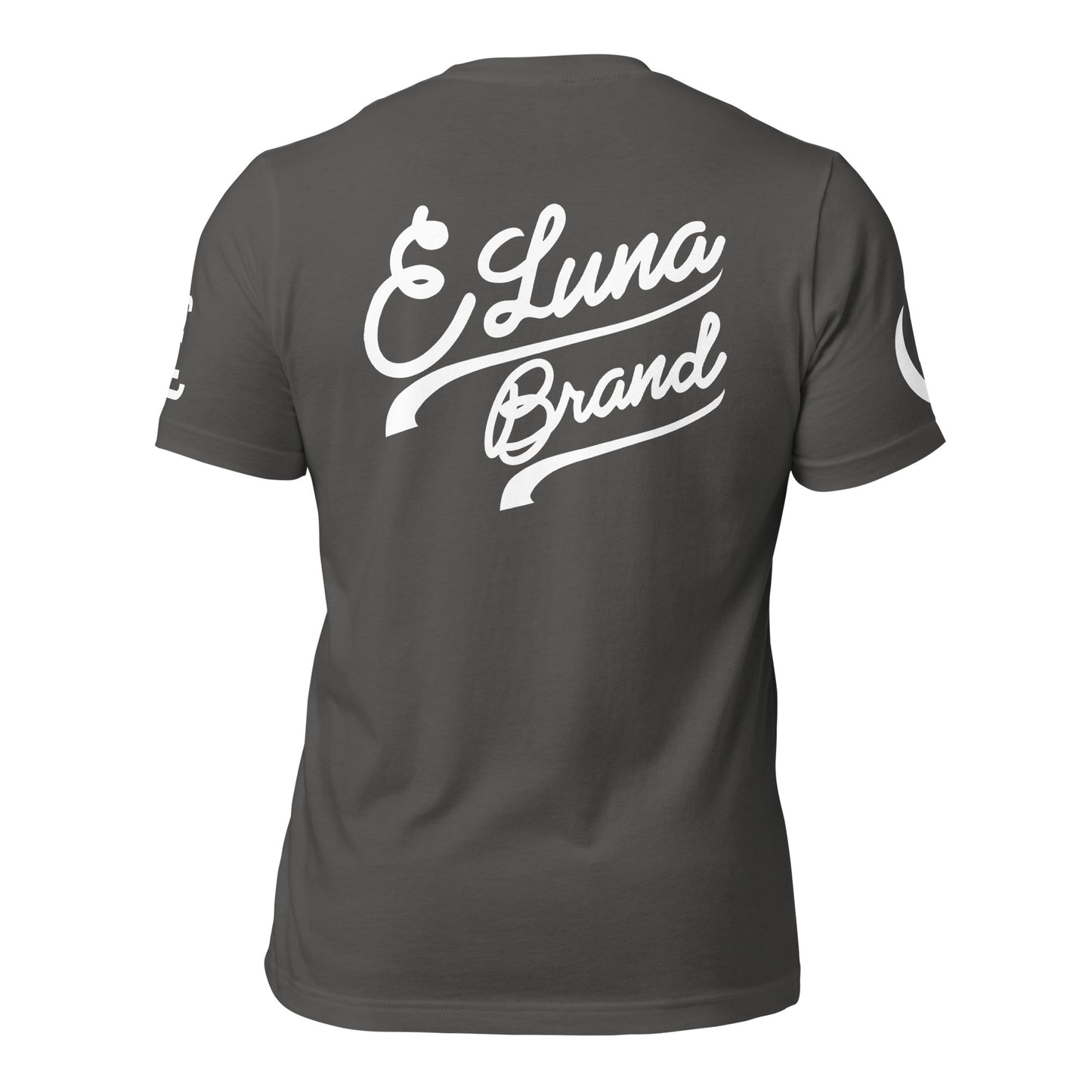 "619" Unisex Staple T-Shirt | Bella + Canvas 3001 | E Luna Brand LEGACY Quadcrest 4 White Logos: Front Upper Left, Left/Right Arm & Back Signature (Large)