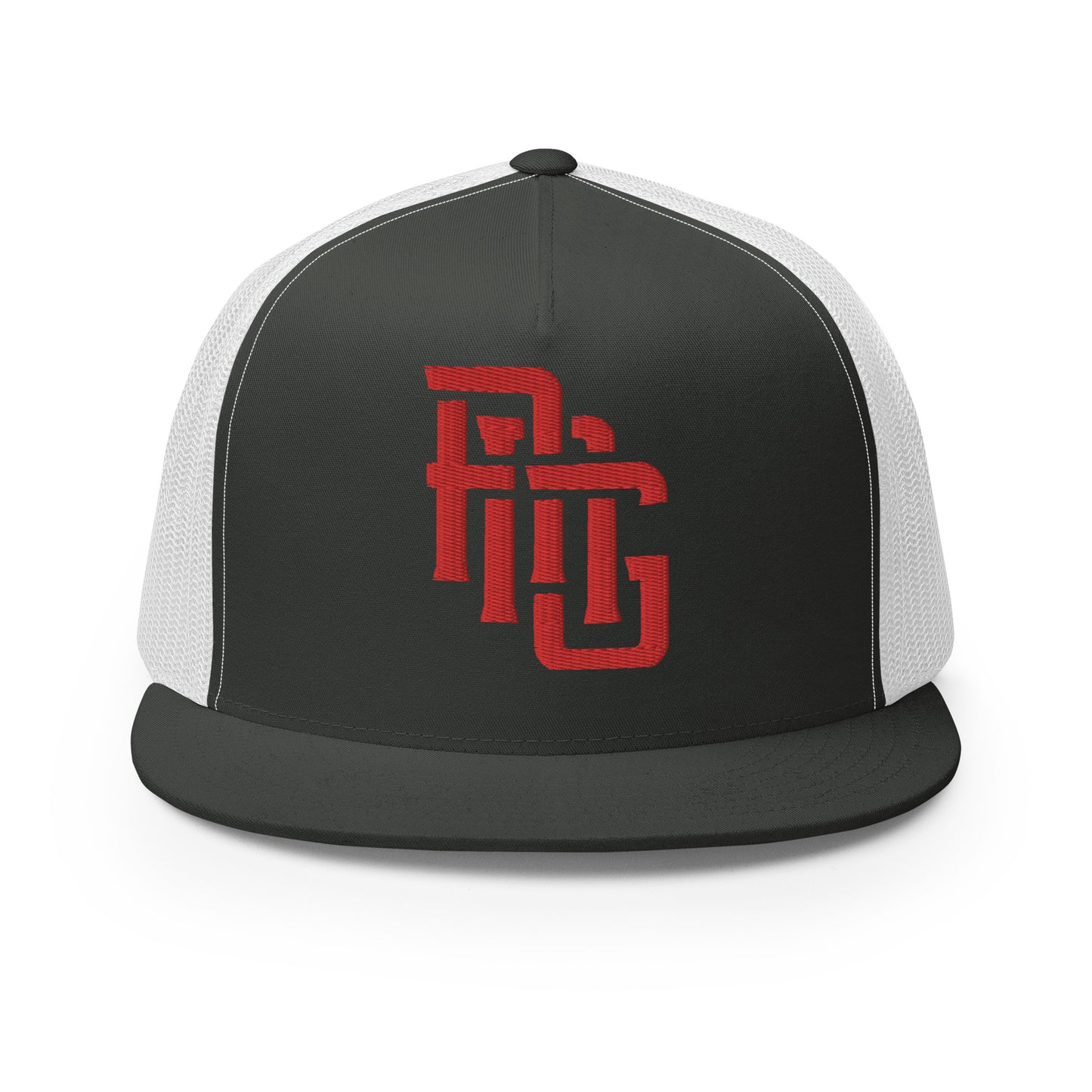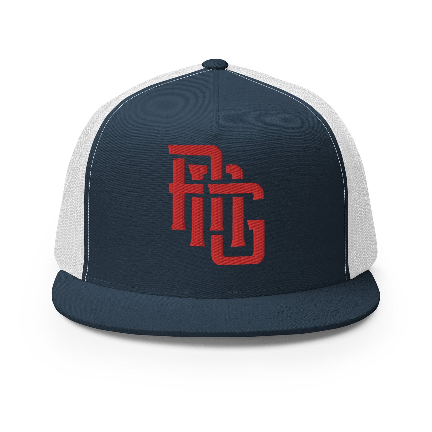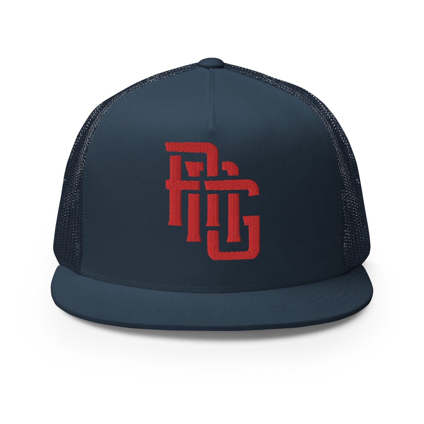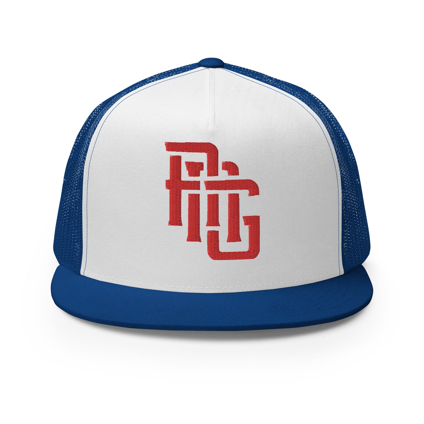 "ANG" Five Panel Trucker Cap | Yupoong 6006 | E Luna CLASSIC Solocrest 1 Red Thread Front Logo