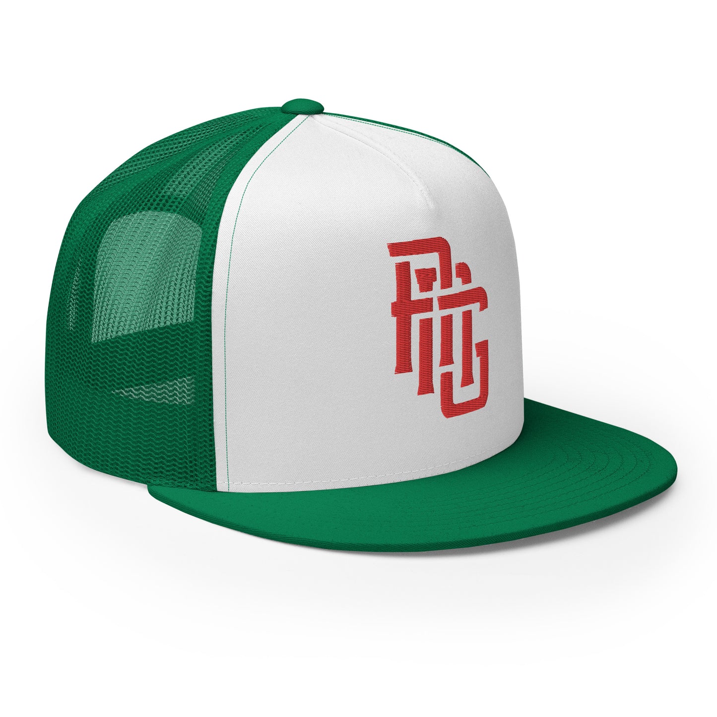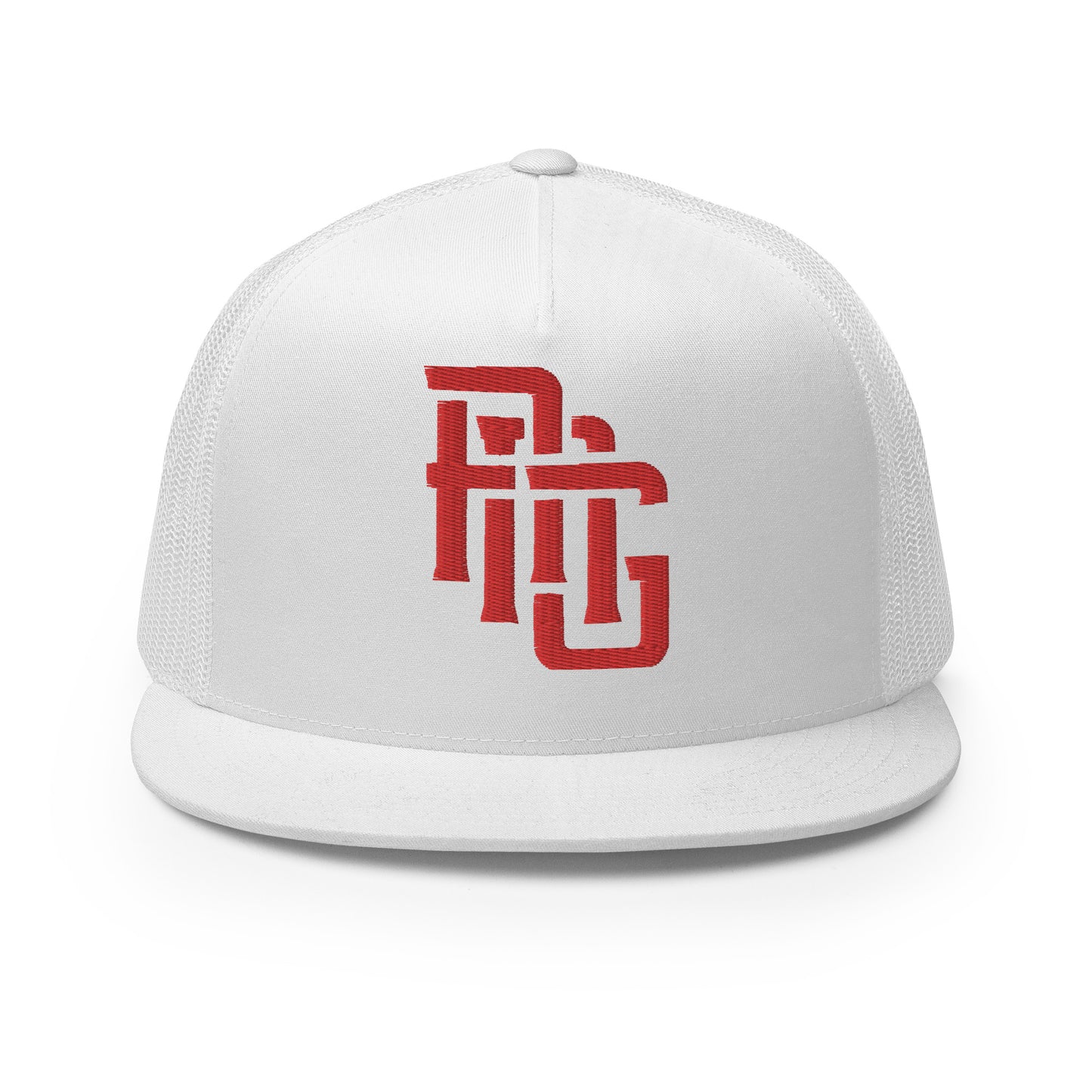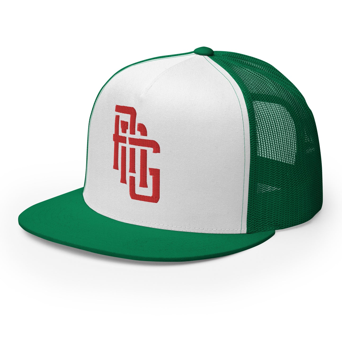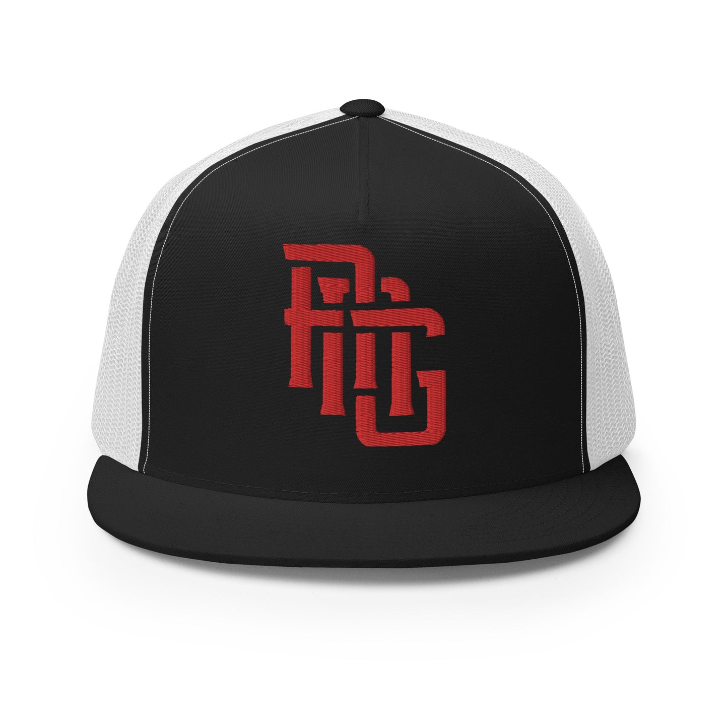 "ANG" Five Panel Trucker Cap | Yupoong 6006 | E Luna CLASSIC Solocrest 1 Red Thread Front Logo