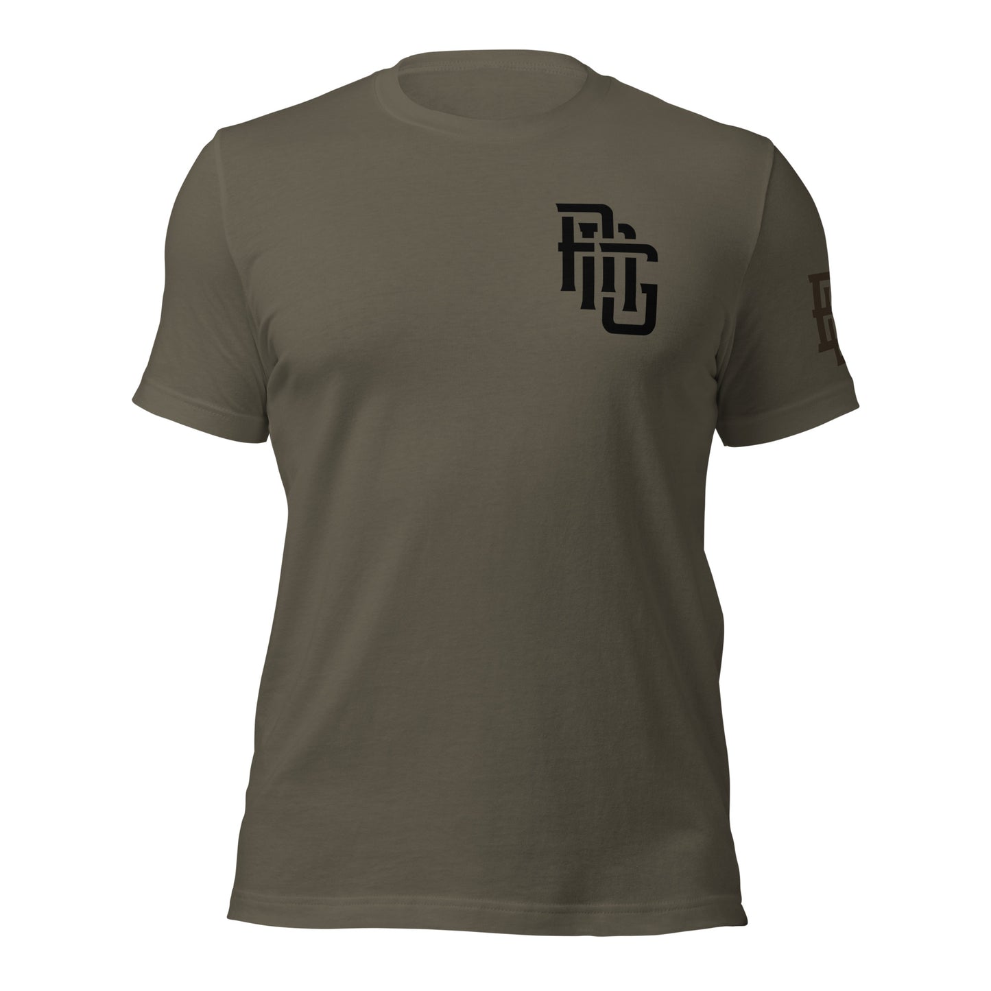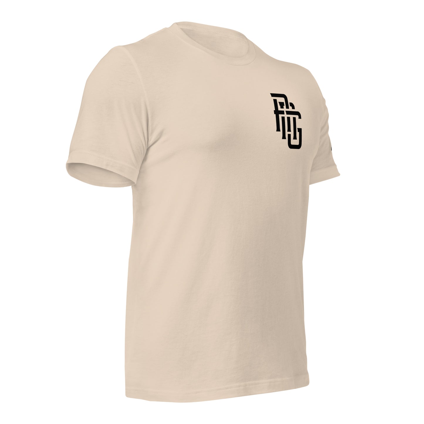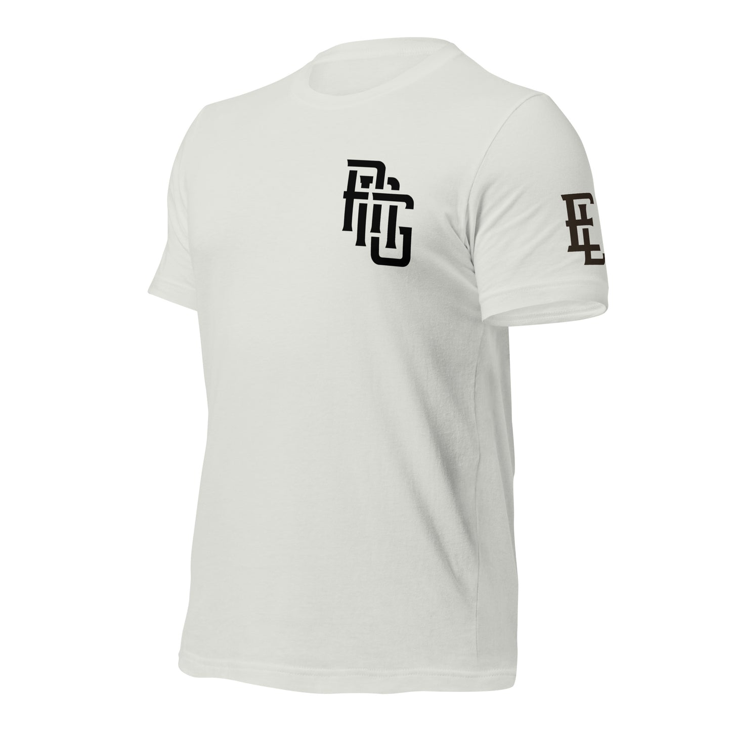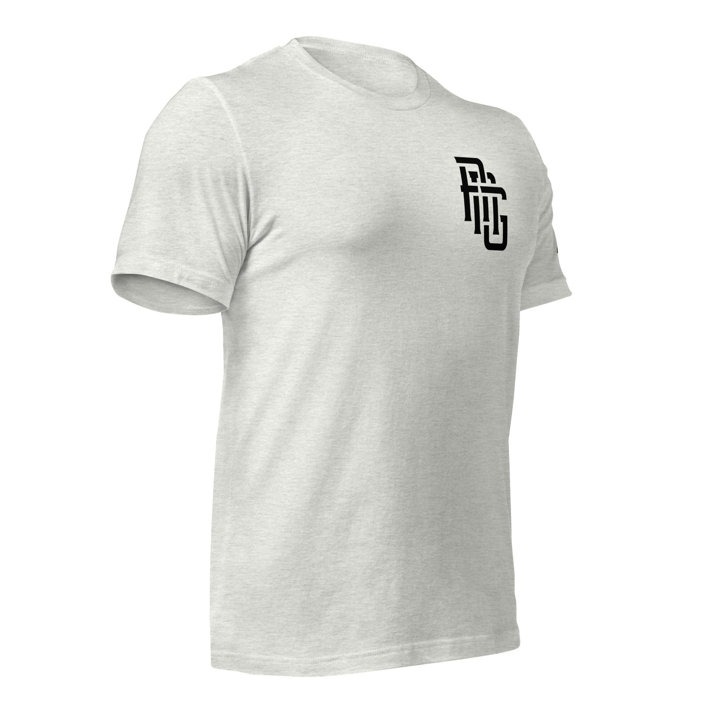 "ANG" Unisex Staple T-Shirt | Bella + Canvas 3001 | E Luna Brand ESSENCE Tricrest 3 Black Logos: Front Upper Left, Left Arm & Outside Back Label