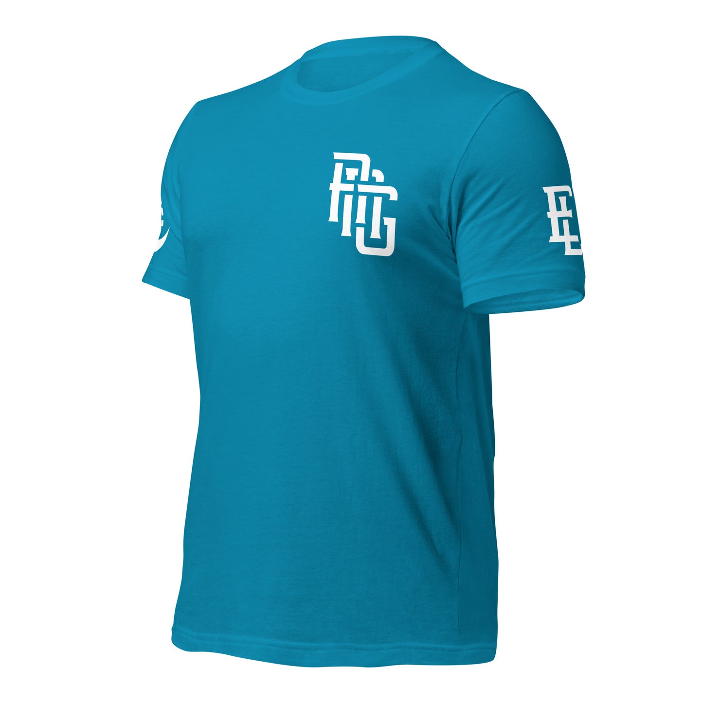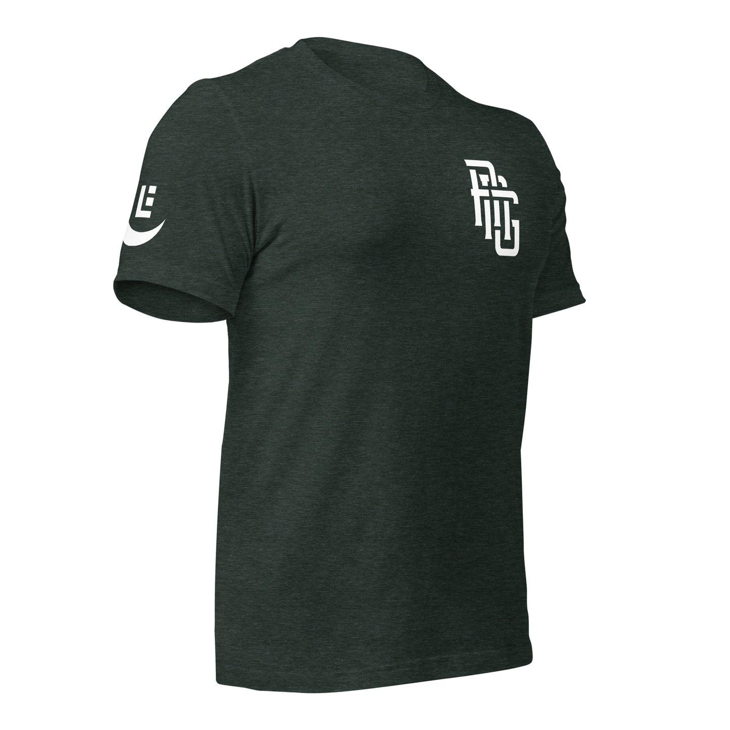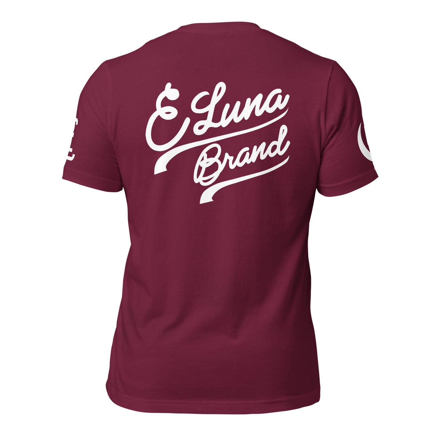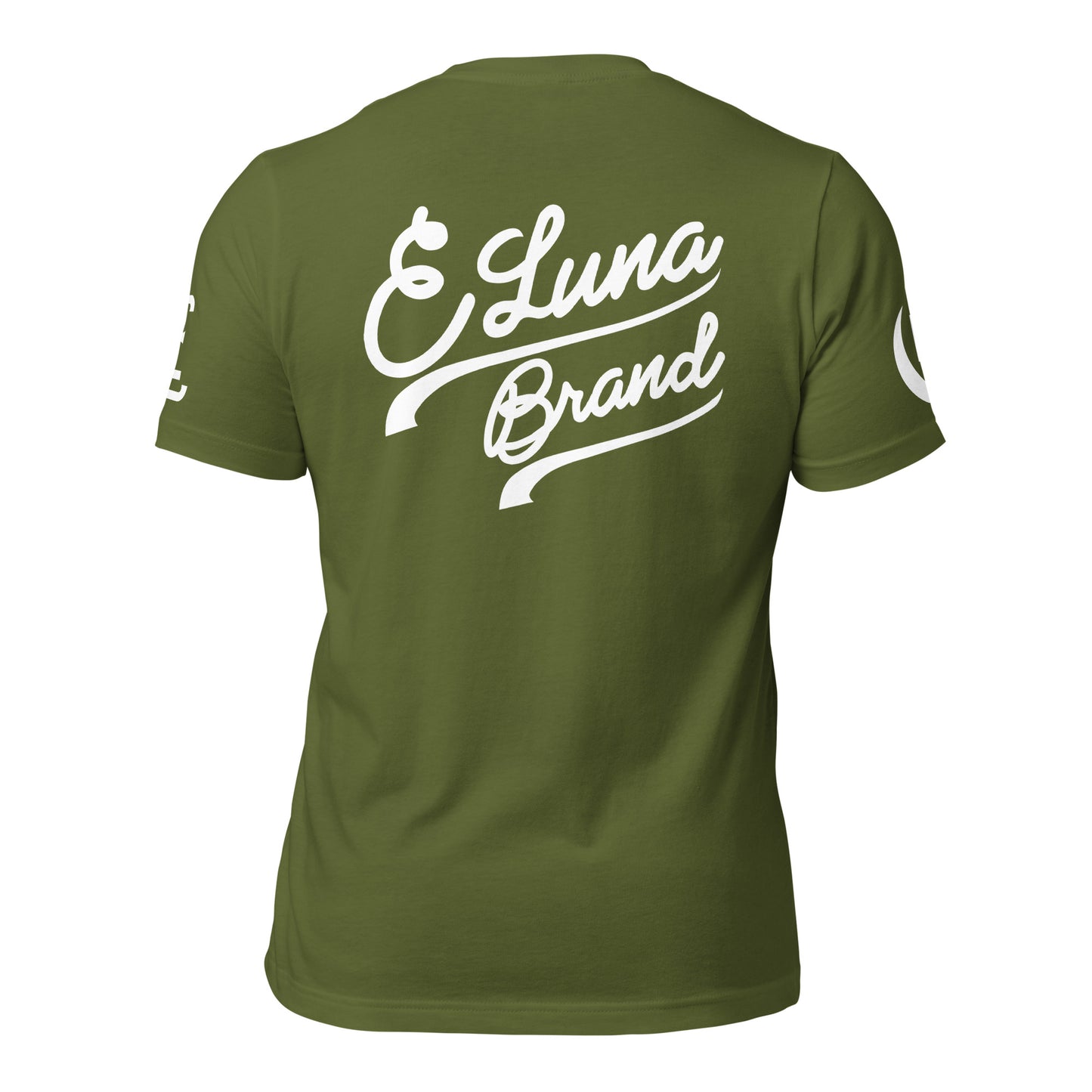 "ANG" Unisex Staple T-Shirt | Bella + Canvas 3001 | E Luna Brand EXCLUSIVE Quadcrest 4 White Logos: Front Upper Left, Left/Right Arm & Back Signature (Large)