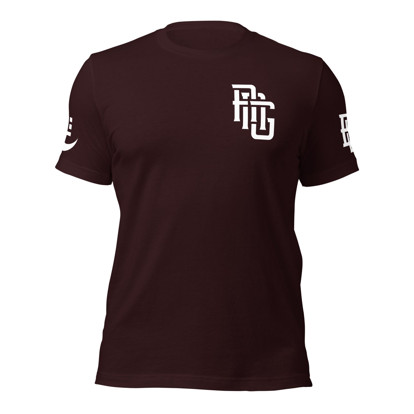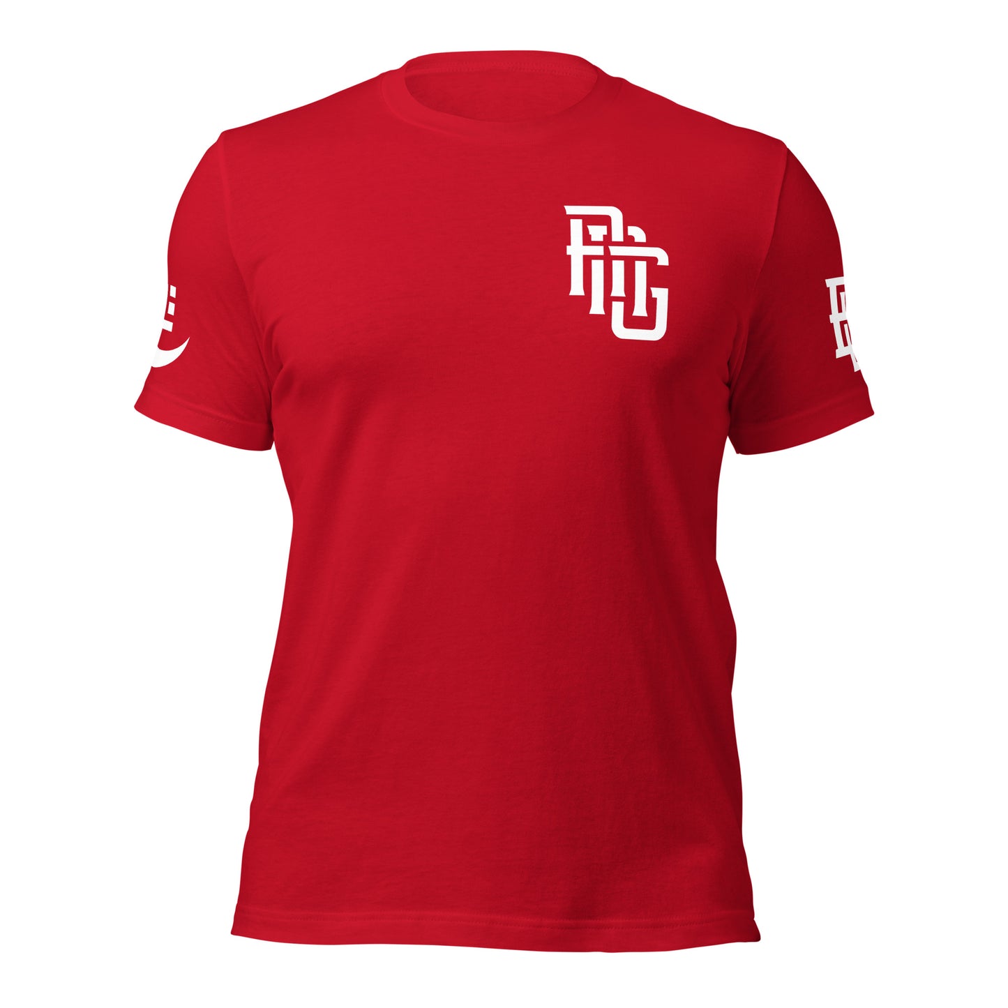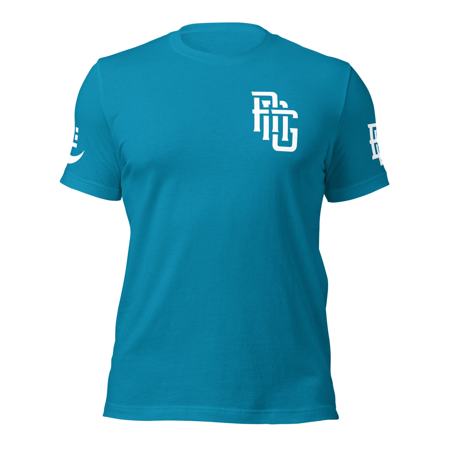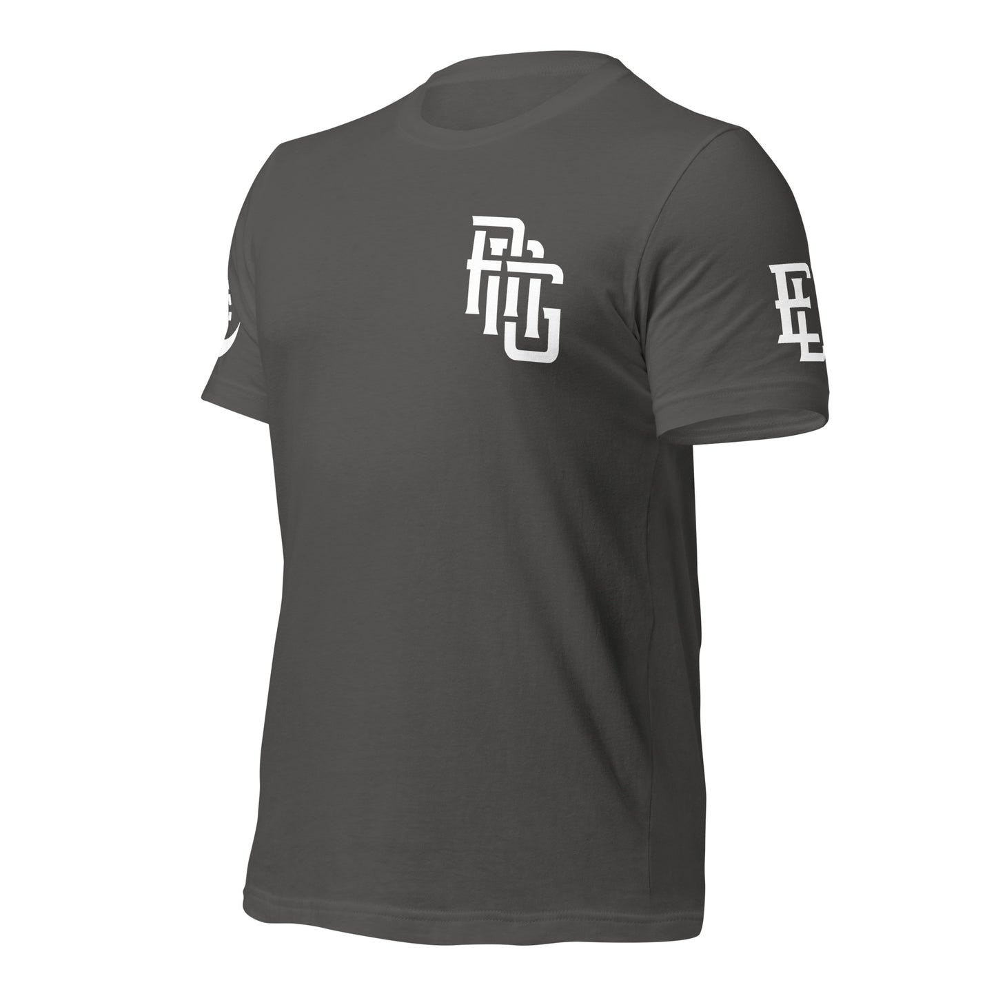 "ANG" Unisex Staple T-Shirt | Bella + Canvas 3001 | E Luna Brand EXCLUSIVE Quadcrest 4 White Logos: Front Upper Left, Left/Right Arm & Back Signature (Large)
