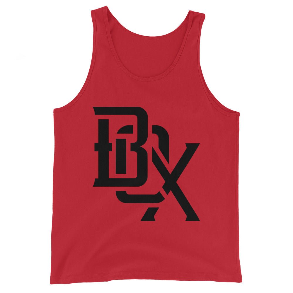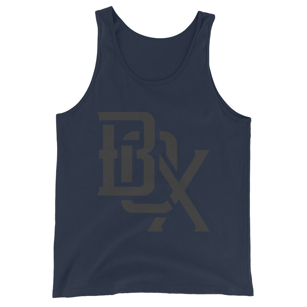"BOX" Men’s Staple Tank Top | Bella + Canvas 3480 | E Luna Brand CHOICE Duocrest 2 Black Logos: Front Center (Large) & Outside Back Label