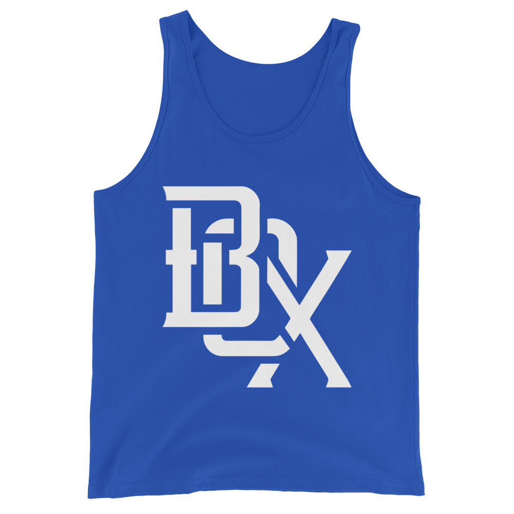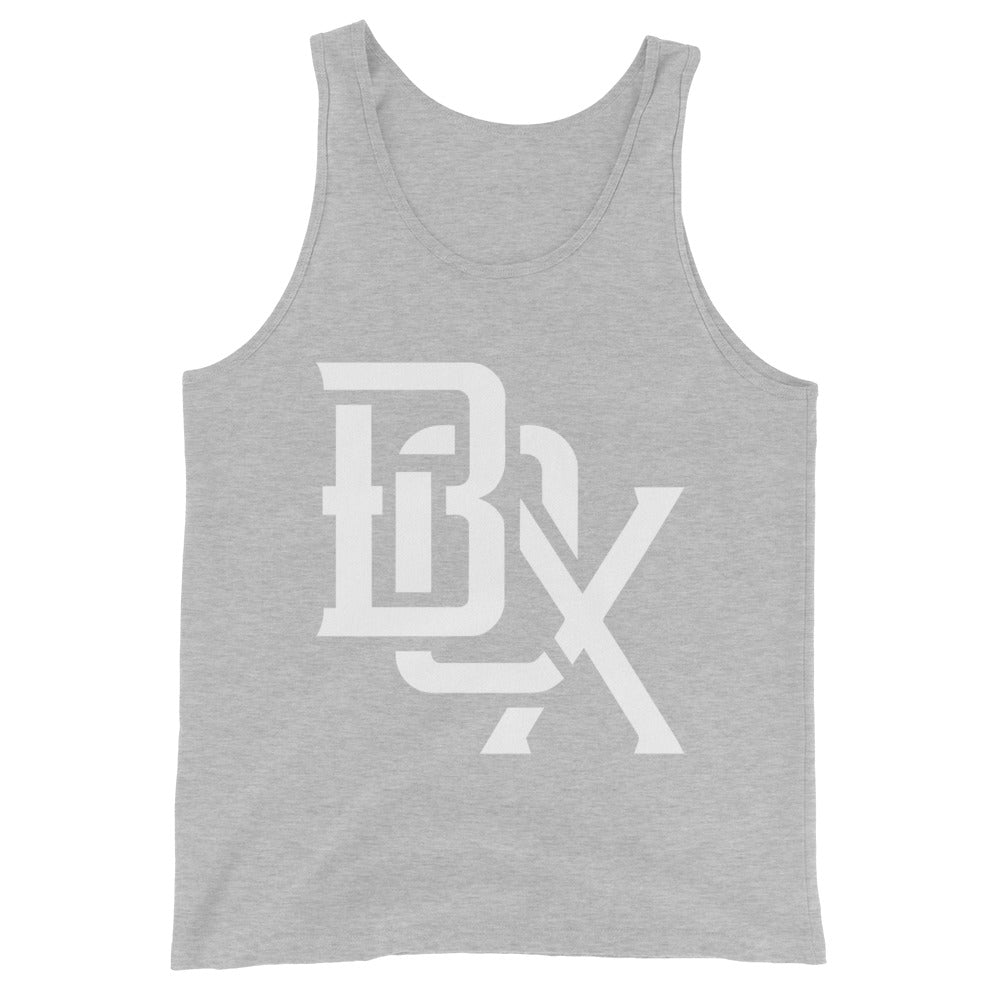 "BOX" Men’s Staple Tank Top | Bella + Canvas 3480 | E Luna Brand CHOICE Duocrest 2 White Logos: Front Center (Large) & Outside Back Label