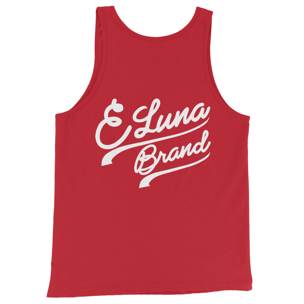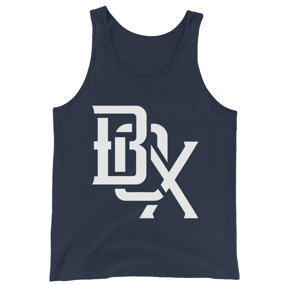 "BOX" Men’s Staple Tank Top | Bella + Canvas 3480 | E Luna Brand CHOICE Duocrest 2 White Logos: Front Center (Large) & Back Signature (Large)