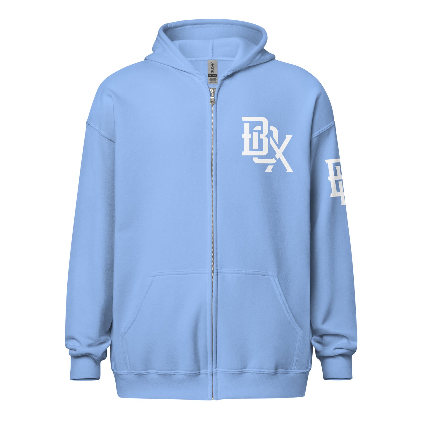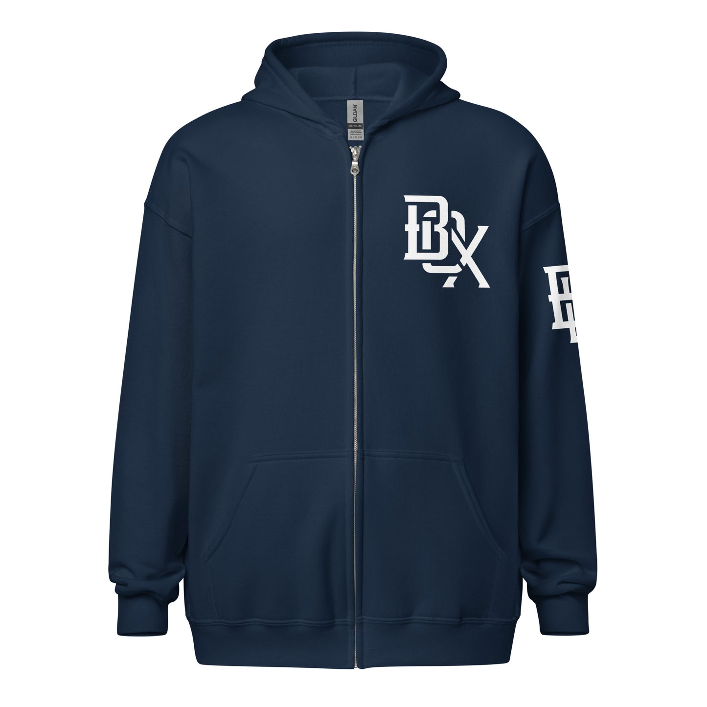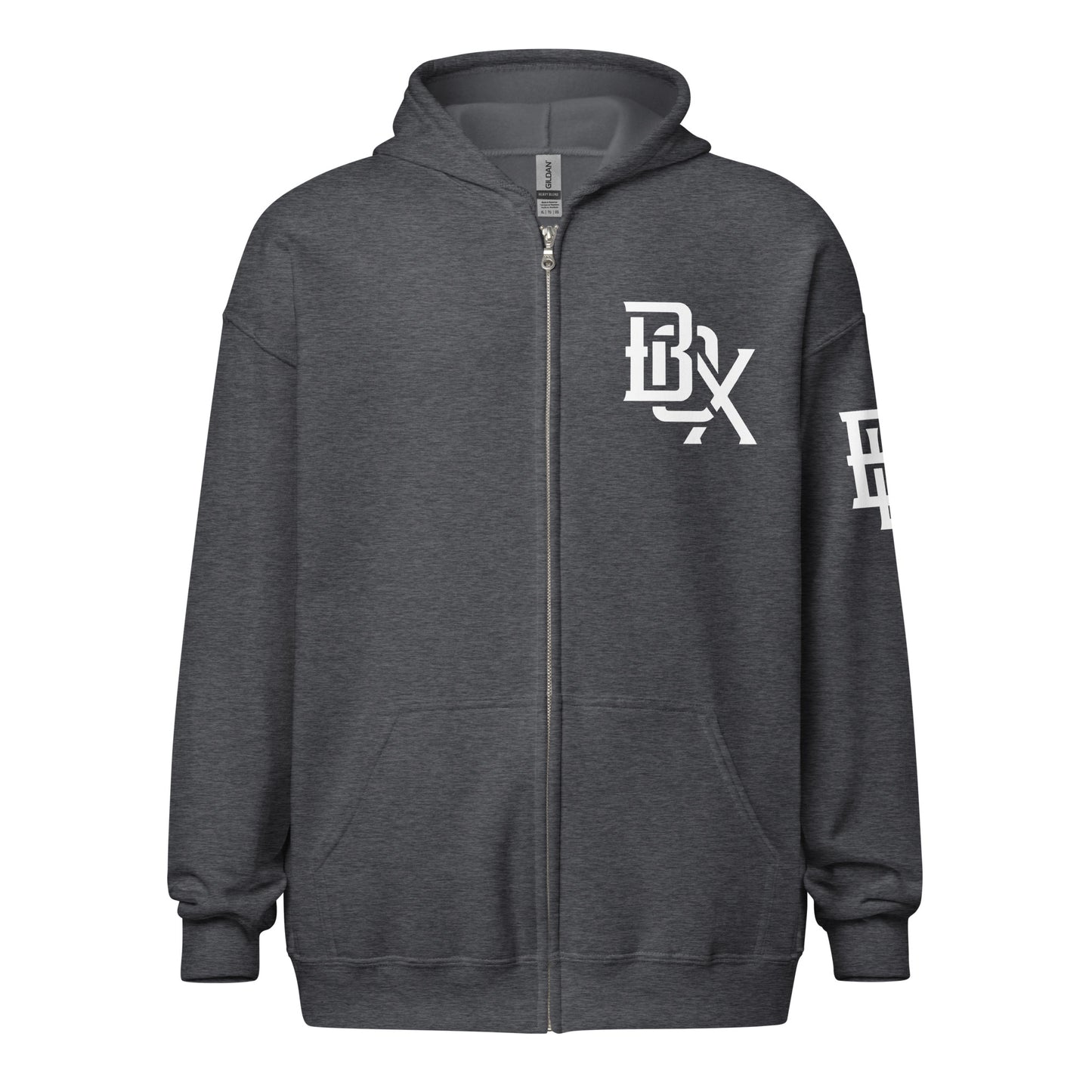 "BOX" Unisex Heavy Blend Zip Hoodie | Gildan 18600 | E Luna Brand ELEMENT Tricrest 3 White Logos: Front Upper Left, Left Arm & Back (Large)