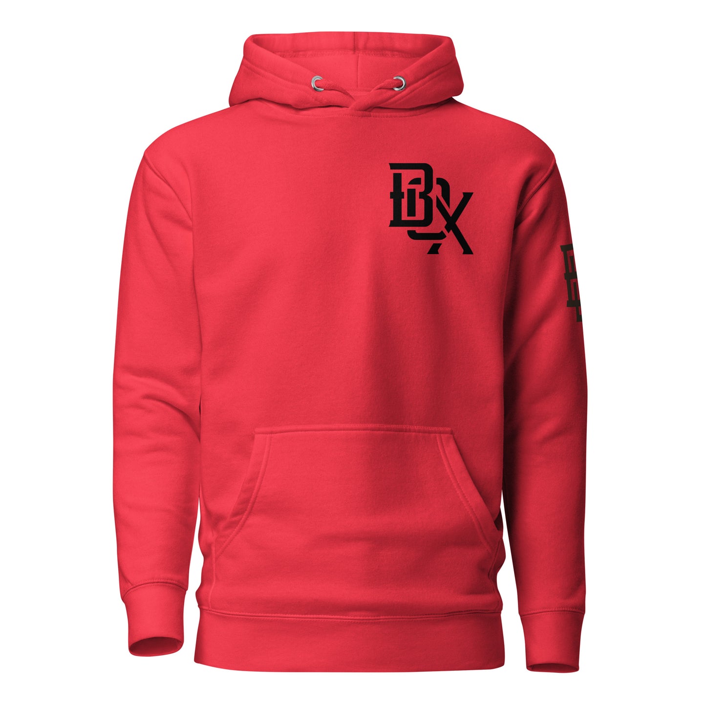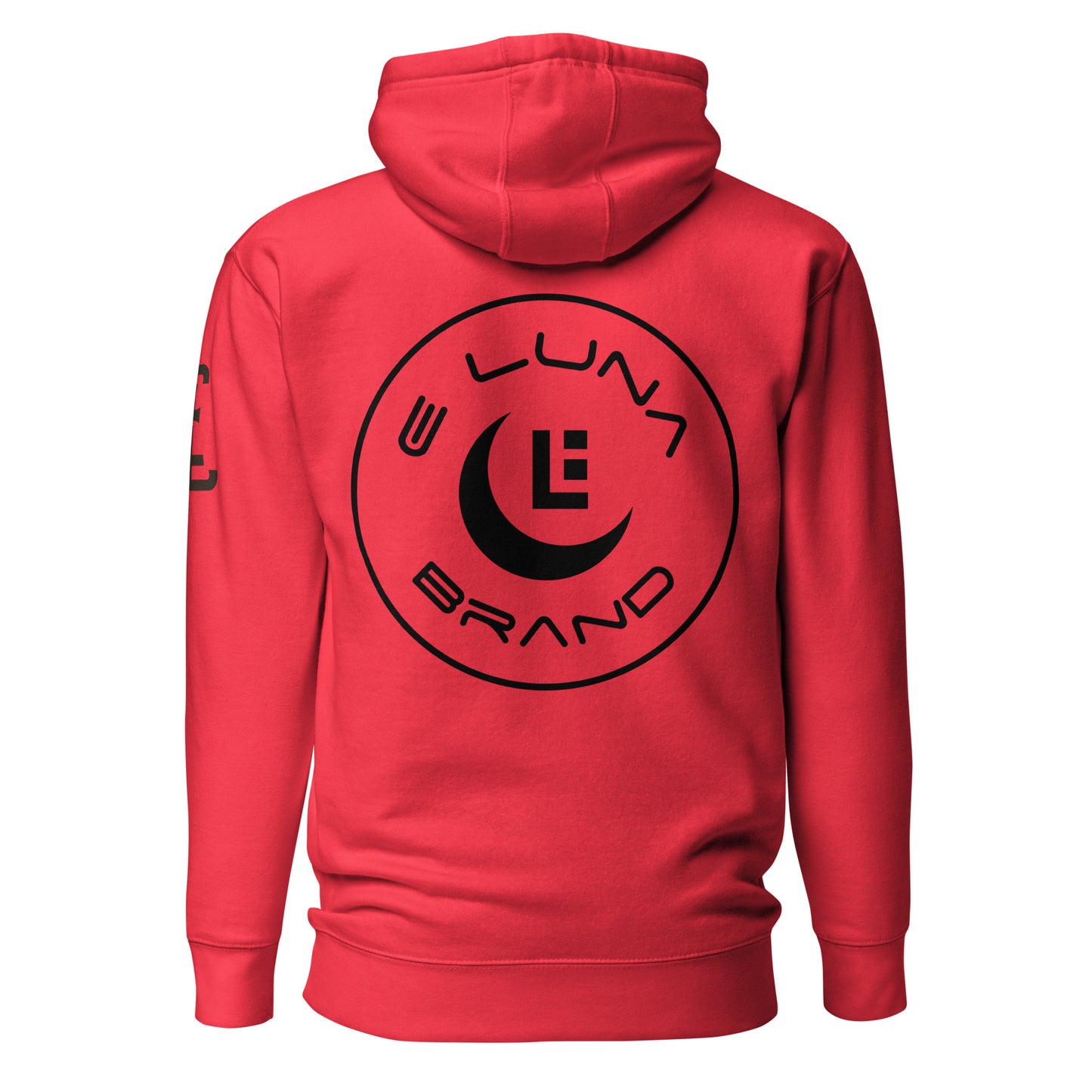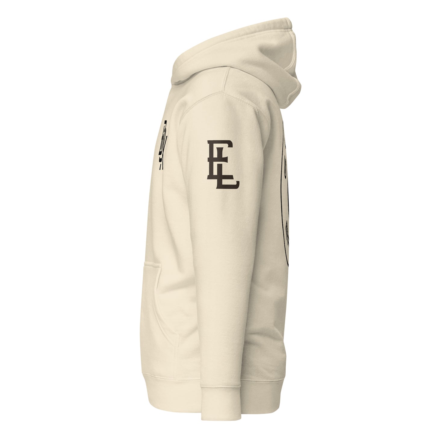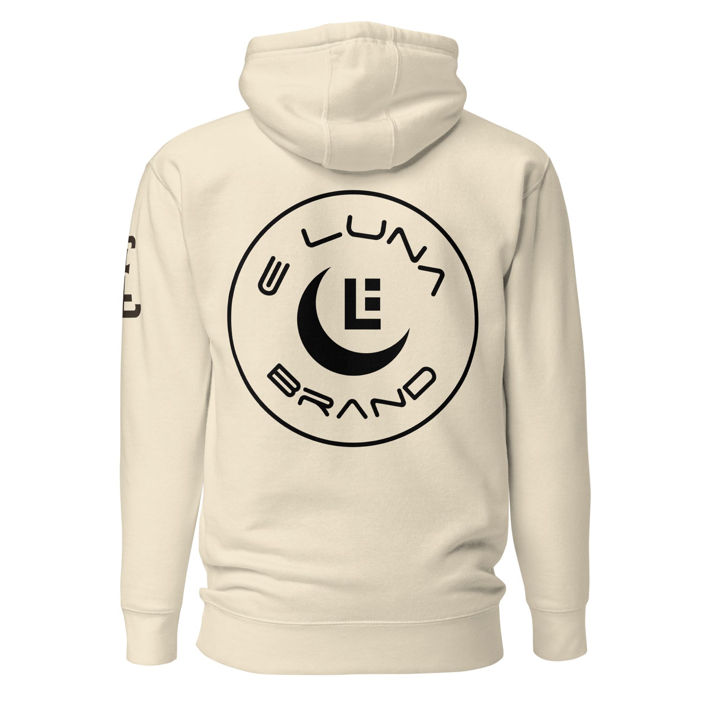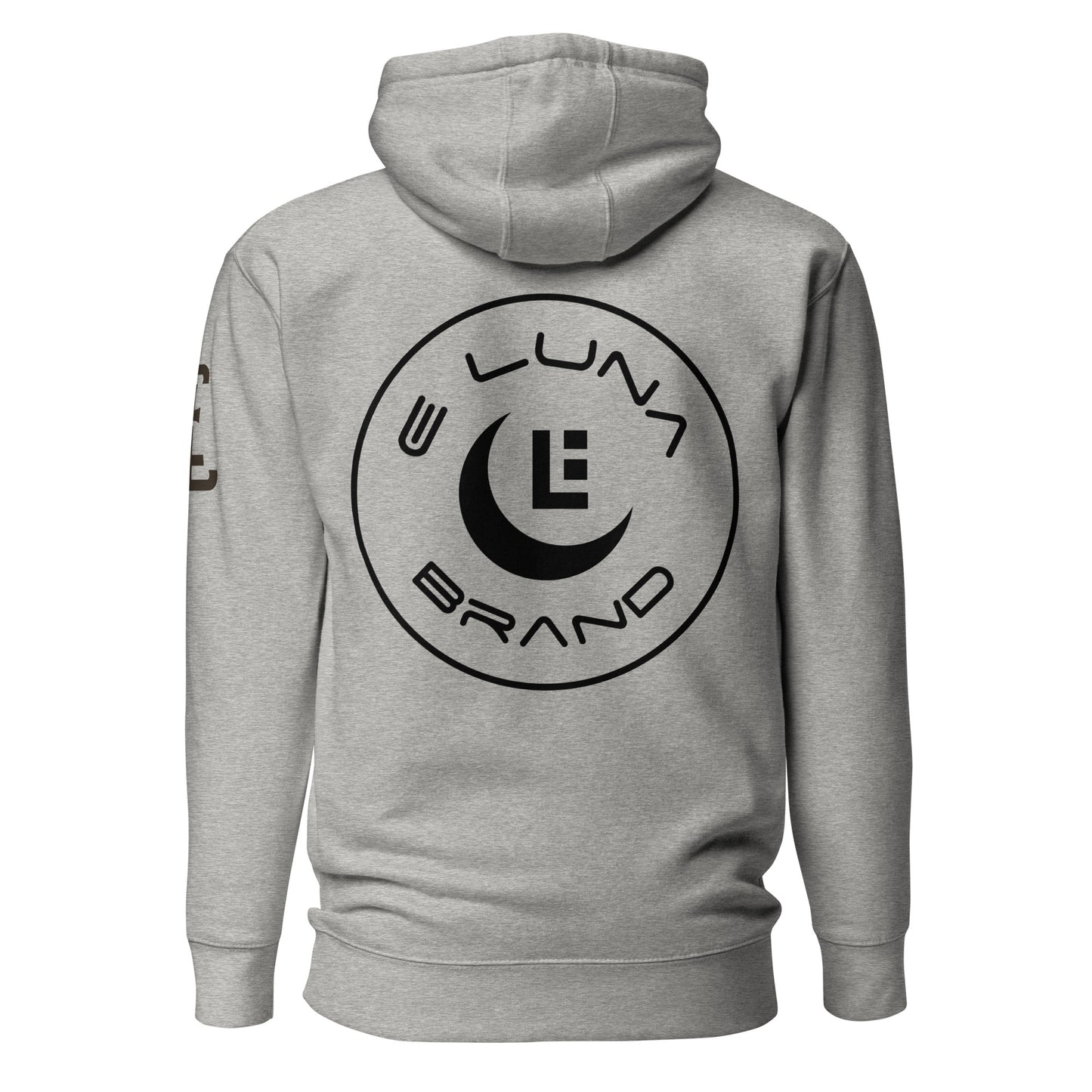 "BOX" Unisex Premium Hoodie | Cotton Heritage M2580 | E Luna Brand ELEMENT Tricrest 3 Black Logos: Front Upper Left, Left Arm & Back (Large)