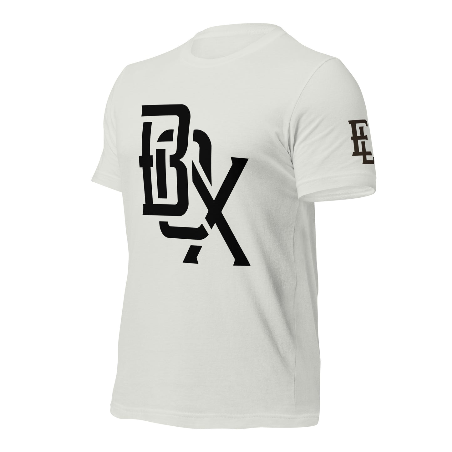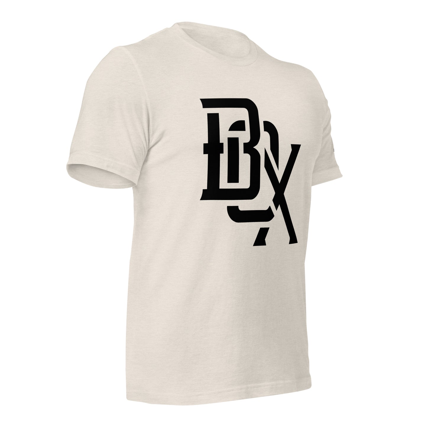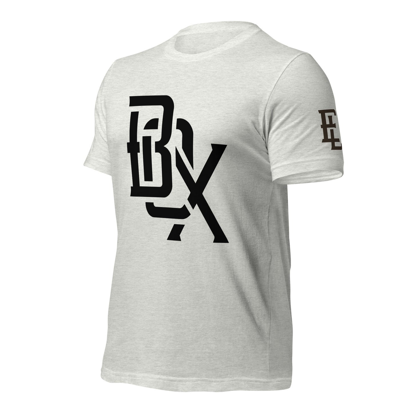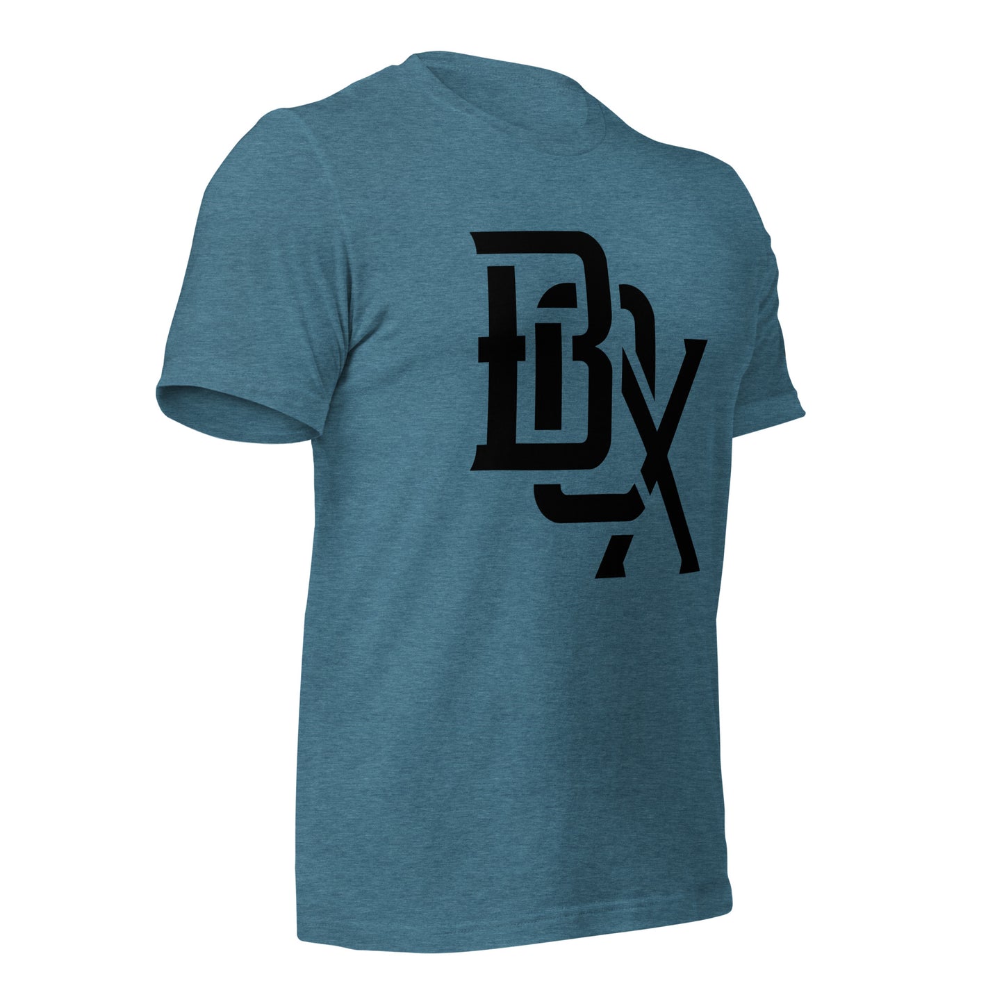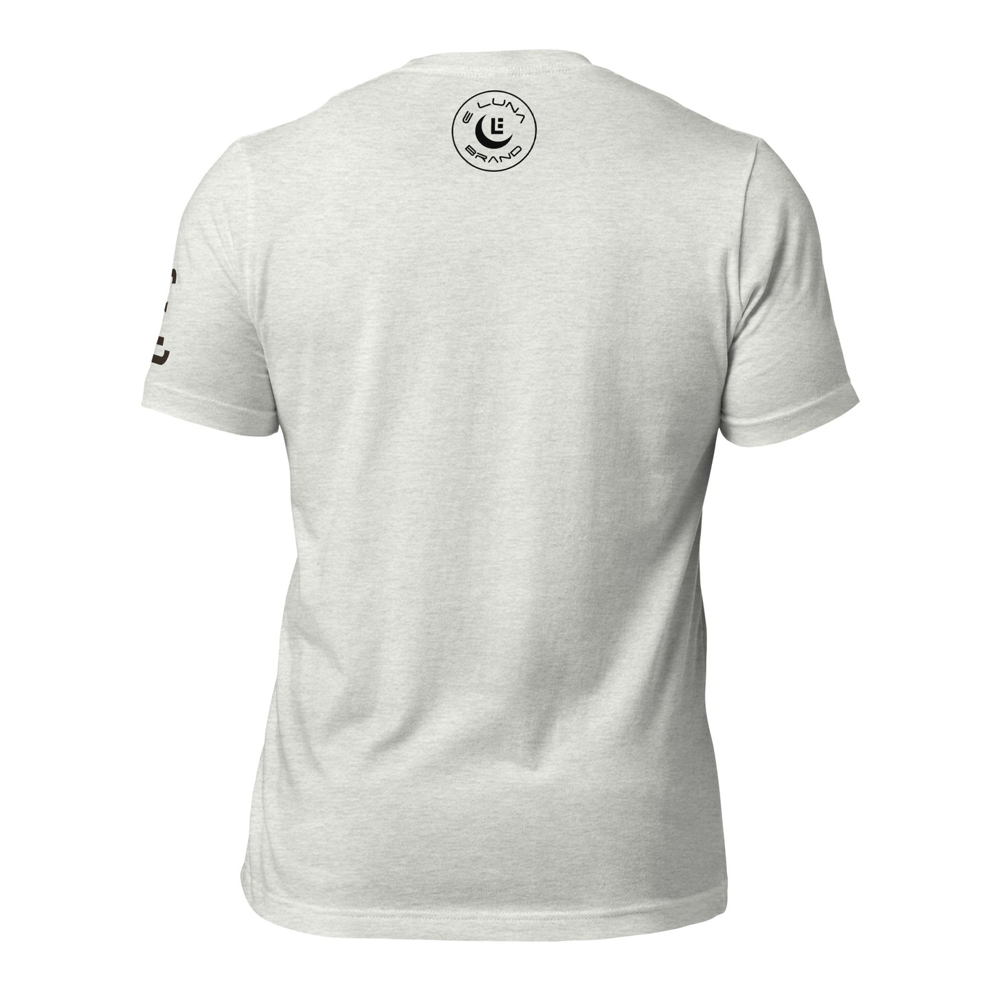 "BOX" Unisex Staple T-Shirt | Bella + Canvas 3001 | E Luna Brand ESSENCE Tricrest 3 Black Logos: Front Center (Large), Left Arm & Outside Back Label
