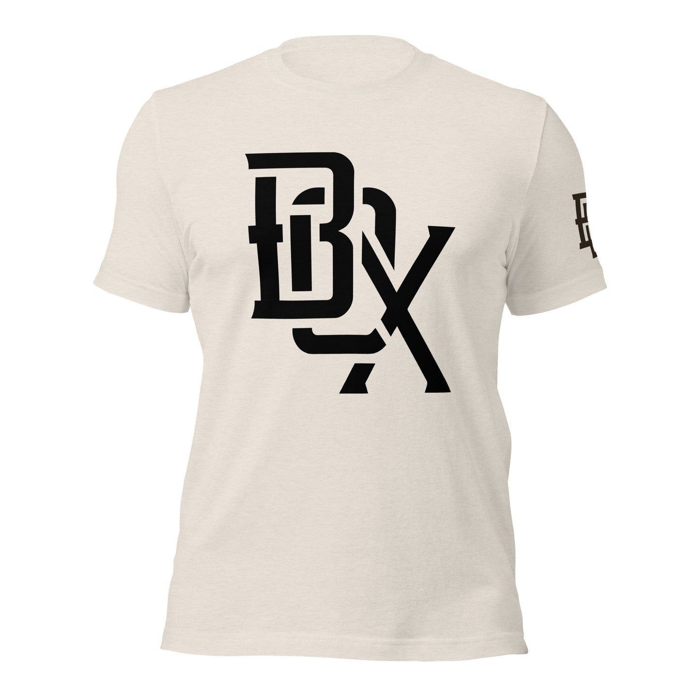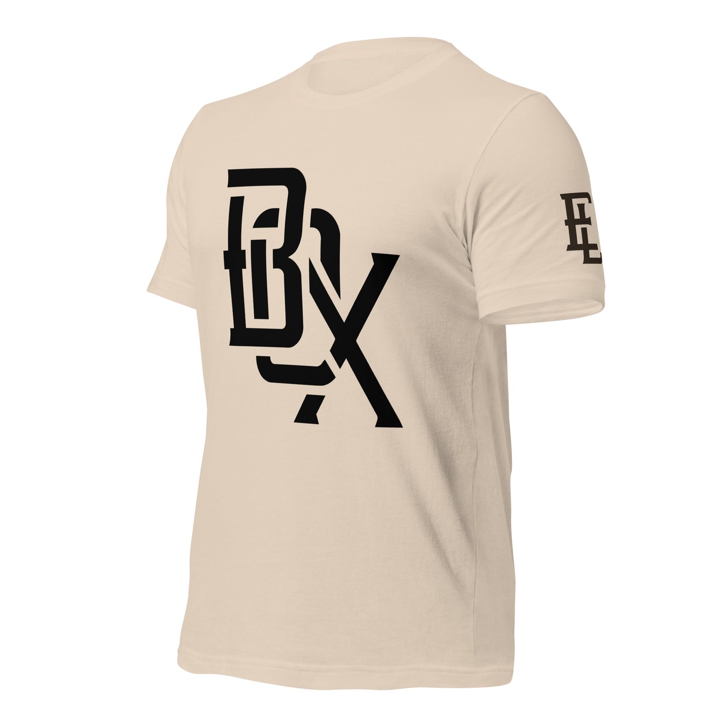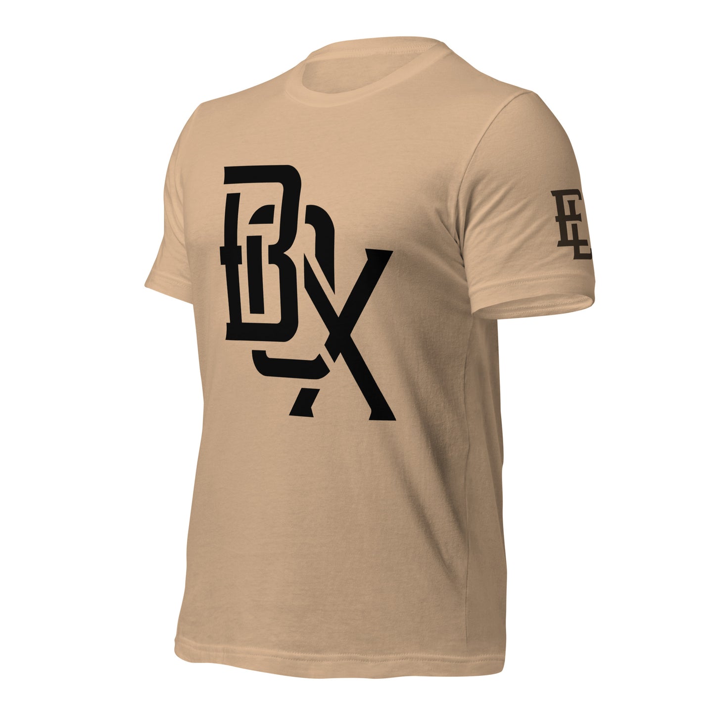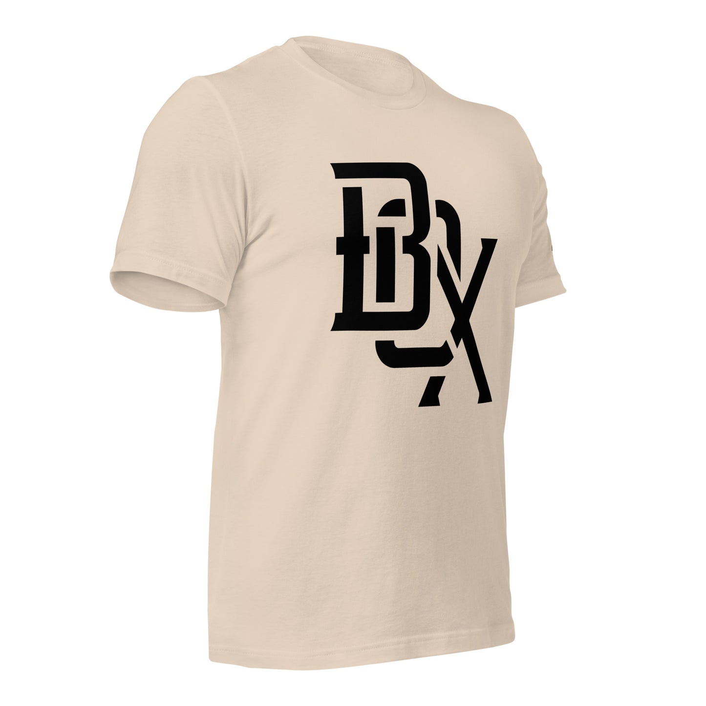 "BOX" Unisex Staple T-Shirt | Bella + Canvas 3001 | E Luna Brand ESSENCE Tricrest 3 Black Logos: Front Center (Large), Left Arm & Outside Back Label