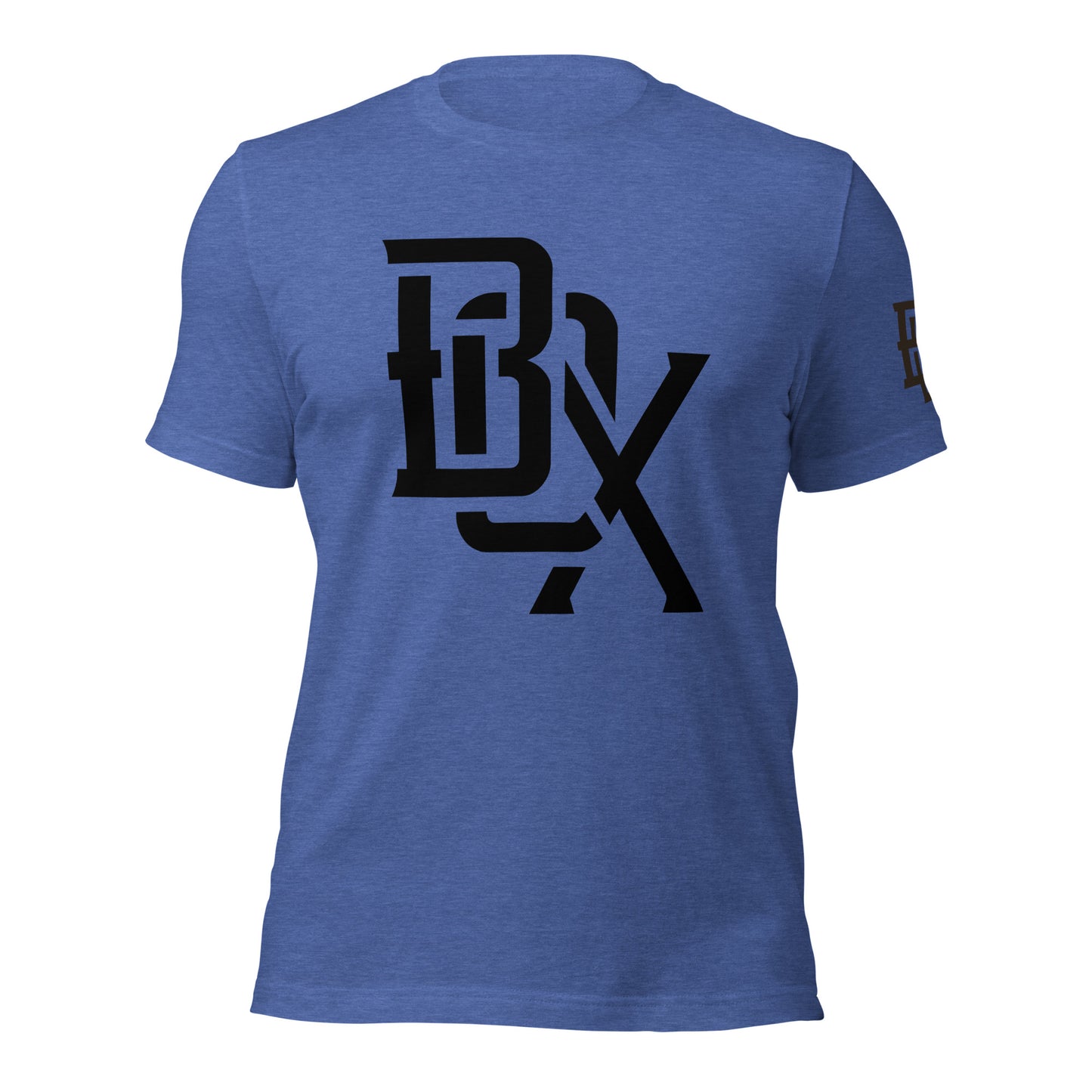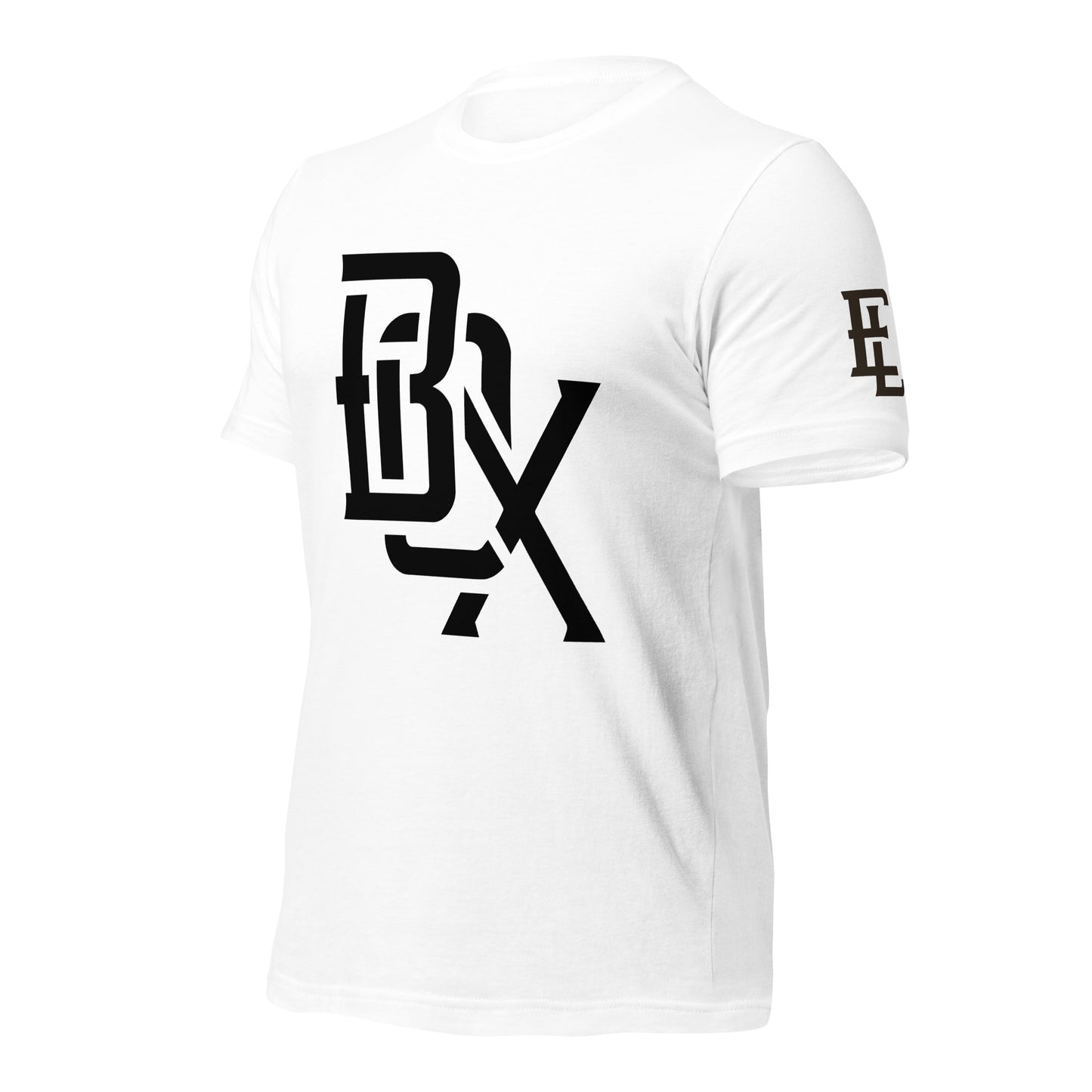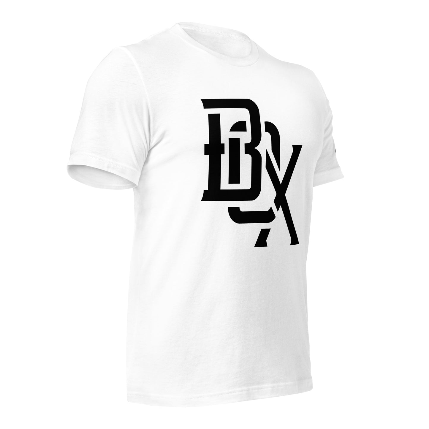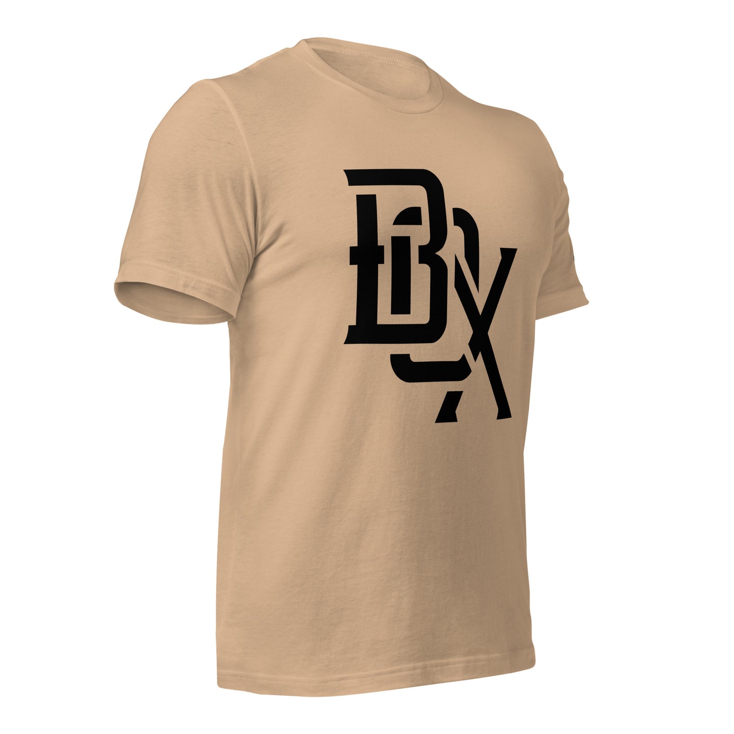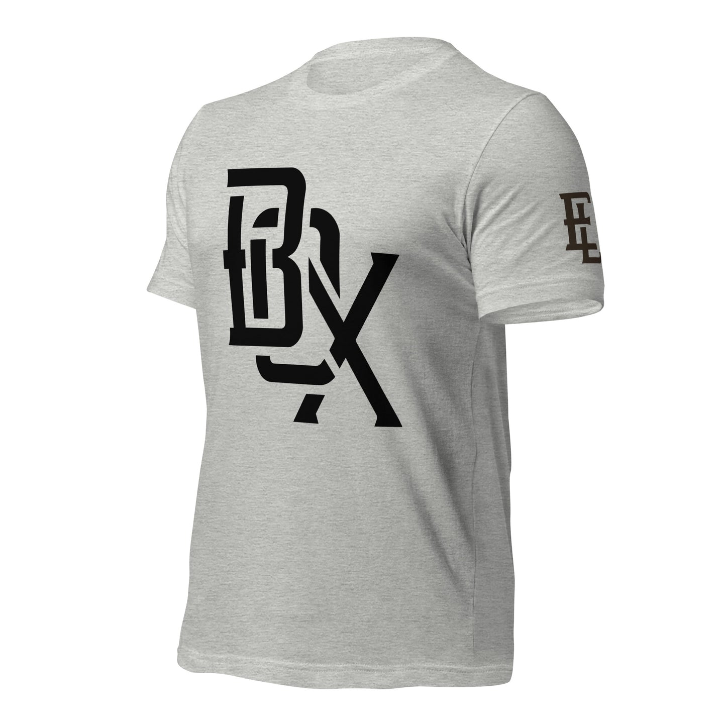 "BOX" Unisex Staple T-Shirt | Bella + Canvas 3001 | E Luna Brand ESSENCE Tricrest 3 Black Logos: Front Center (Large), Left Arm & Outside Back Label