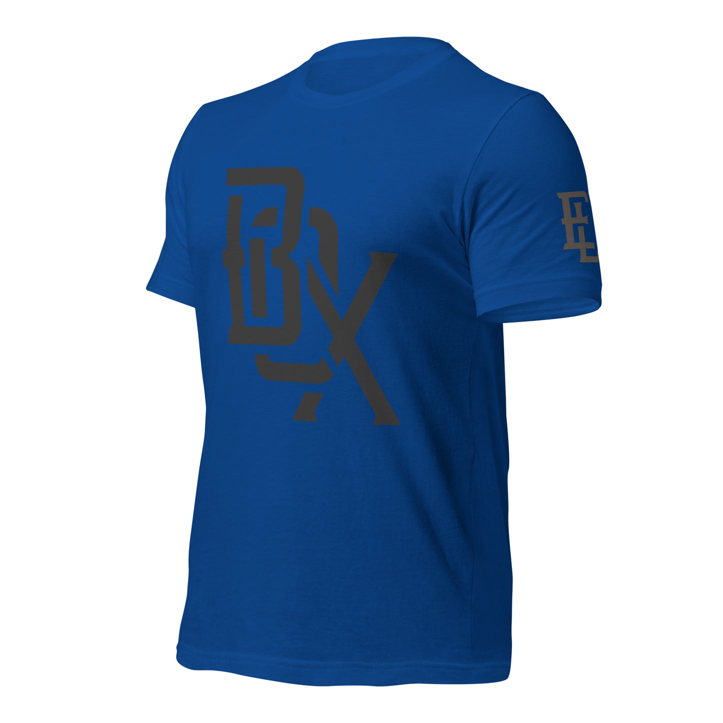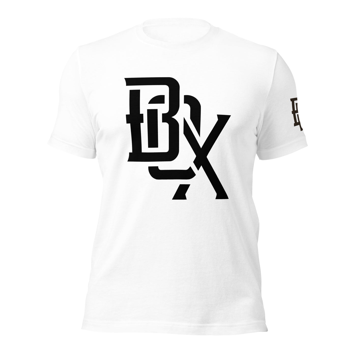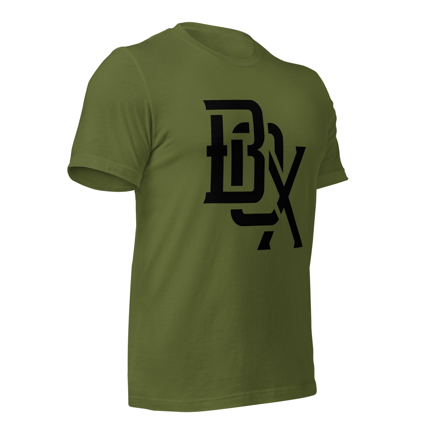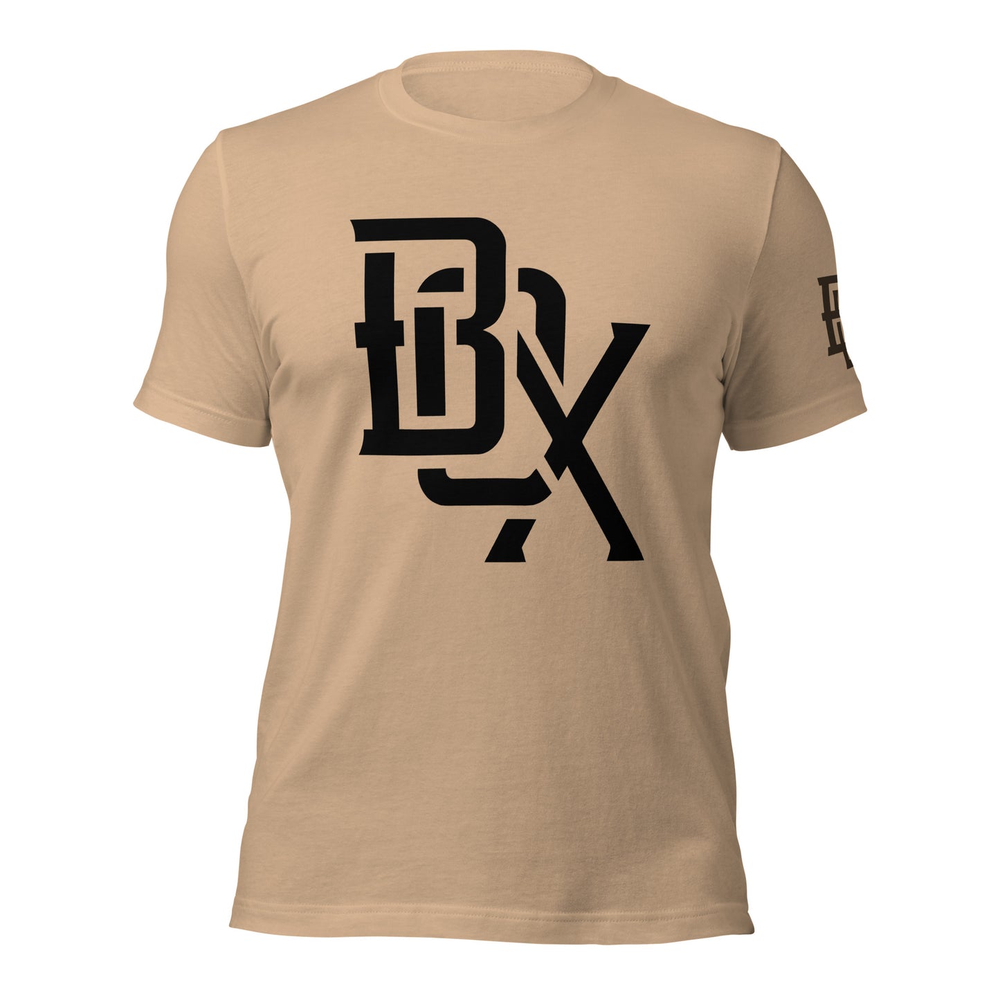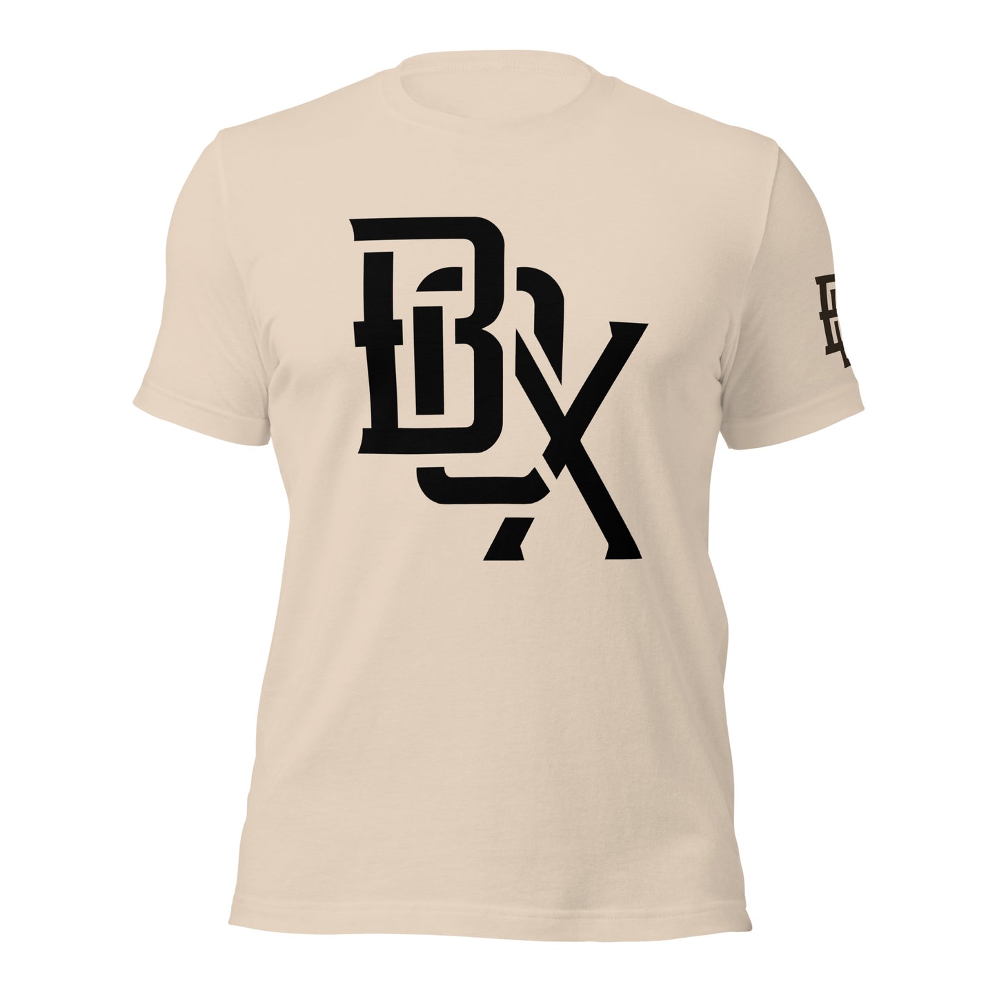 "BOX" Unisex Staple T-Shirt | Bella + Canvas 3001 | E Luna Brand ESSENCE Tricrest 3 Black Logos: Front Center (Large), Left Arm & Outside Back Label