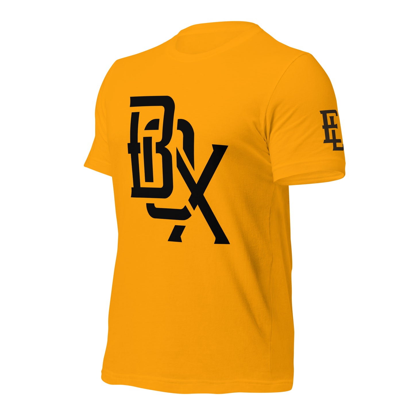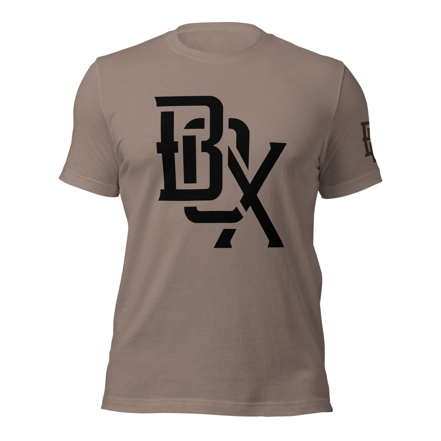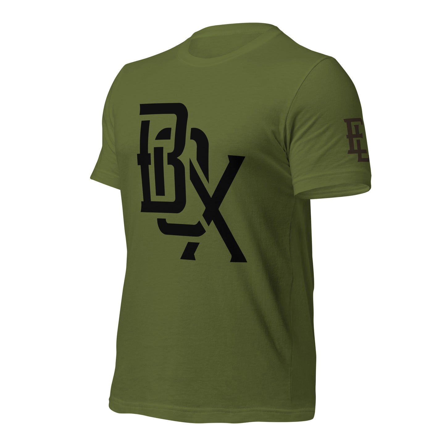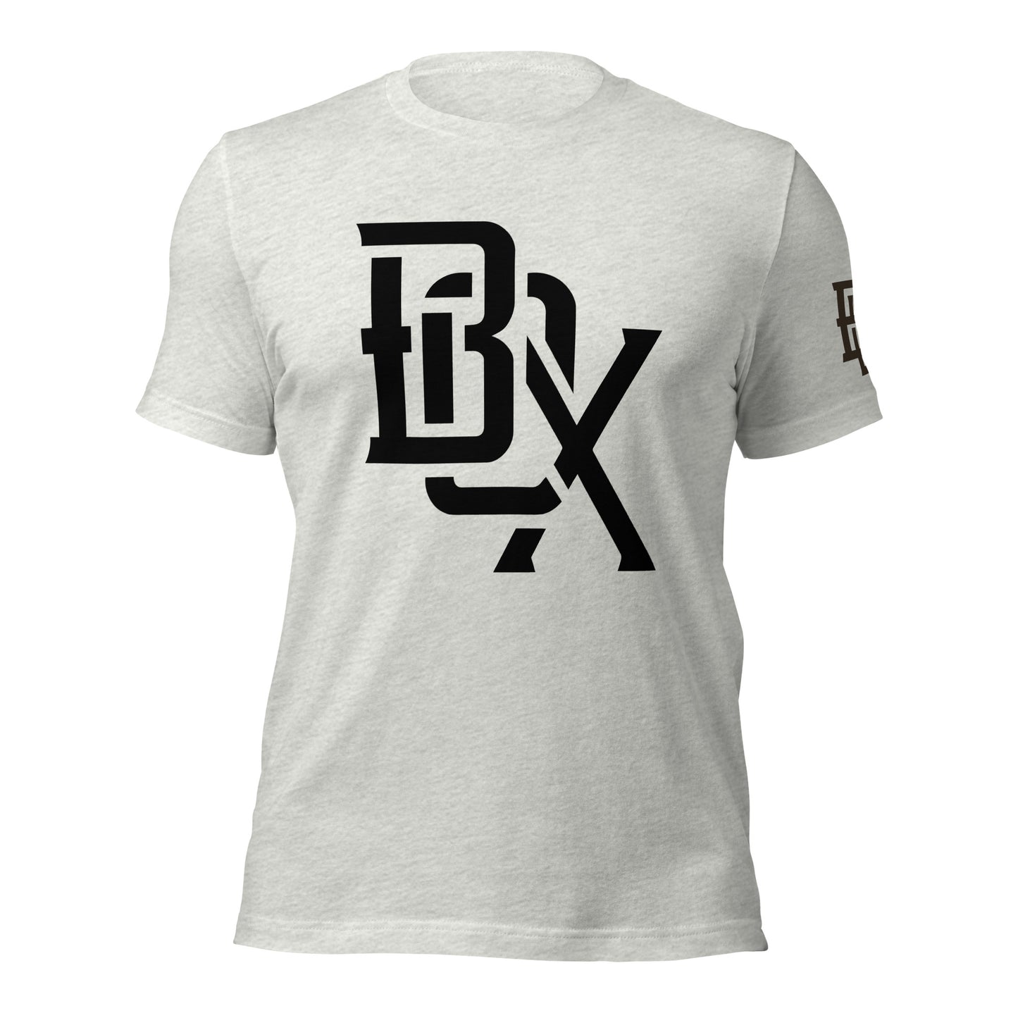 "BOX" Unisex Staple T-Shirt | Bella + Canvas 3001 | E Luna Brand ESSENCE Tricrest 3 Black Logos: Front Center (Large), Left Arm & Outside Back Label