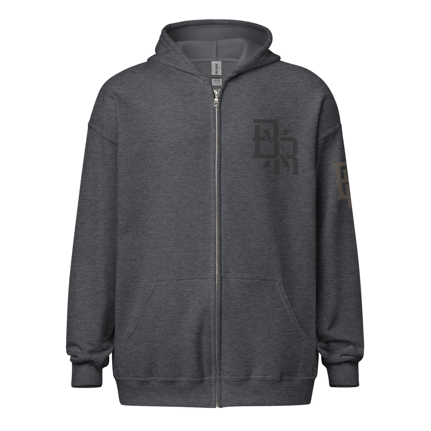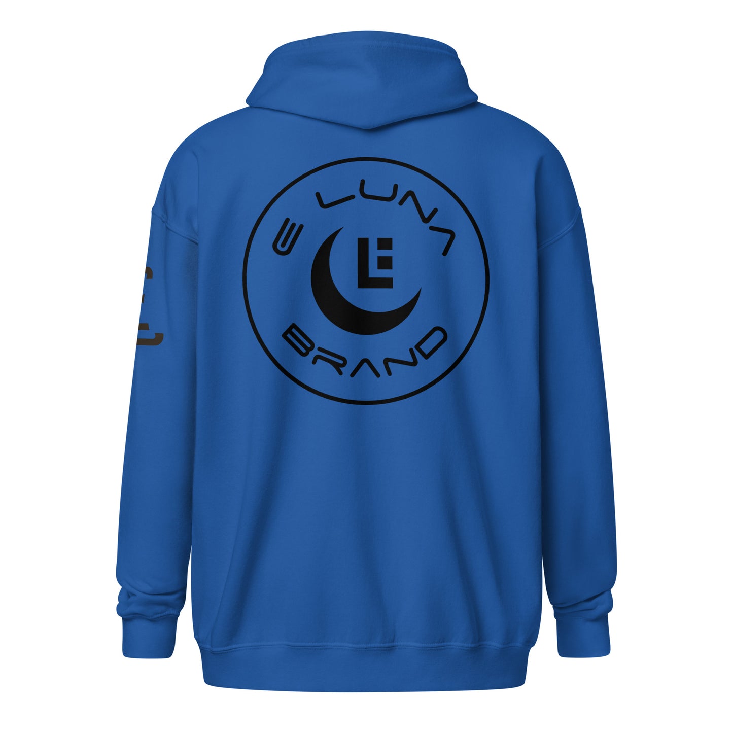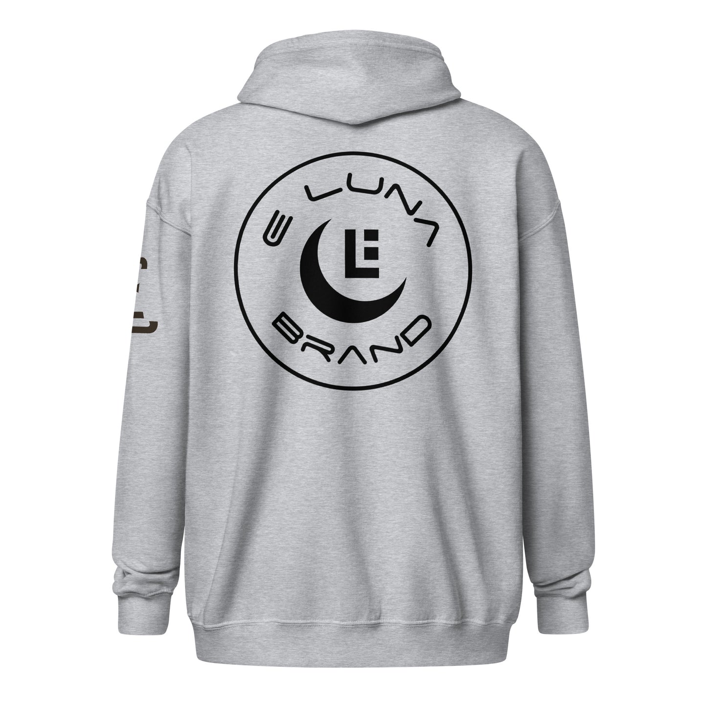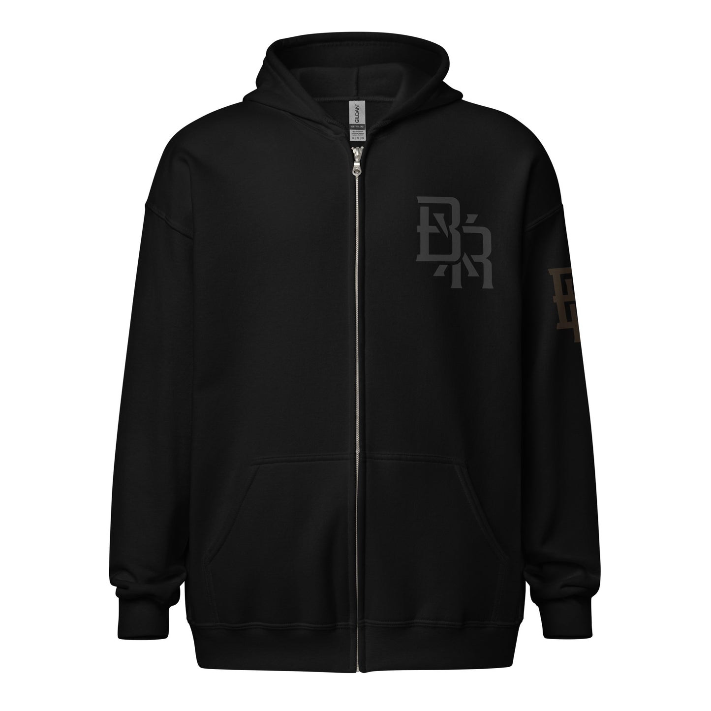 "BXR" Unisex Heavy Blend Zip Hoodie | Gildan 18600 | E Luna Brand ELEMENT Tricrest 3 Black Logos: Front Upper Left, Left Arm & Back (Large)