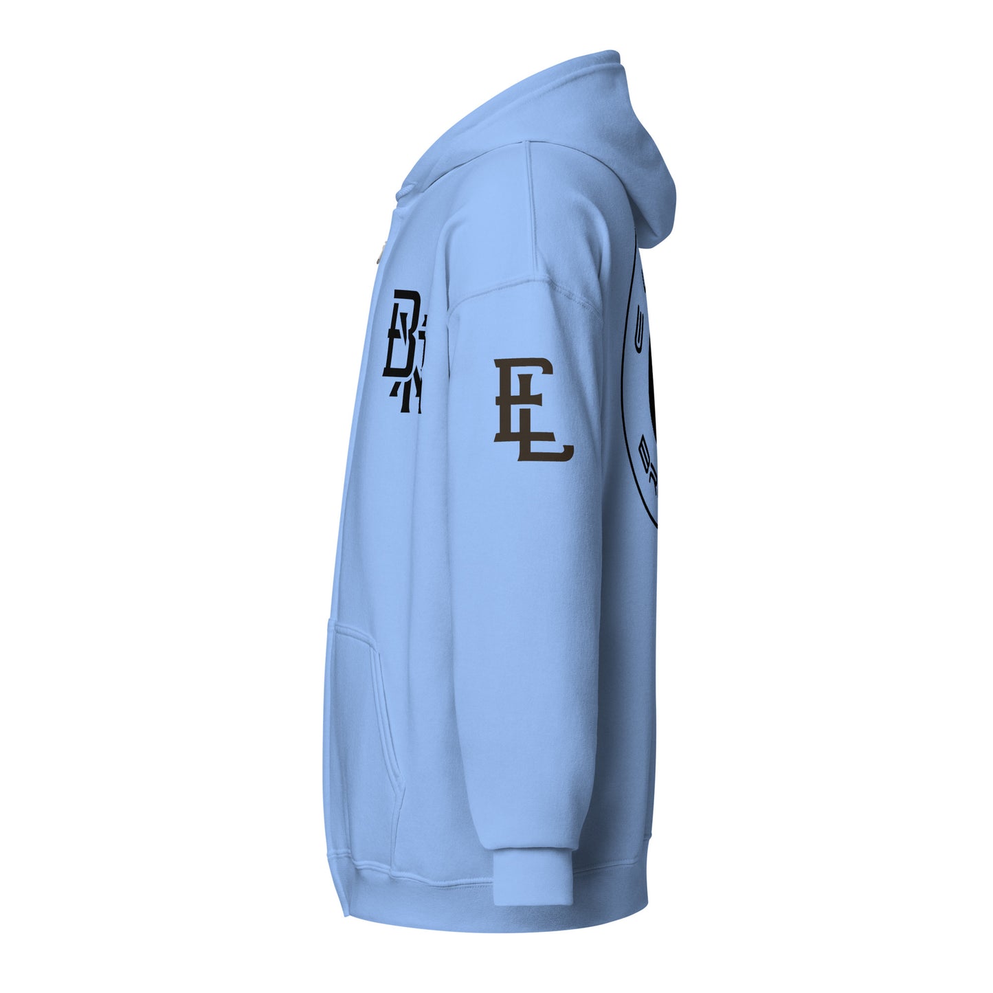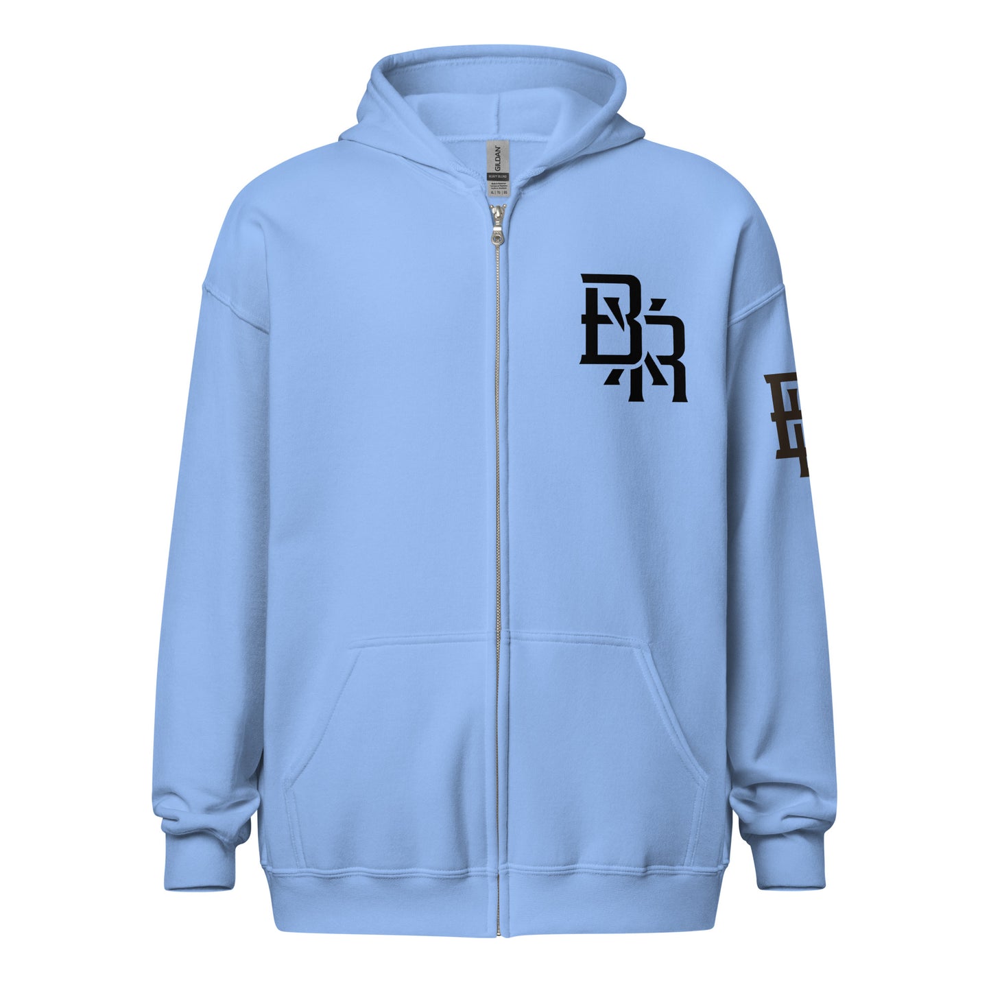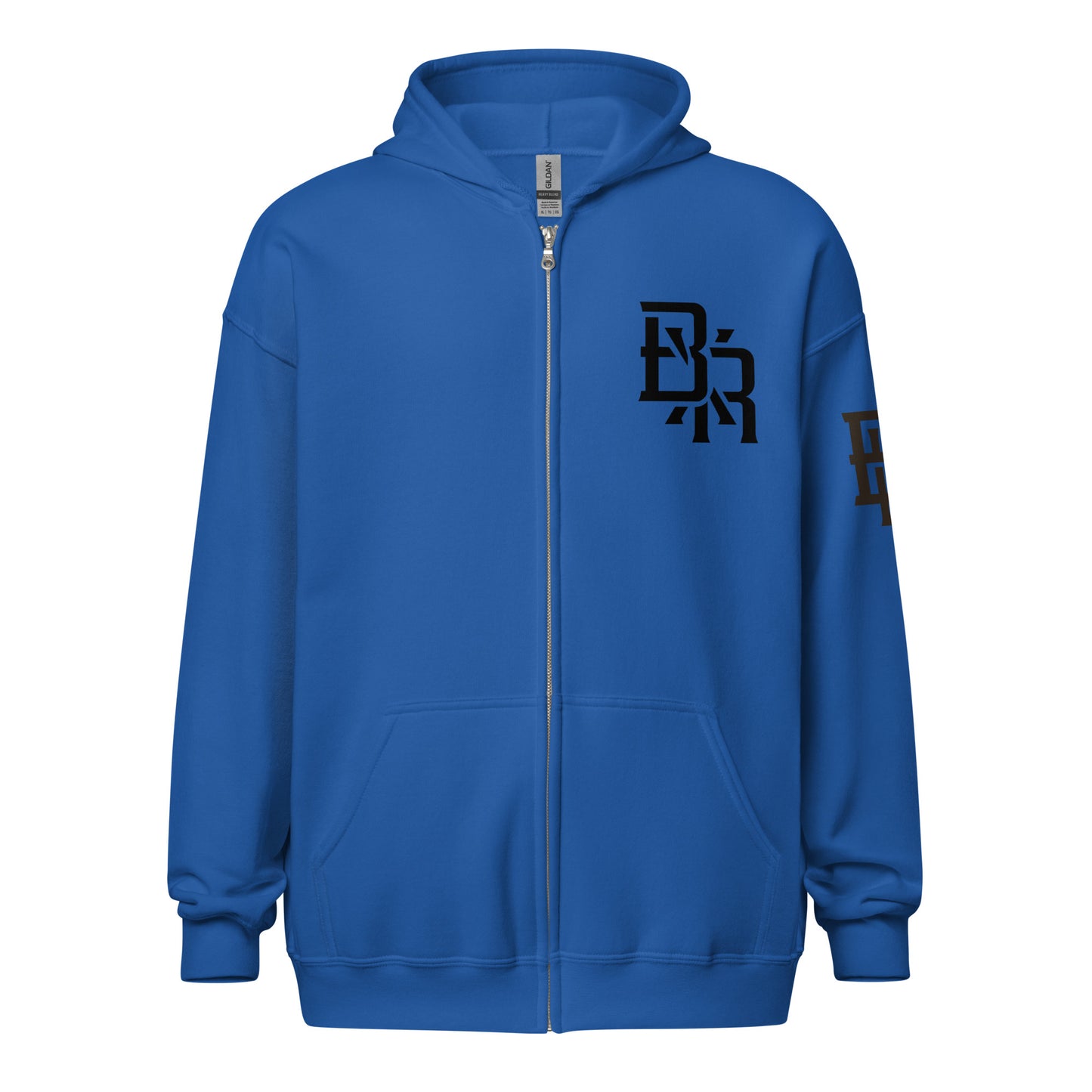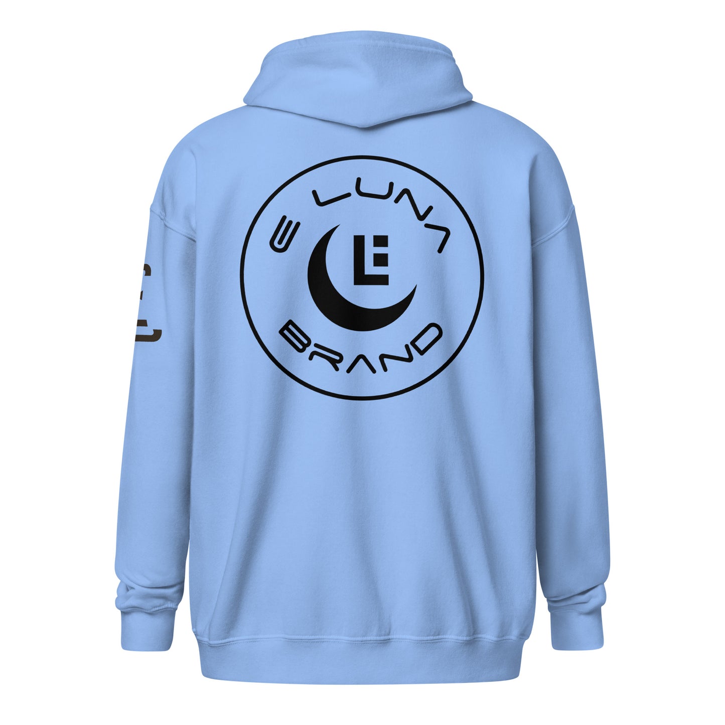 "BXR" Unisex Heavy Blend Zip Hoodie | Gildan 18600 | E Luna Brand ELEMENT Tricrest 3 Black Logos: Front Upper Left, Left Arm & Back (Large)
