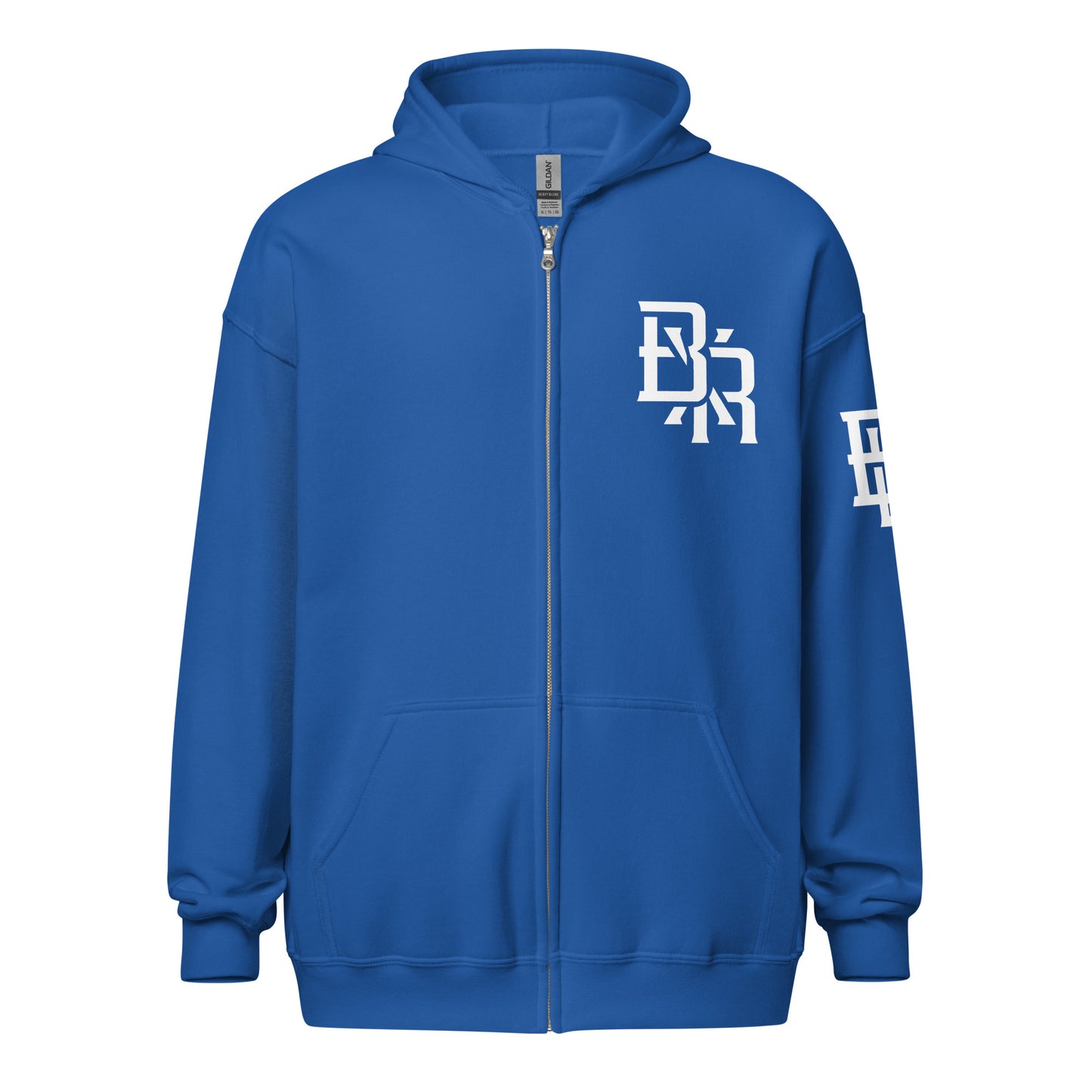 "BXR" Unisex Heavy Blend Zip Hoodie | Gildan 18600 | E Luna Brand ESSENCE Tricrest 3 White Logos: Front Upper Left, Left Arm & Outside Back Label