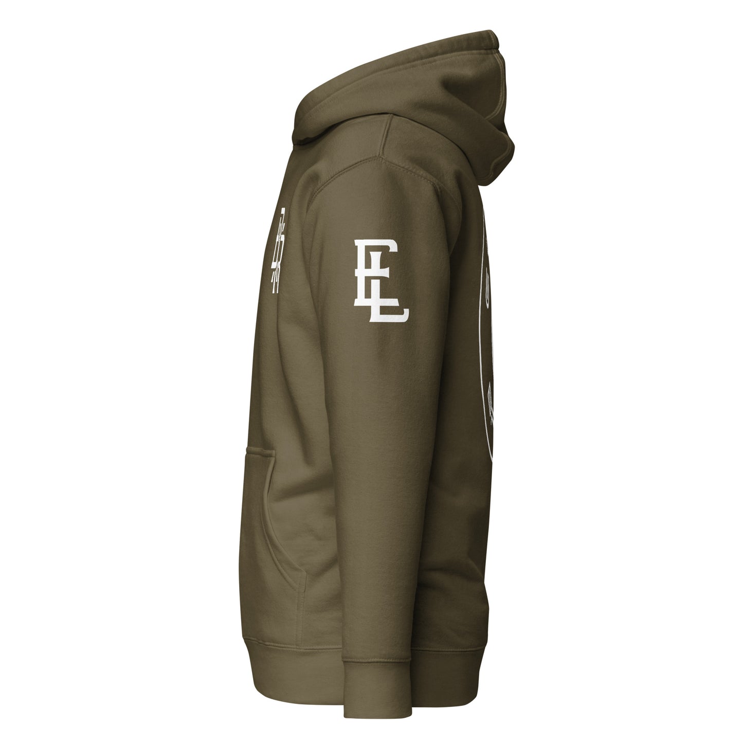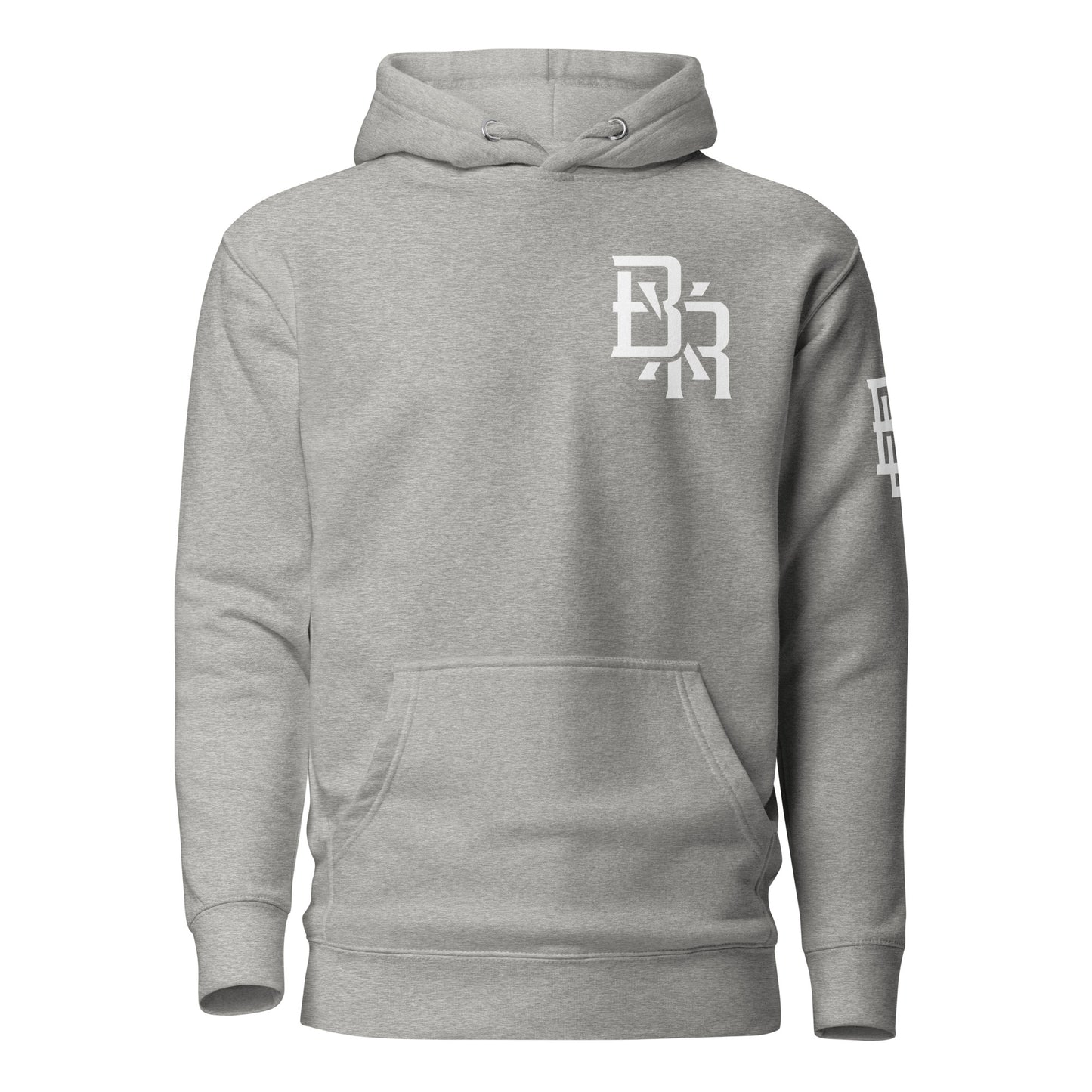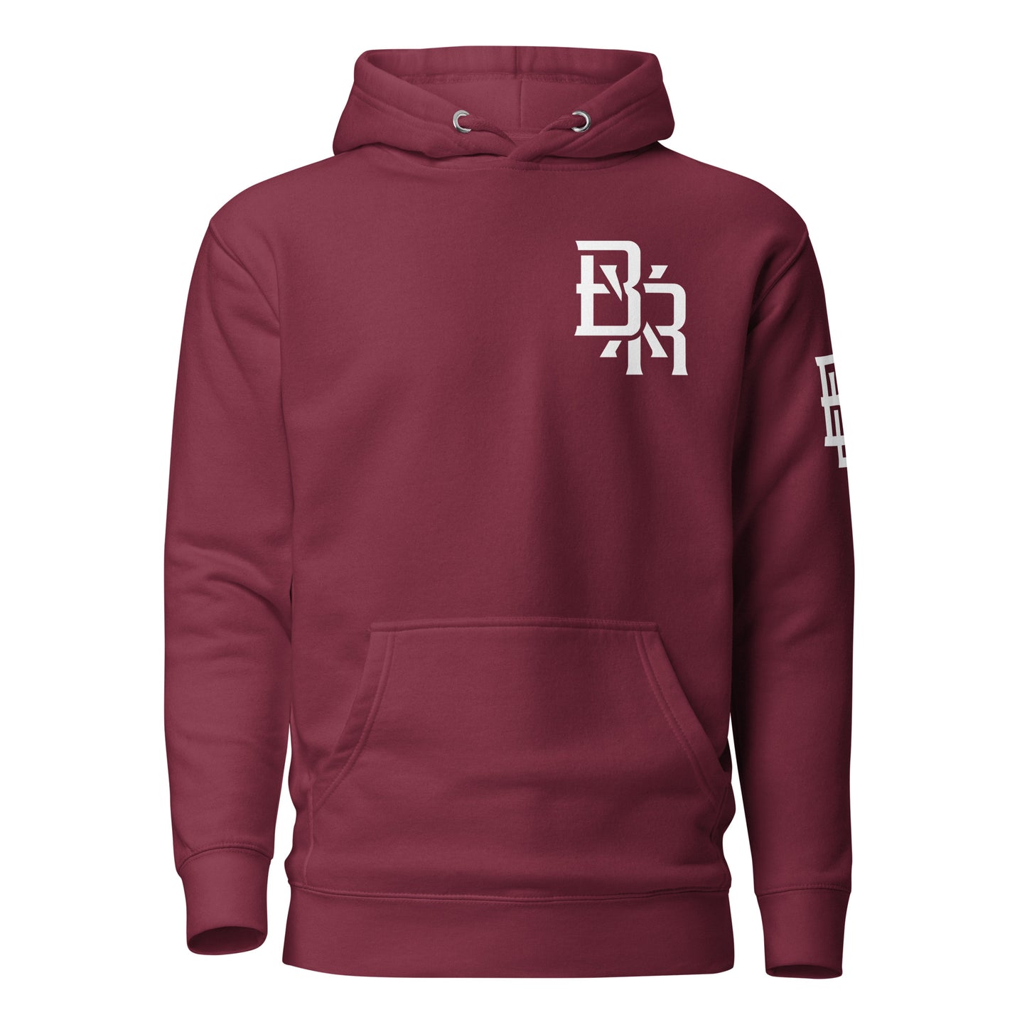 "BXR" Unisex Premium Hoodie | Cotton Heritage M2580 | E Luna Brand ELEMENT Tricrest 3 White Logos: Front Upper Left, Left Arm & Back (Large)