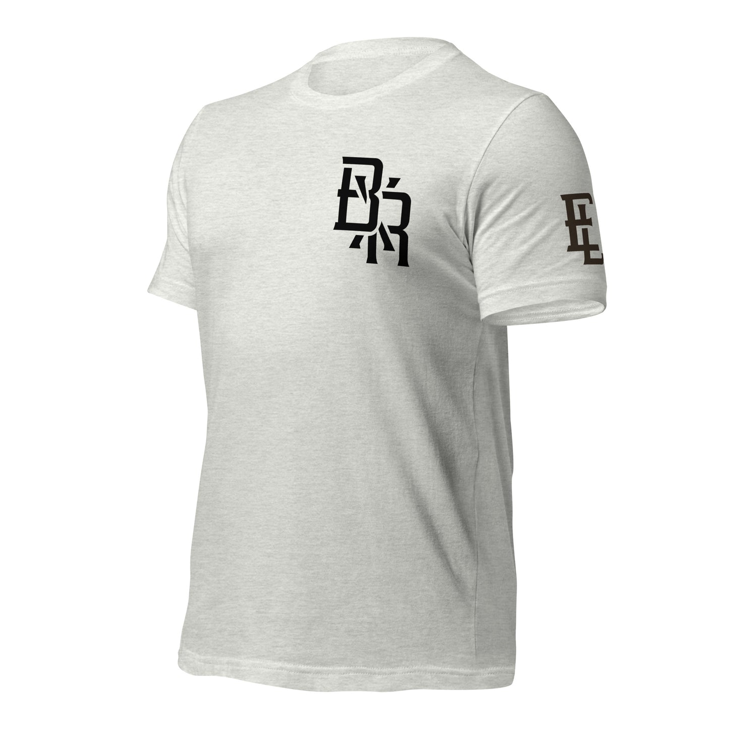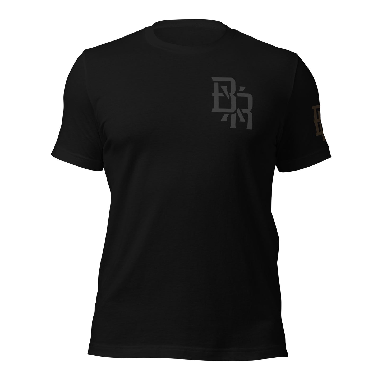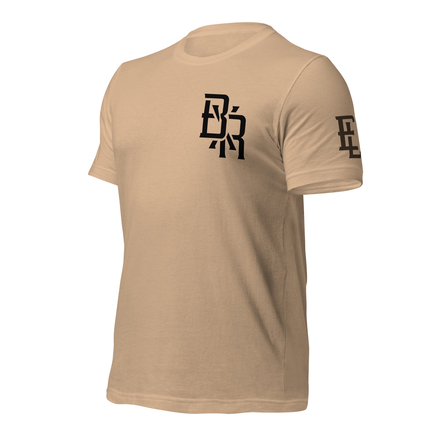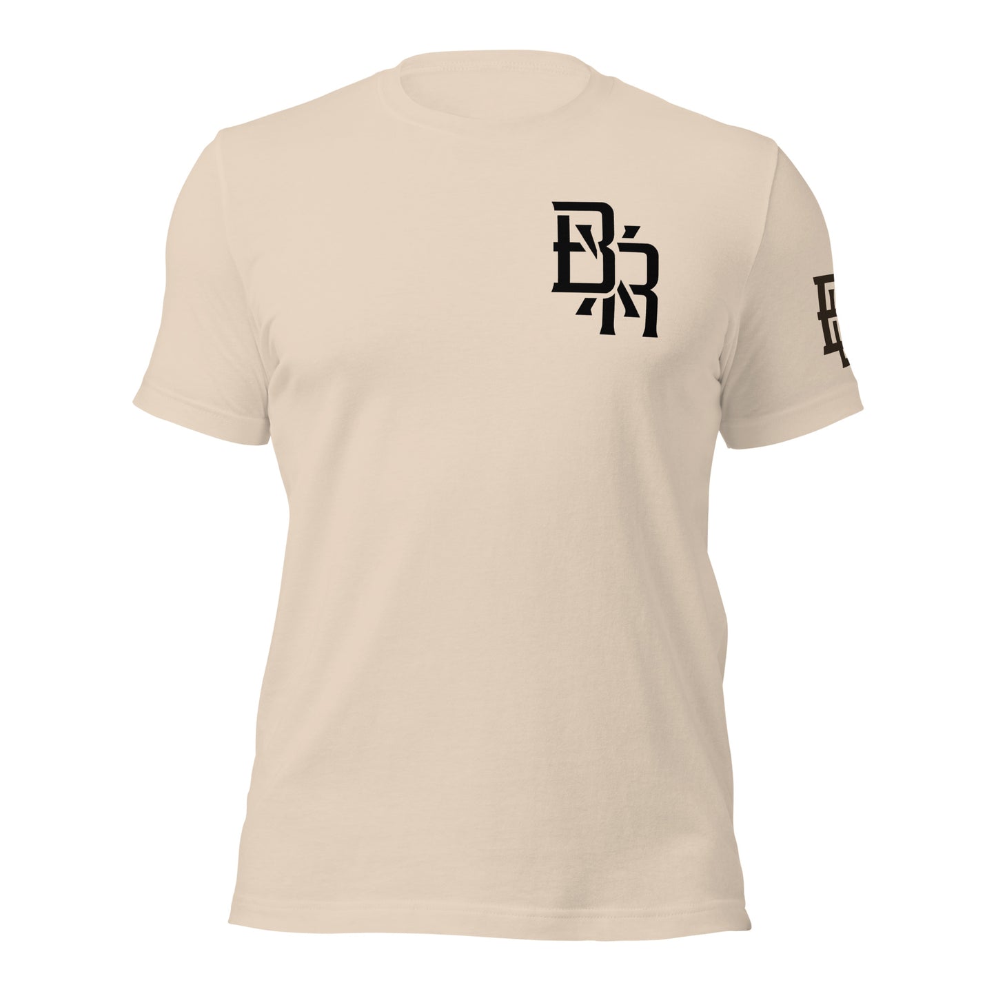 "BXR" Unisex Staple T-Shirt | Bella + Canvas 3001 | E Luna Brand ESSENCE Tricrest 3 Black Logos: Front Upper Left, Left Arm & Outside Back Label