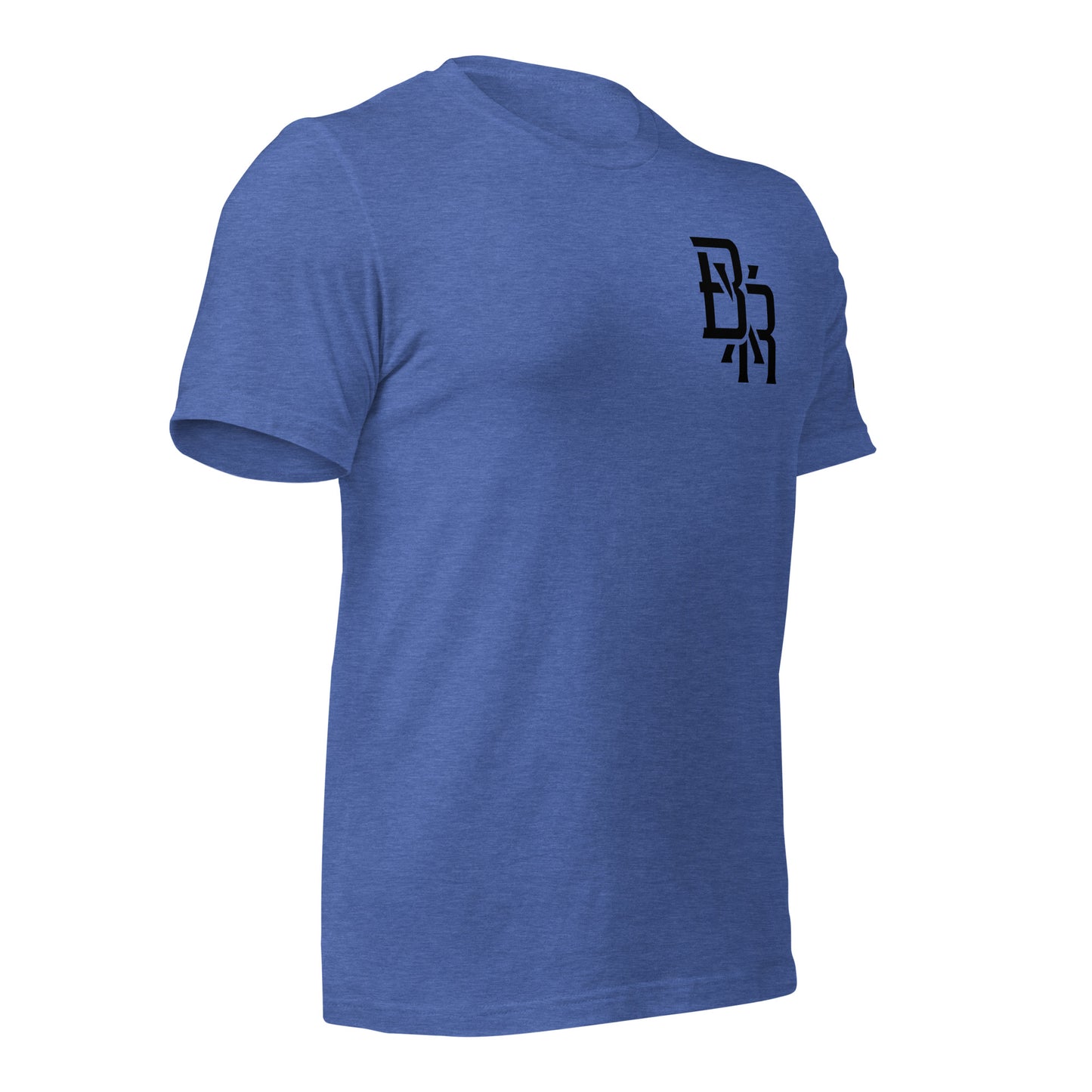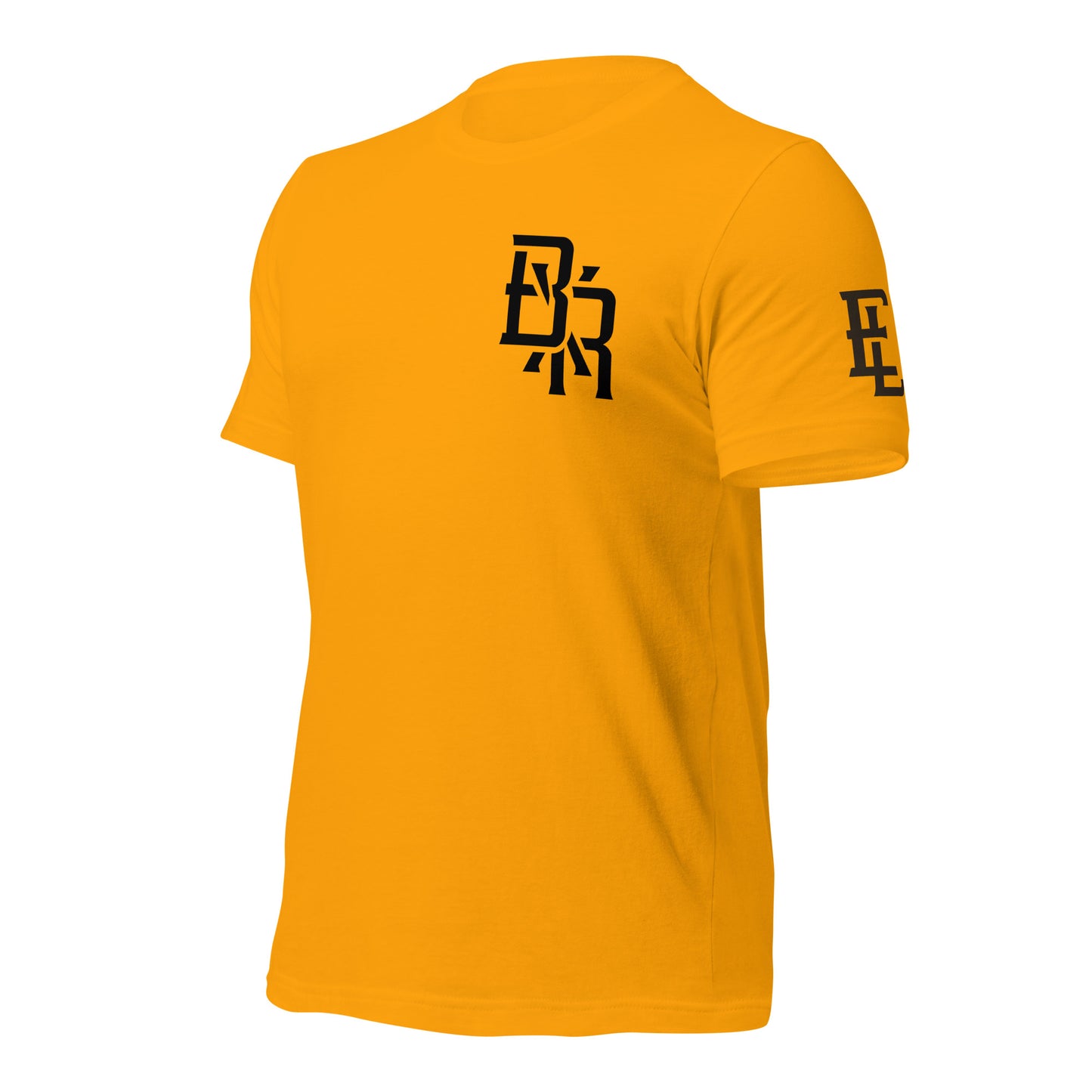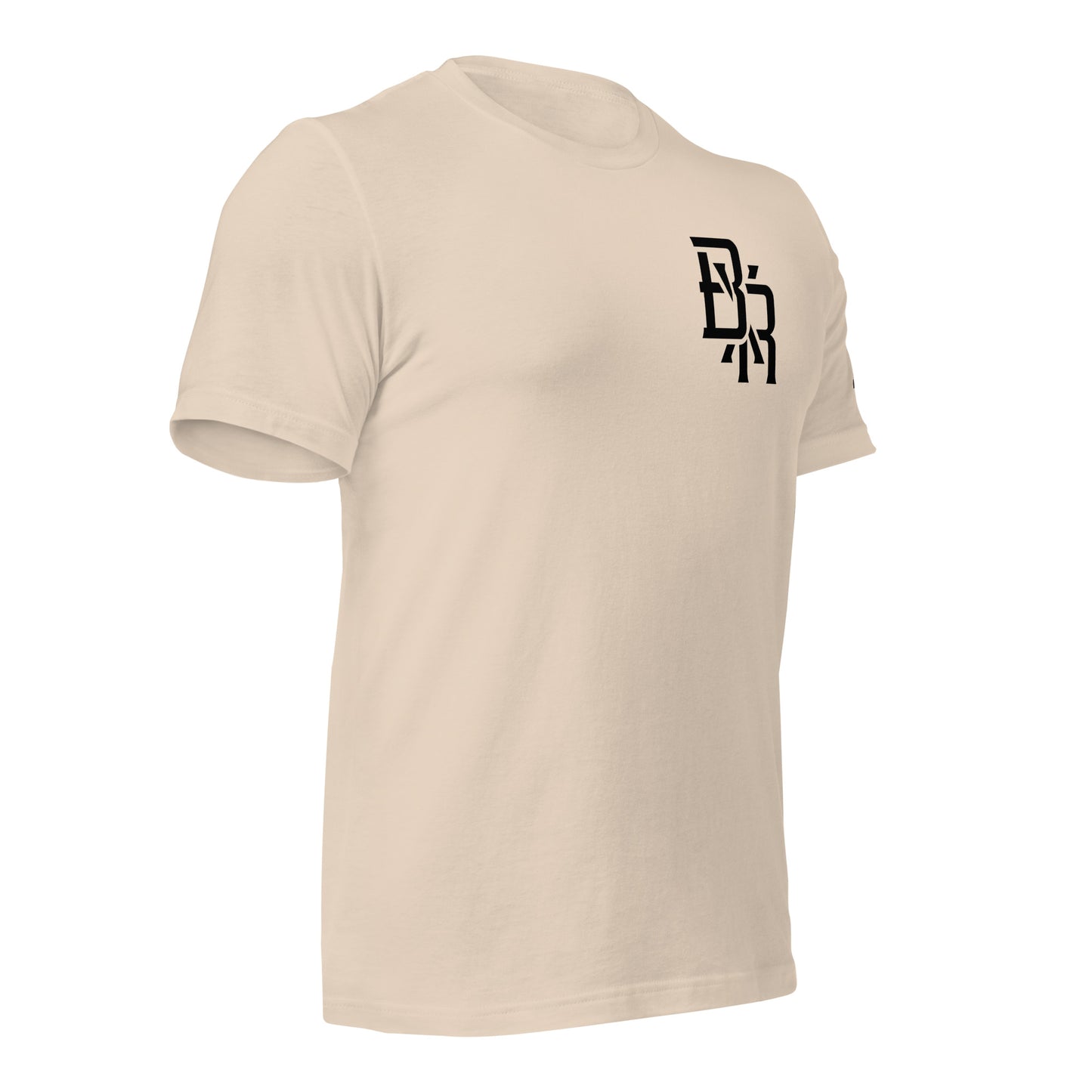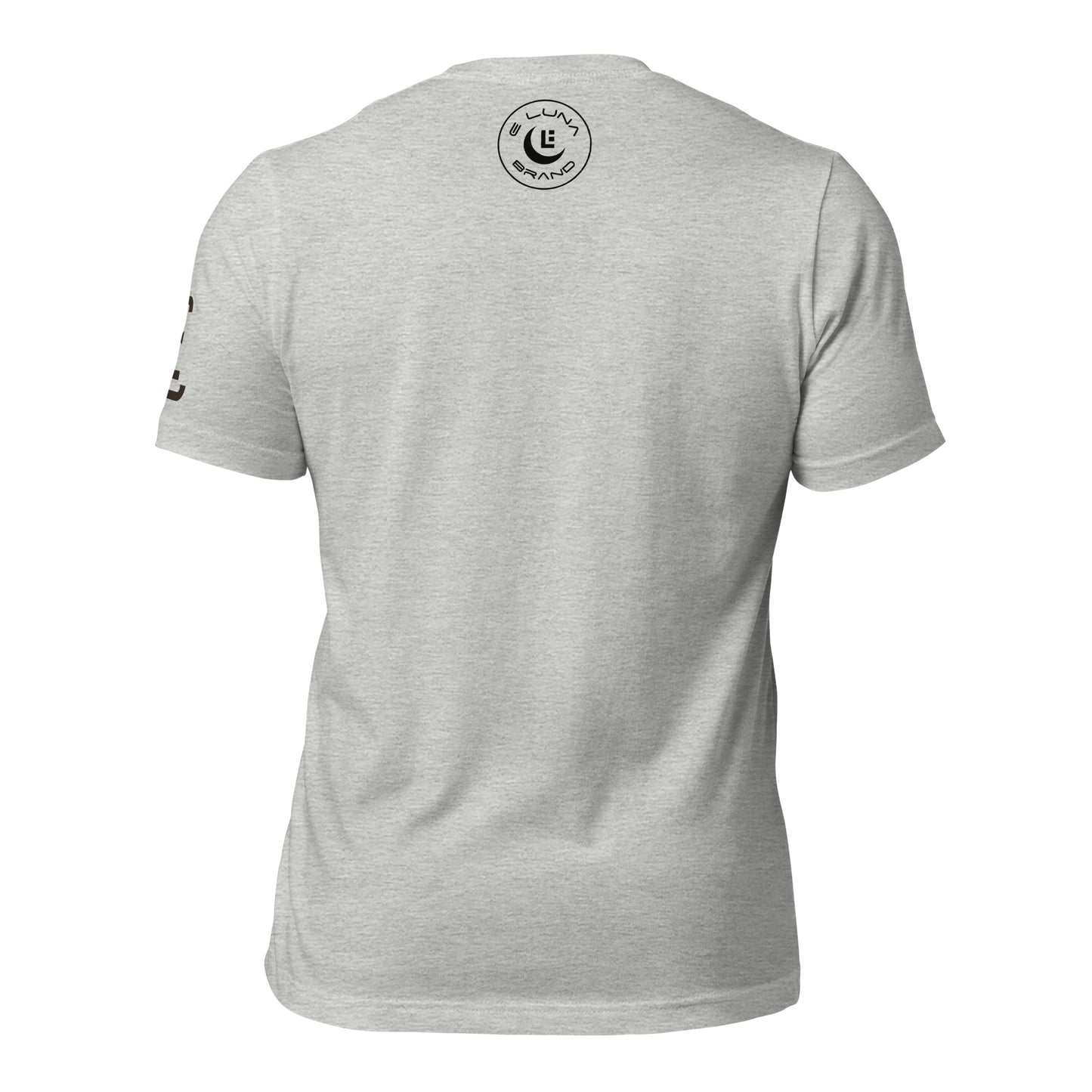 "BXR" Unisex Staple T-Shirt | Bella + Canvas 3001 | E Luna Brand ESSENCE Tricrest 3 Black Logos: Front Upper Left, Left Arm & Outside Back Label