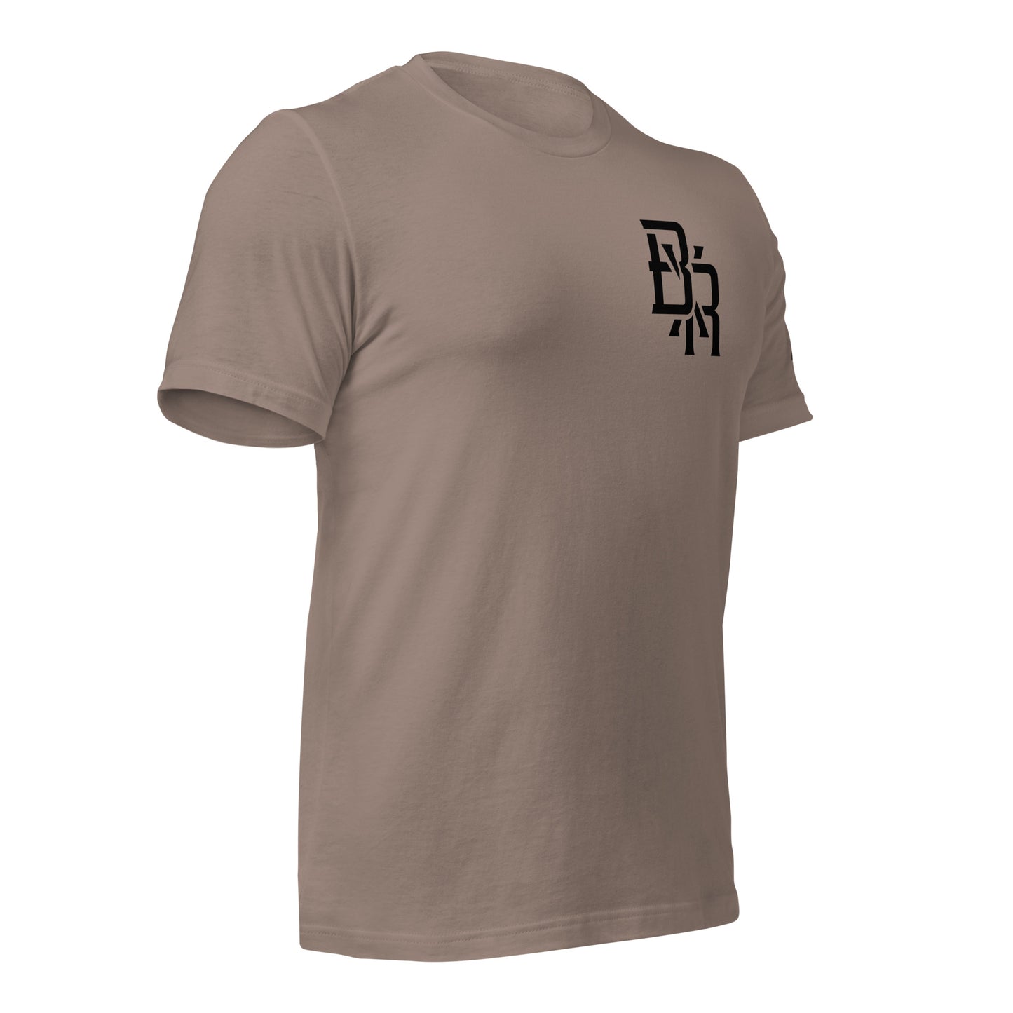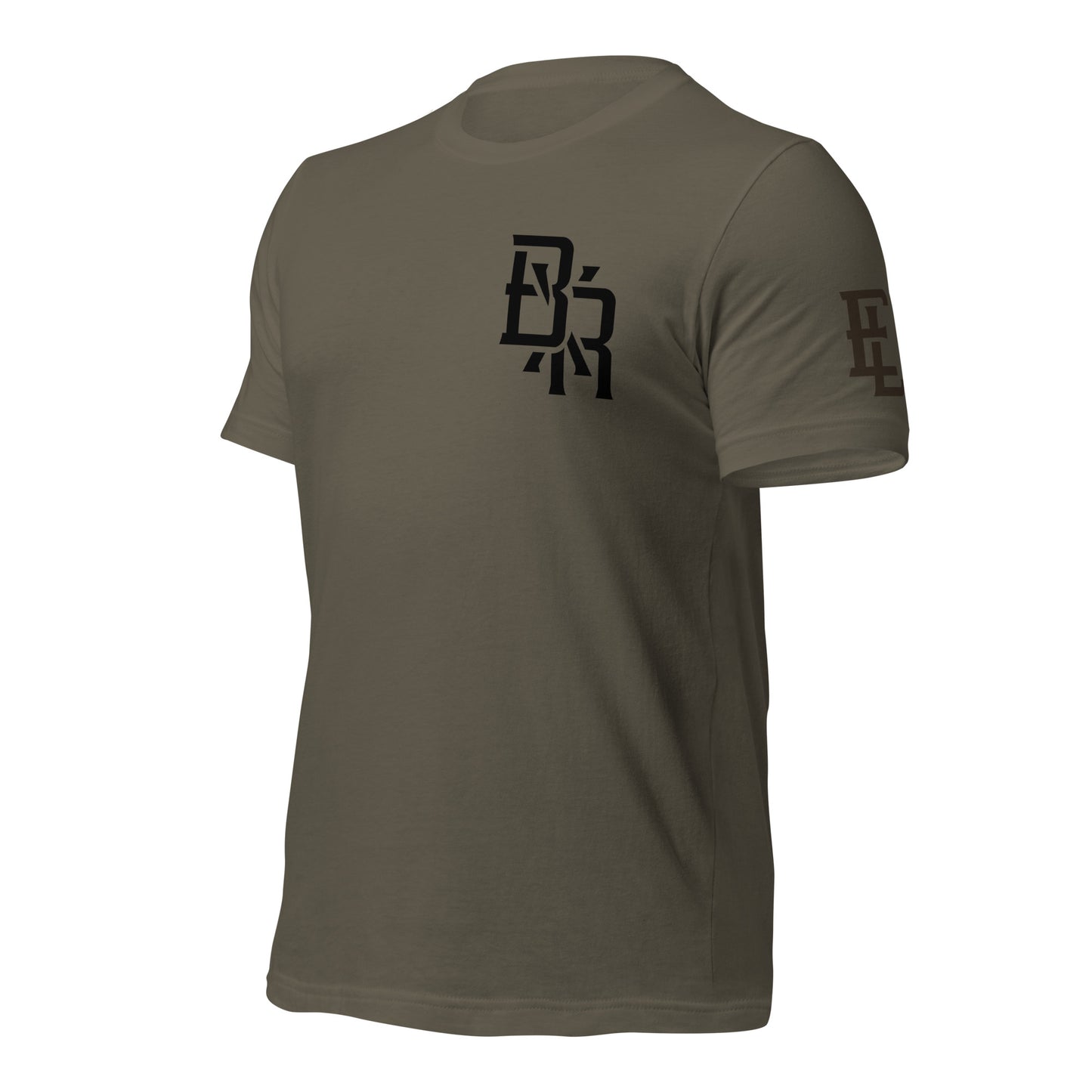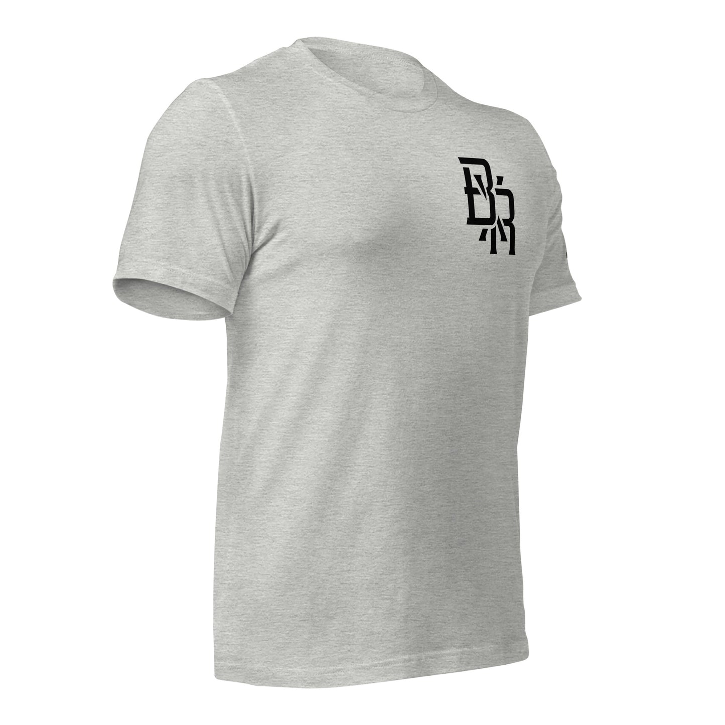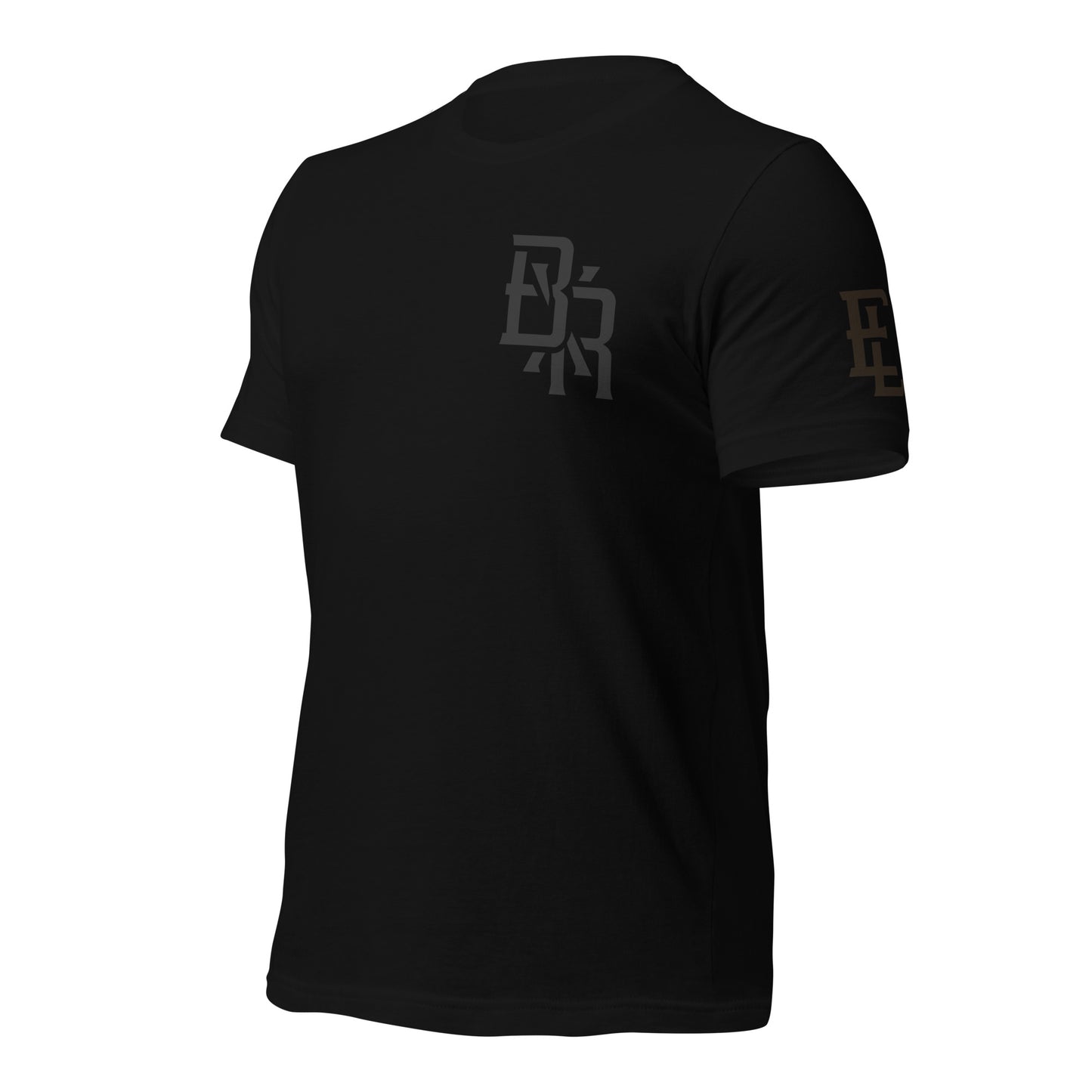 "BXR" Unisex Staple T-Shirt | Bella + Canvas 3001 | E Luna Brand ESSENCE Tricrest 3 Black Logos: Front Upper Left, Left Arm & Outside Back Label