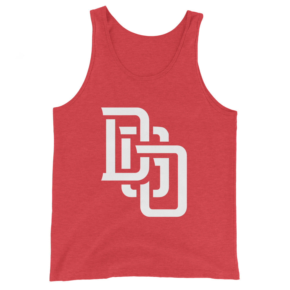"DGO" Men’s Staple Tank Top | Bella + Canvas 3480 | E Luna Brand CHOICE Duocrest 2 White Logos: Front Center (Large) & Outside Back Label