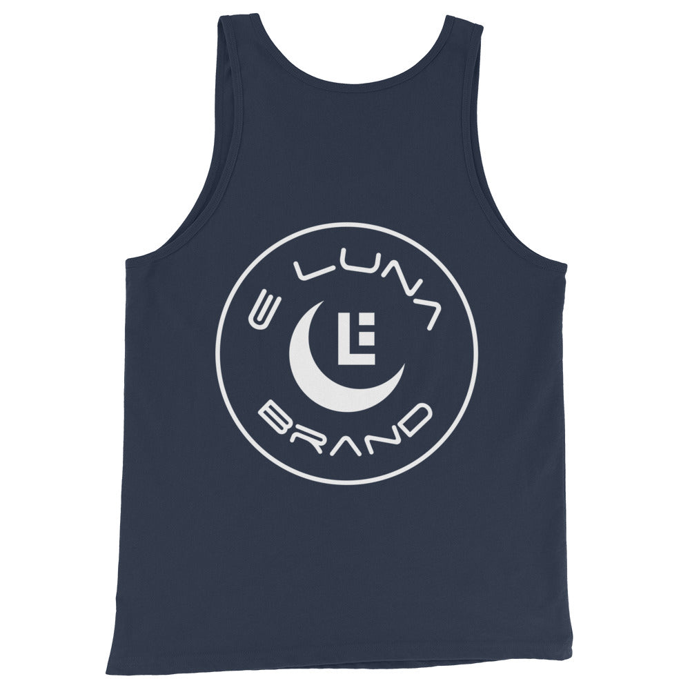 "DGO" Men’s Staple Tank Top | Bella + Canvas 3480 | E Luna Brand CHOICE Duocrest 2 White Logos: Front Center (Large) & Back (Large)