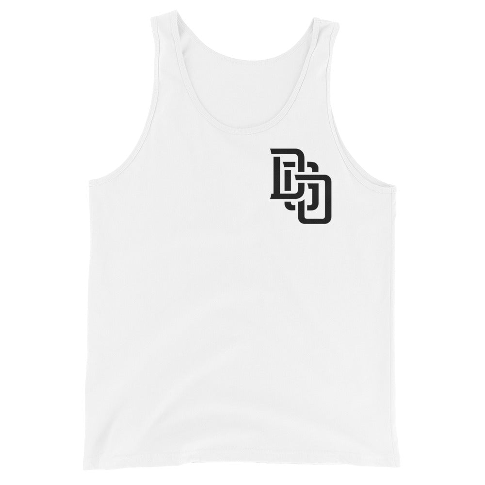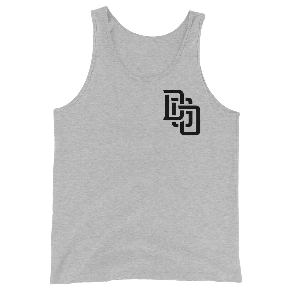 "DGO" Men’s Staple Tank Top | Bella + Canvas 3480 | E Luna Brand CHOICE Duocrest 2 Black Logos: Front Upper Left & Outside Back Label