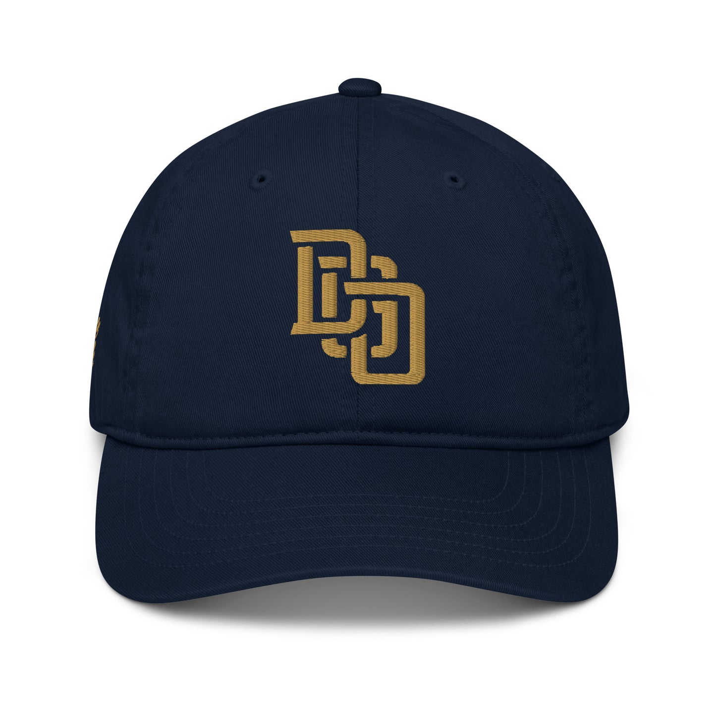 "DGO" Organic Baseball Cap | Econscious EC7000 | E Luna Brand PREMIUM Quadcrest 4 Old Gold Thread Logos: Front, Left, Right Signature & Back [3D Puff Edition]