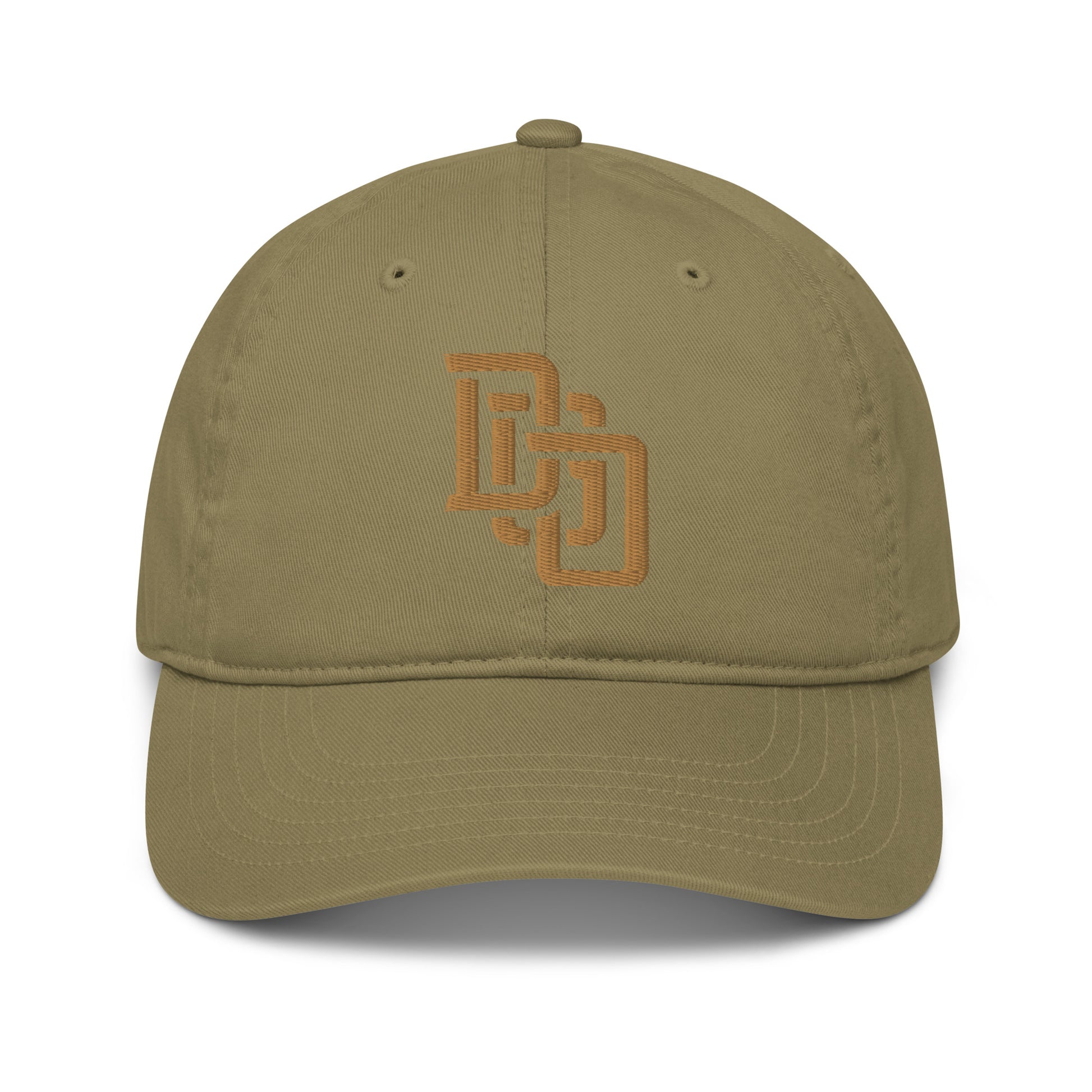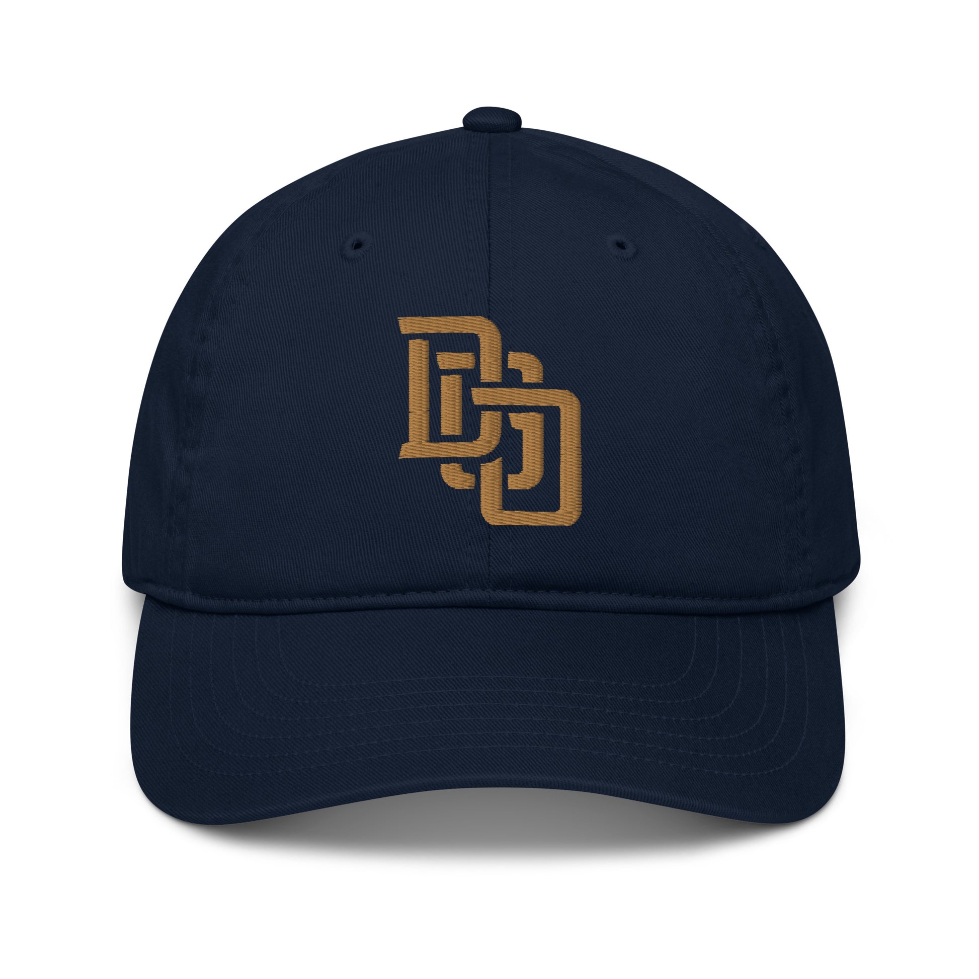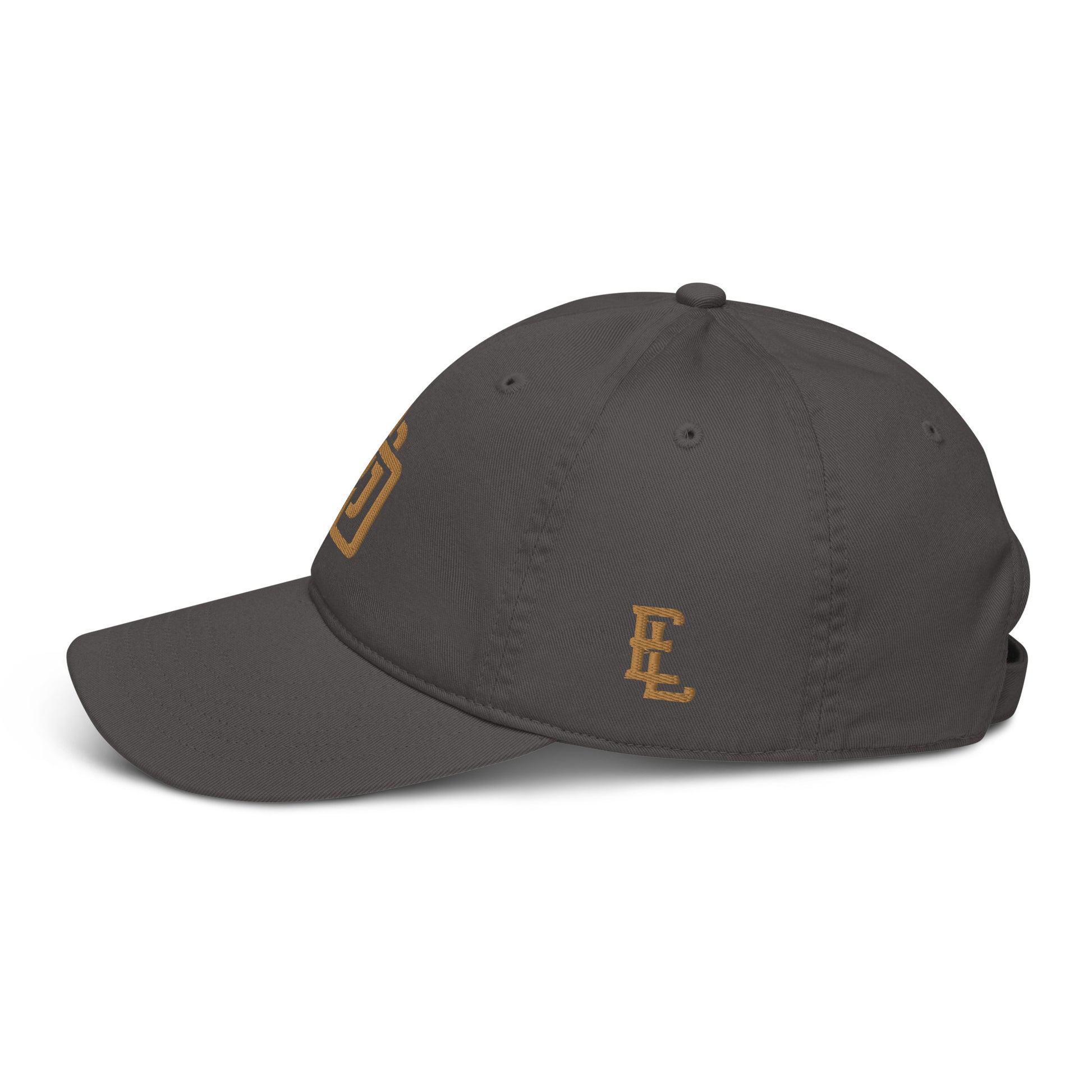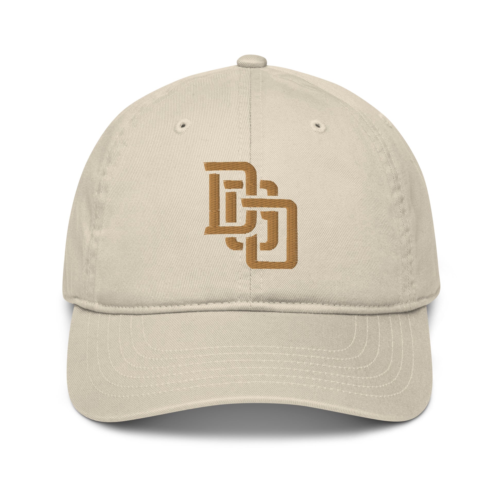 "DGO" Organic Baseball Cap | Econscious EC7000 | E Luna Brand ESSENTIAL Duocrest 2 Old Gold Thread Logos: Front & Left