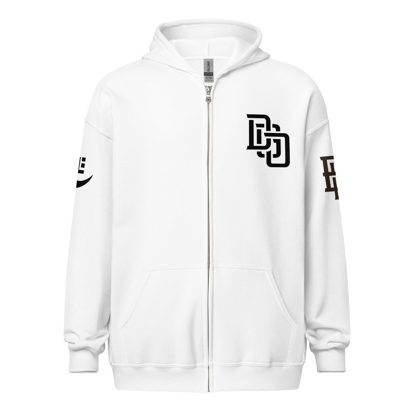 "DGO" Unisex Heavy Blend Zip Hoodie | Gildan 18600 | E Luna Brand LEGACY Quadcrest 4 Black Logos: Front Upper Left, Left/Right Arm & Back Signature (Large)