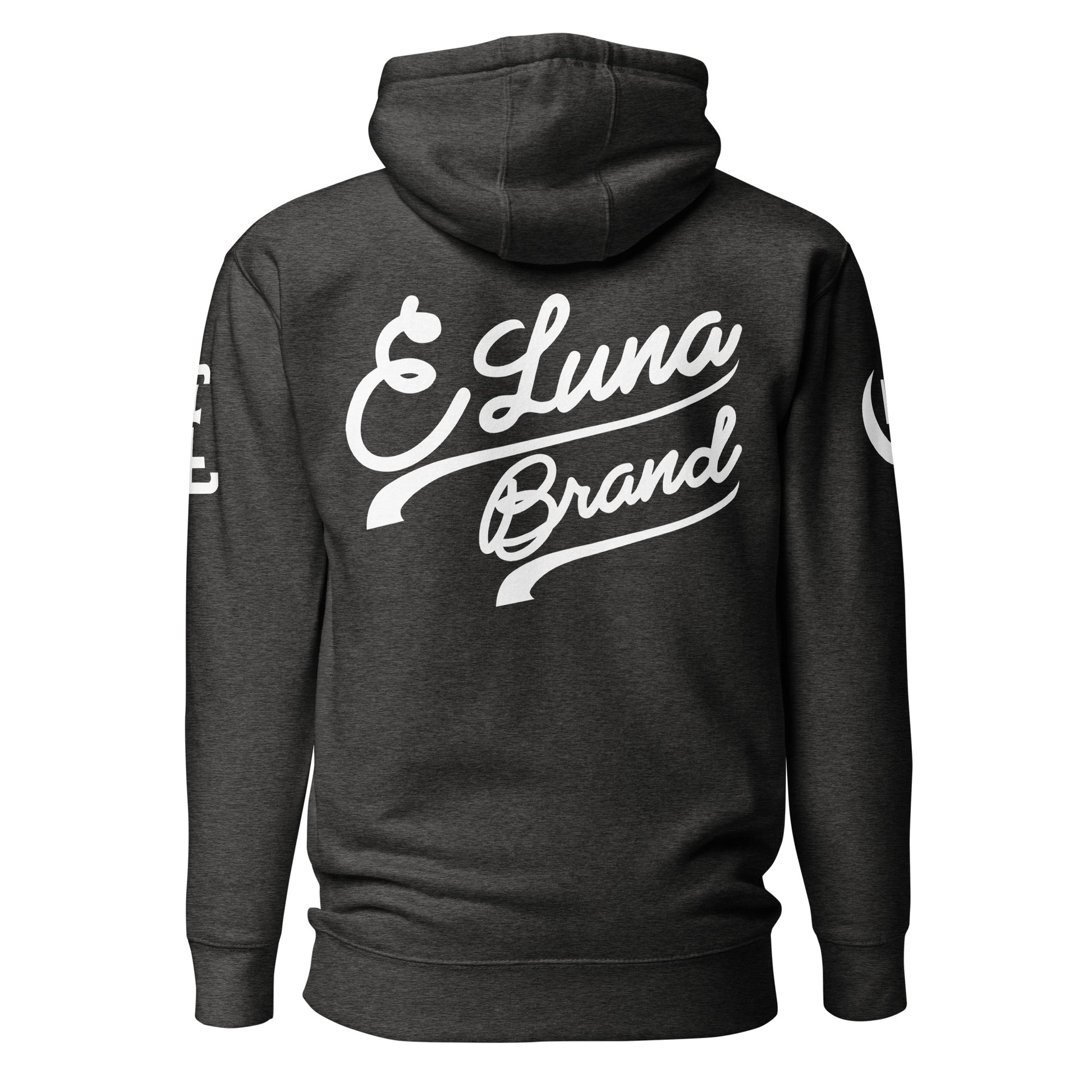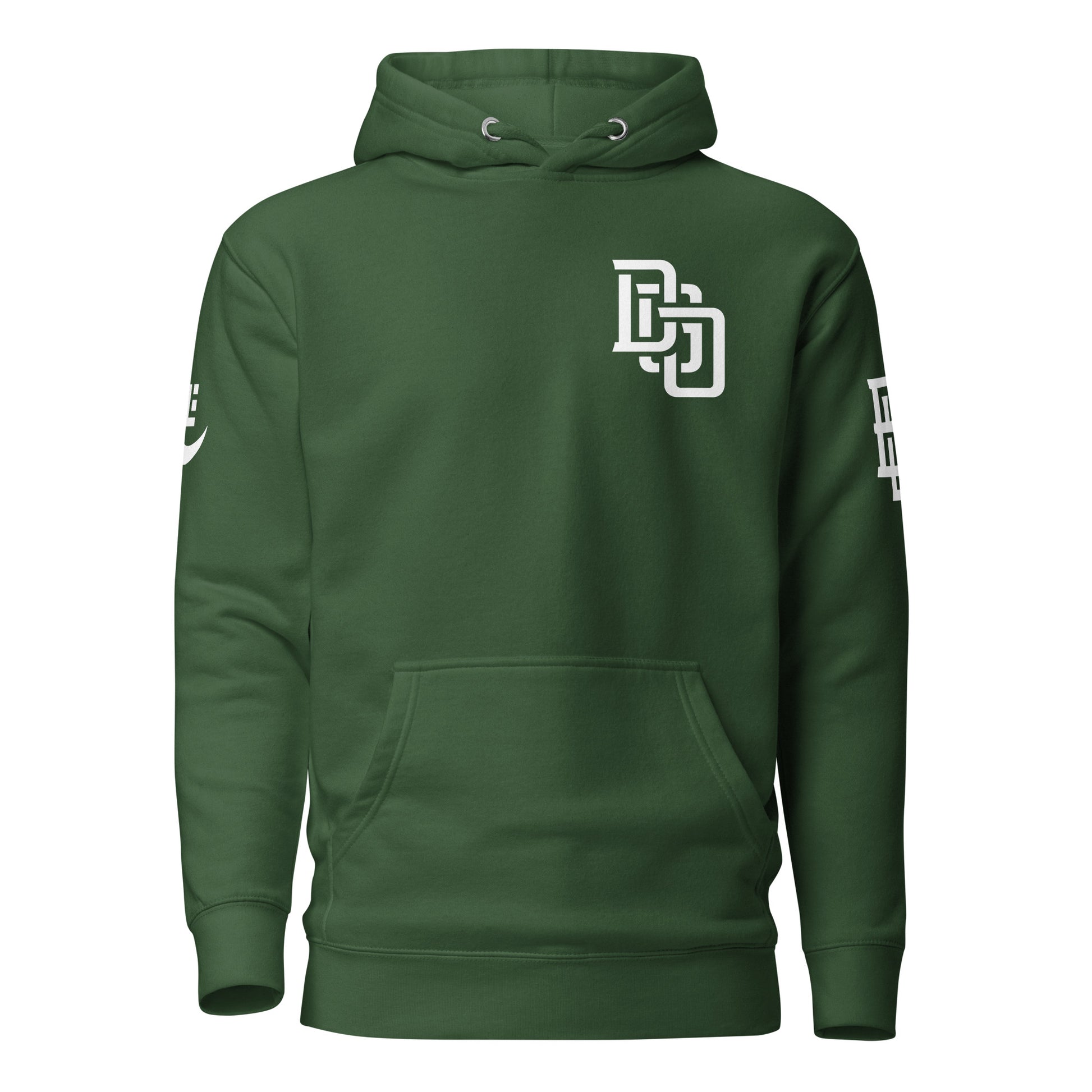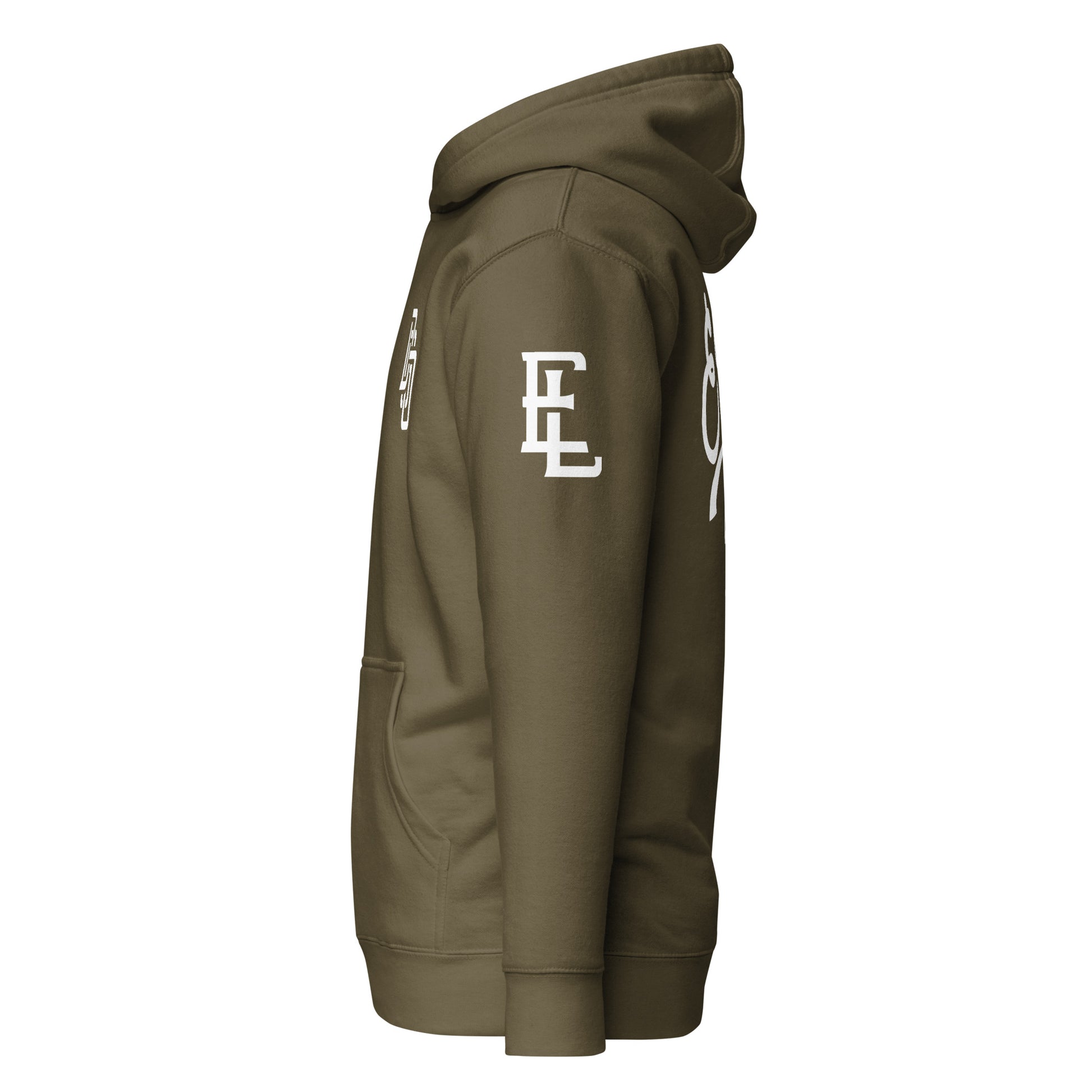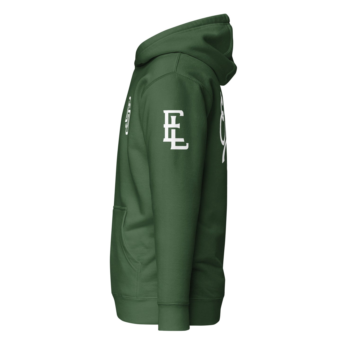 "DGO" Unisex Premium Hoodie | Cotton Heritage M2580 | E Luna Brand LEGACY Quadcrest 4 White Logos: Front Upper Left, Left/Right Arm & Back Signature (Large)