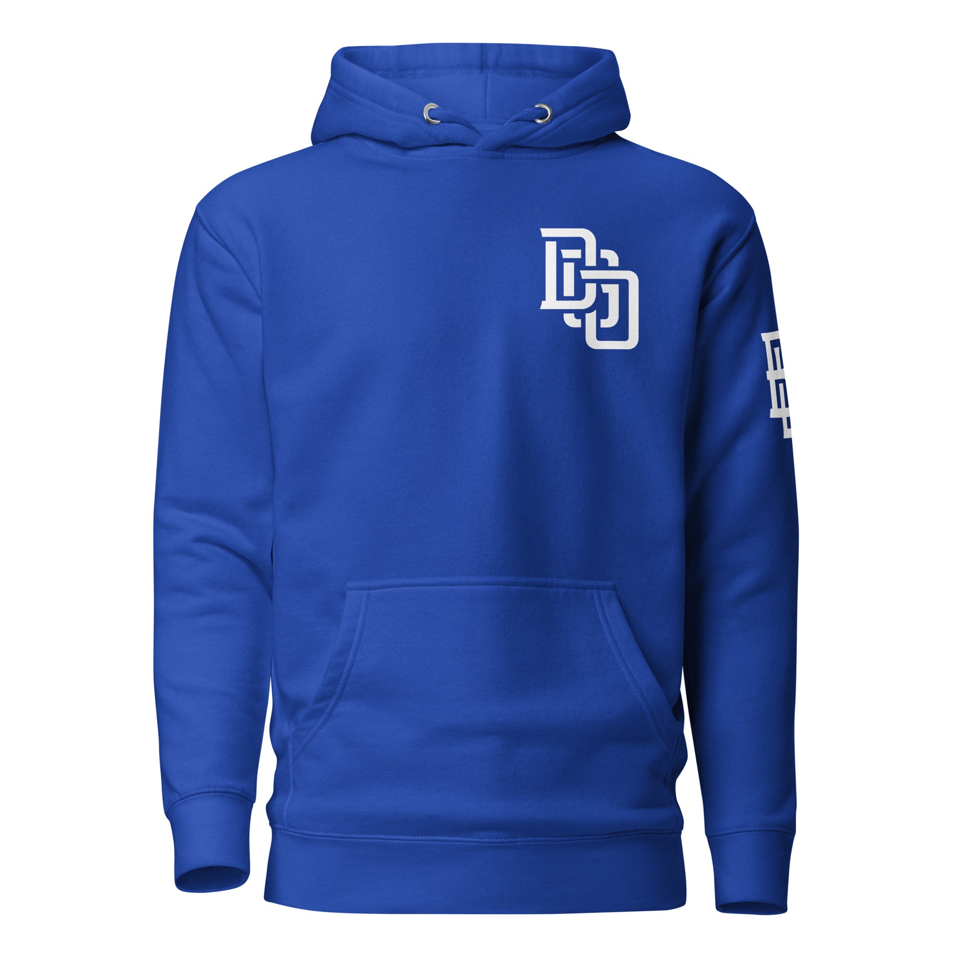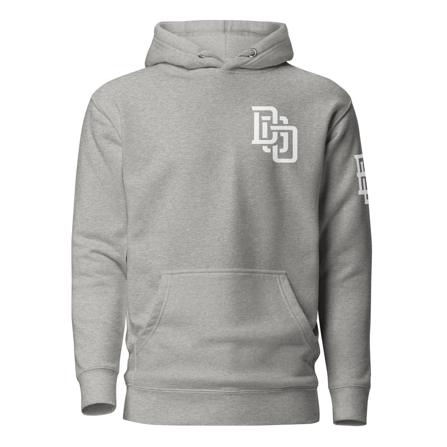 "DGO" Unisex Premium Hoodie | Cotton Heritage M2580 | E Luna Brand ESSENCE Tricrest 3 White Logos: Front Upper Left, Left Arm & Outside Back Label