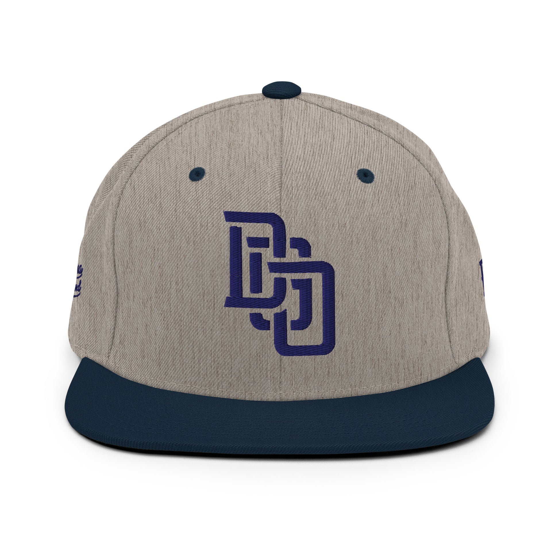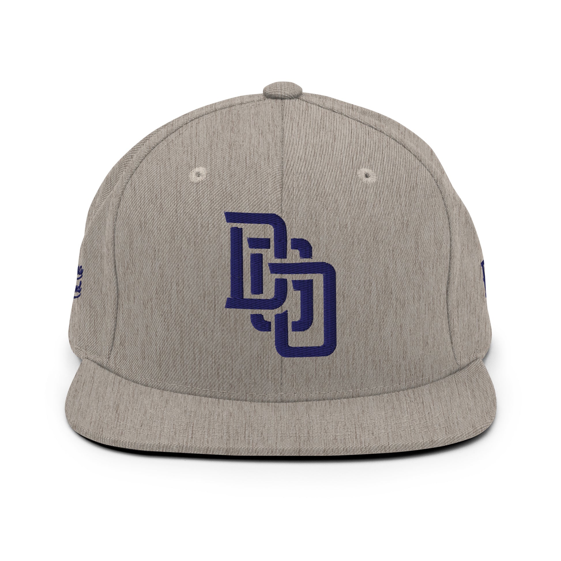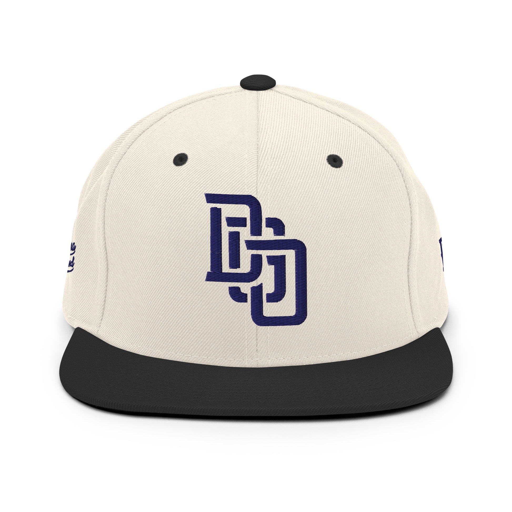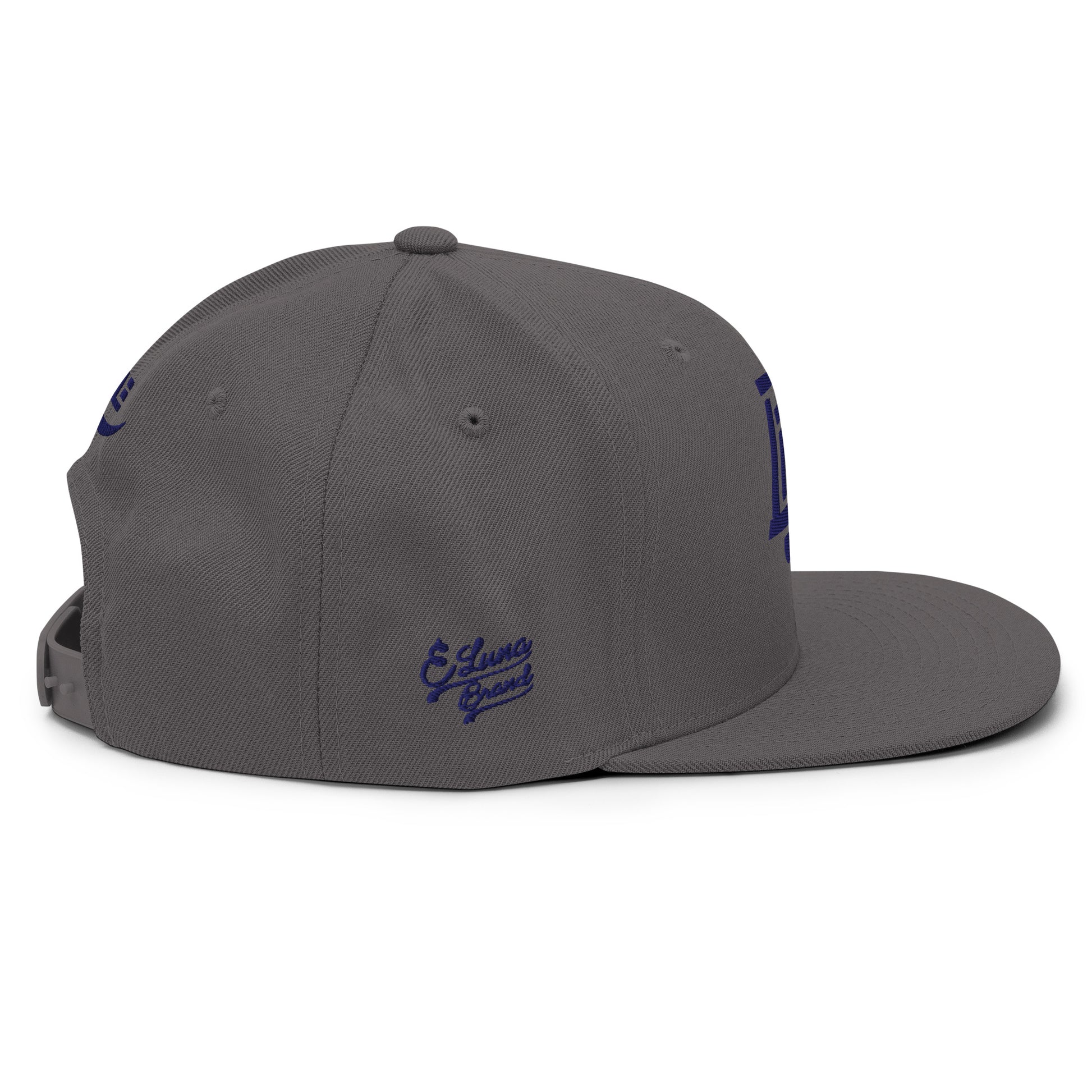 "DGO" Wool Blend Snapback Hat | Yupoong 6089M | E Luna Brand PREMIUM Quadcrest 4 Navy Thread Logos: Front, Left, Right Signature & Back [3D Puff Edition]