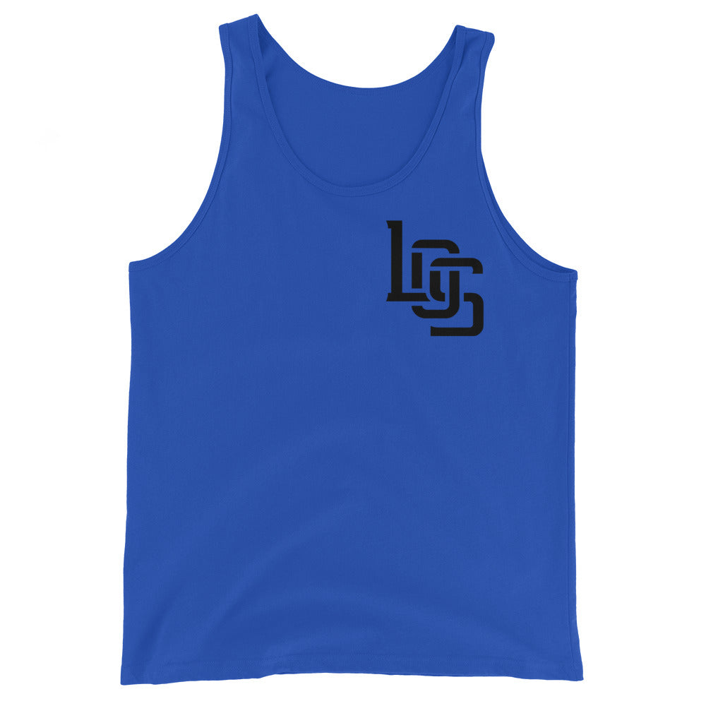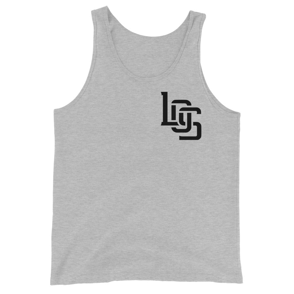 "LOS" Men’s Staple Tank Top | Bella + Canvas 3480 | E Luna Brand CHOICE Duocrest 2 Black Logos: Front Upper Left & Back (Large)